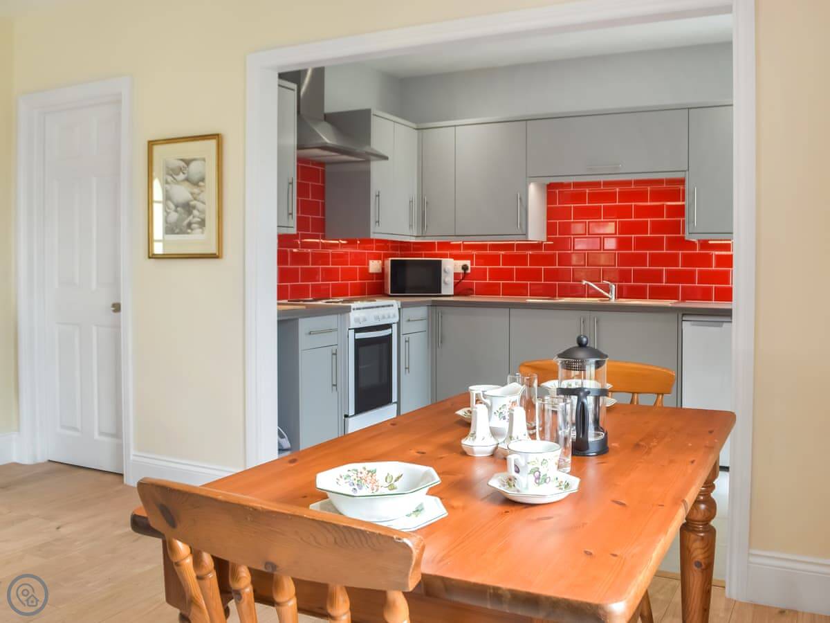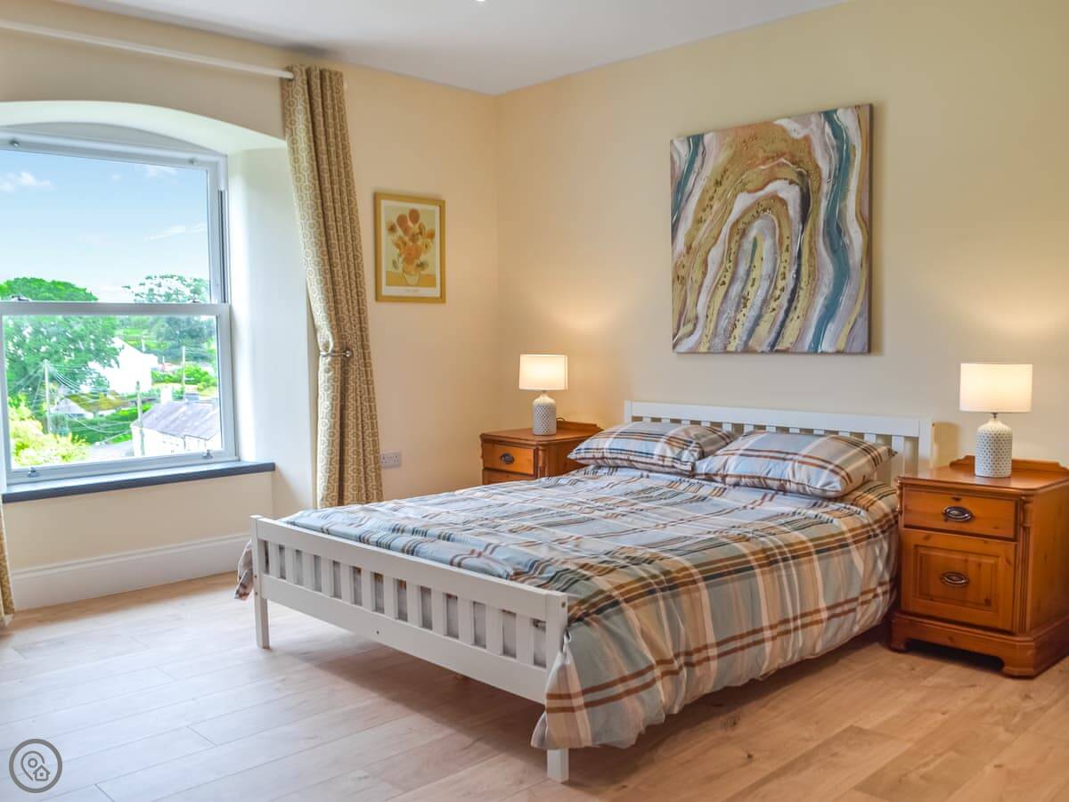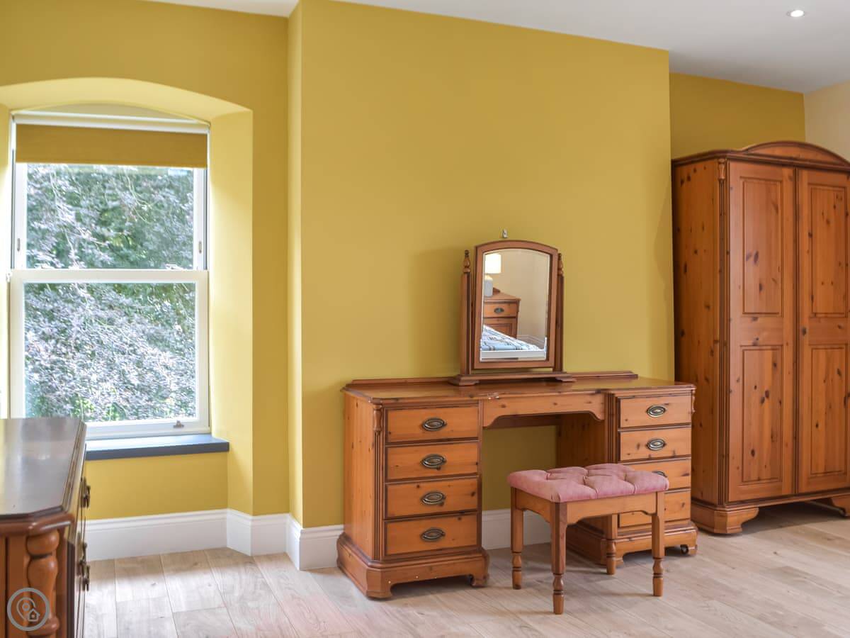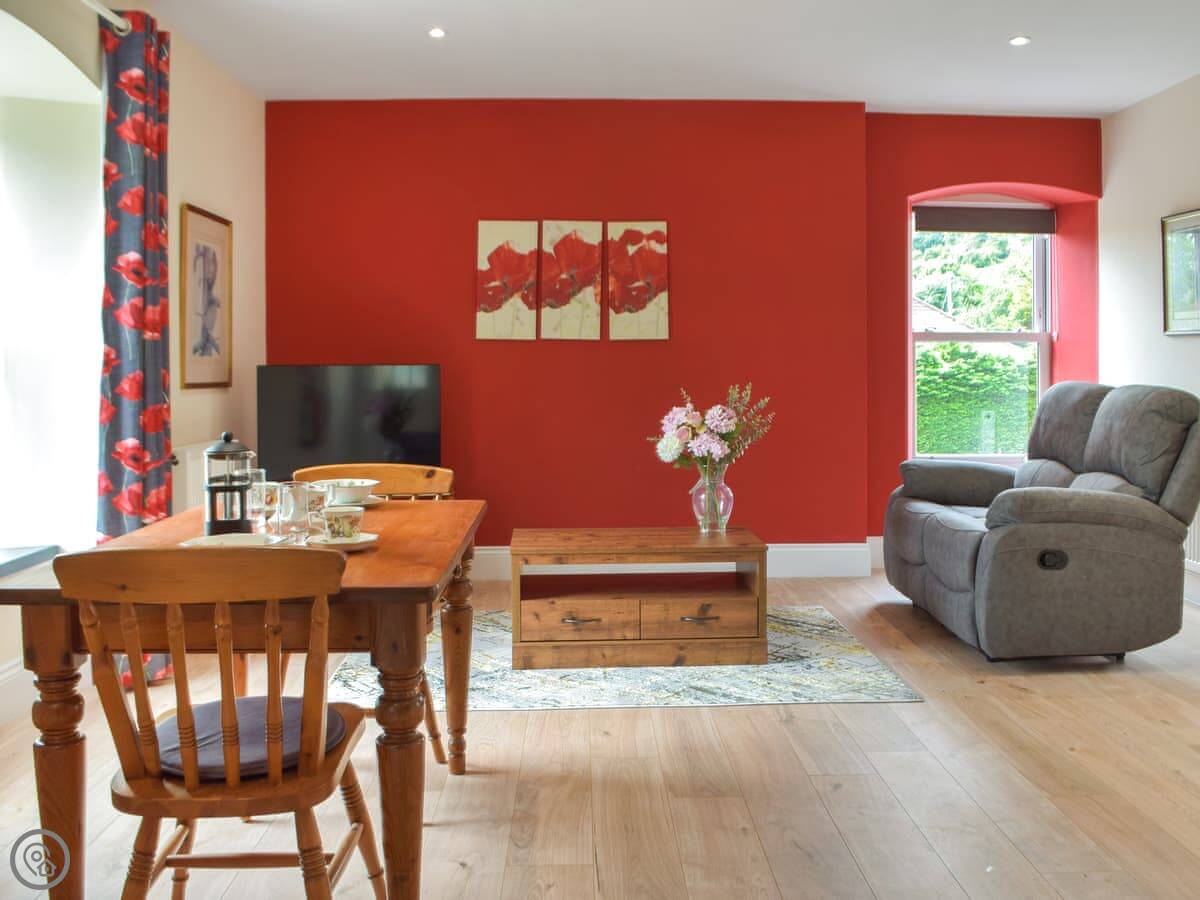The Rose of Sharon is one of five apartments in the old vicarage at Sannan Court, in Llanfynydd. It's a one-bedroom place, sleeps two. You get the apartment to yourselves, but you share the big front and side lawns with other guests if they're around. It's very quiet here.