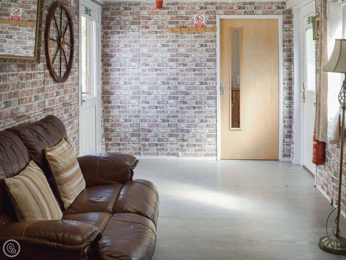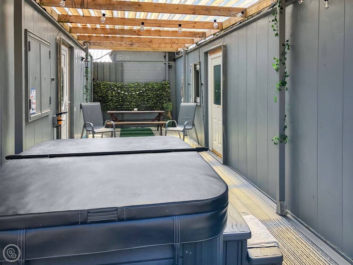 Outside, there's a private patio with seating and a barbecue. The hot tub is there too. There's another raised seating area that looks out over the fields. You're on a working farm, so you'll see sheep and tractors about.
