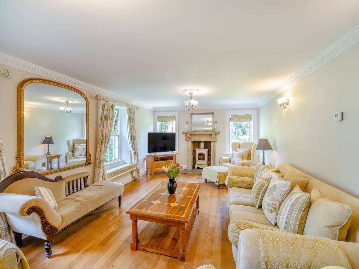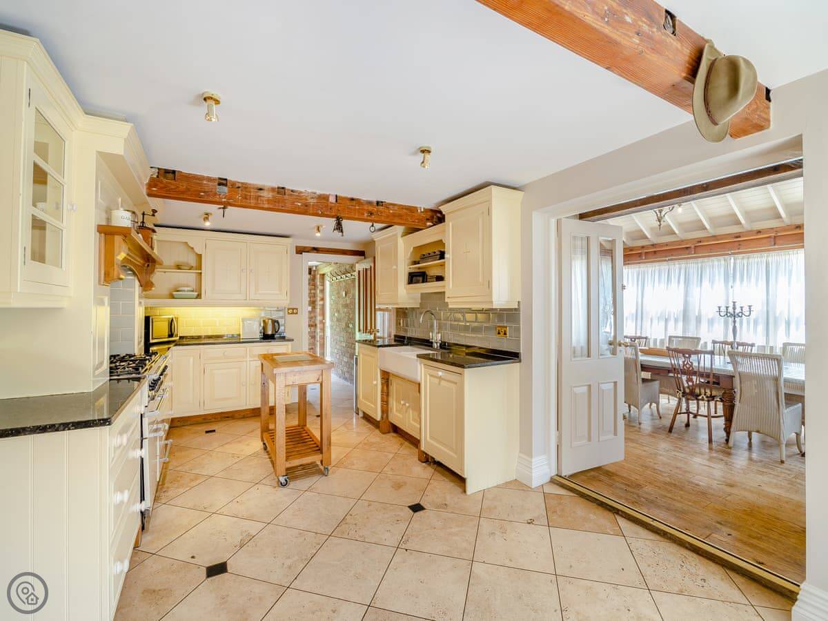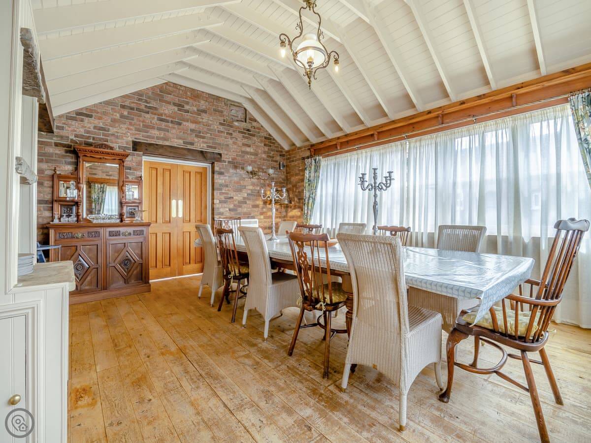 The kitchen has a double range cooker. The dining room has a high vaulted ceiling. There's a large main living room with a wood burner and TV, plus a smaller snug room if people want to split up. Outside, there's an enclosed garden and a hot tub.