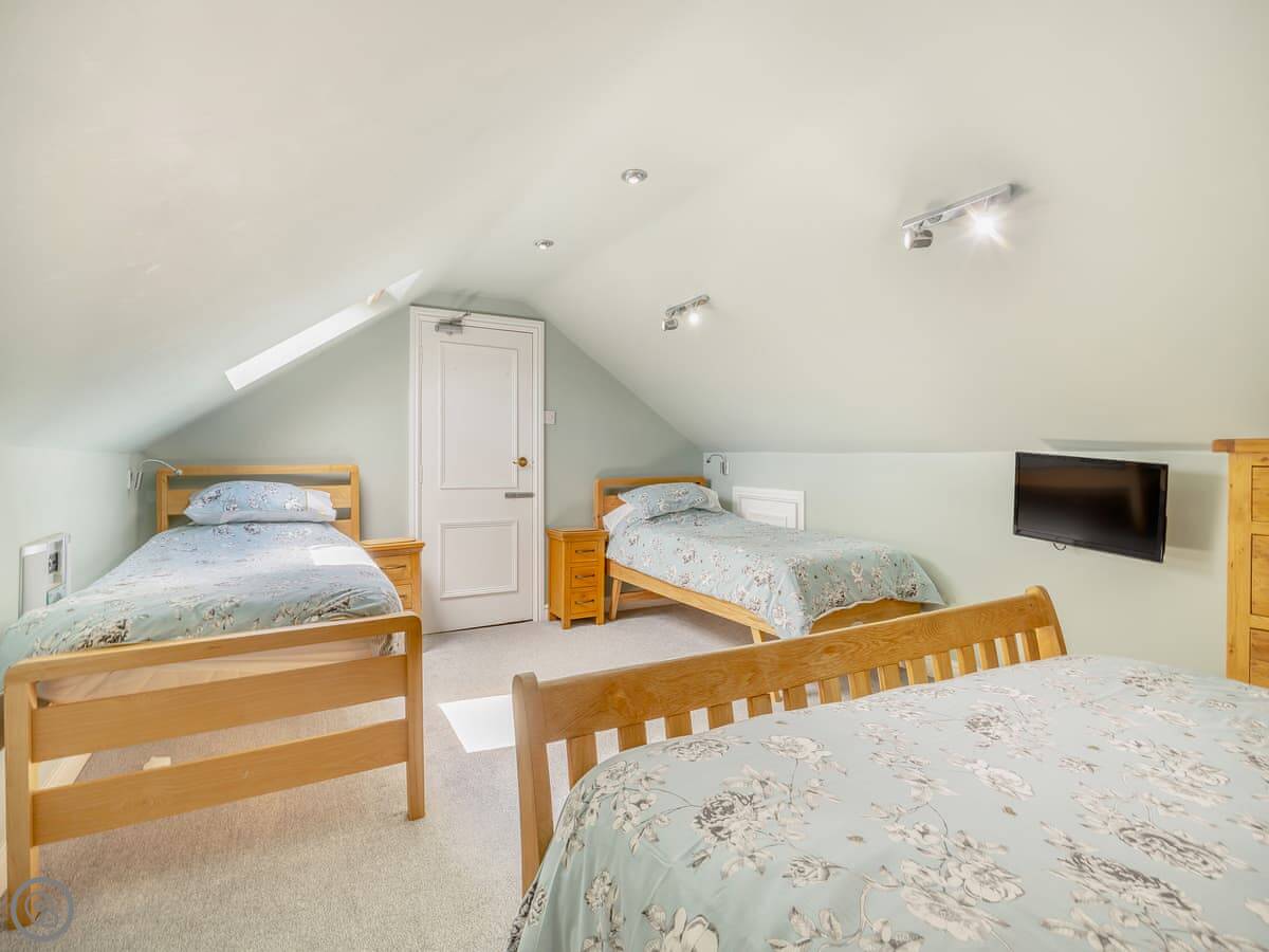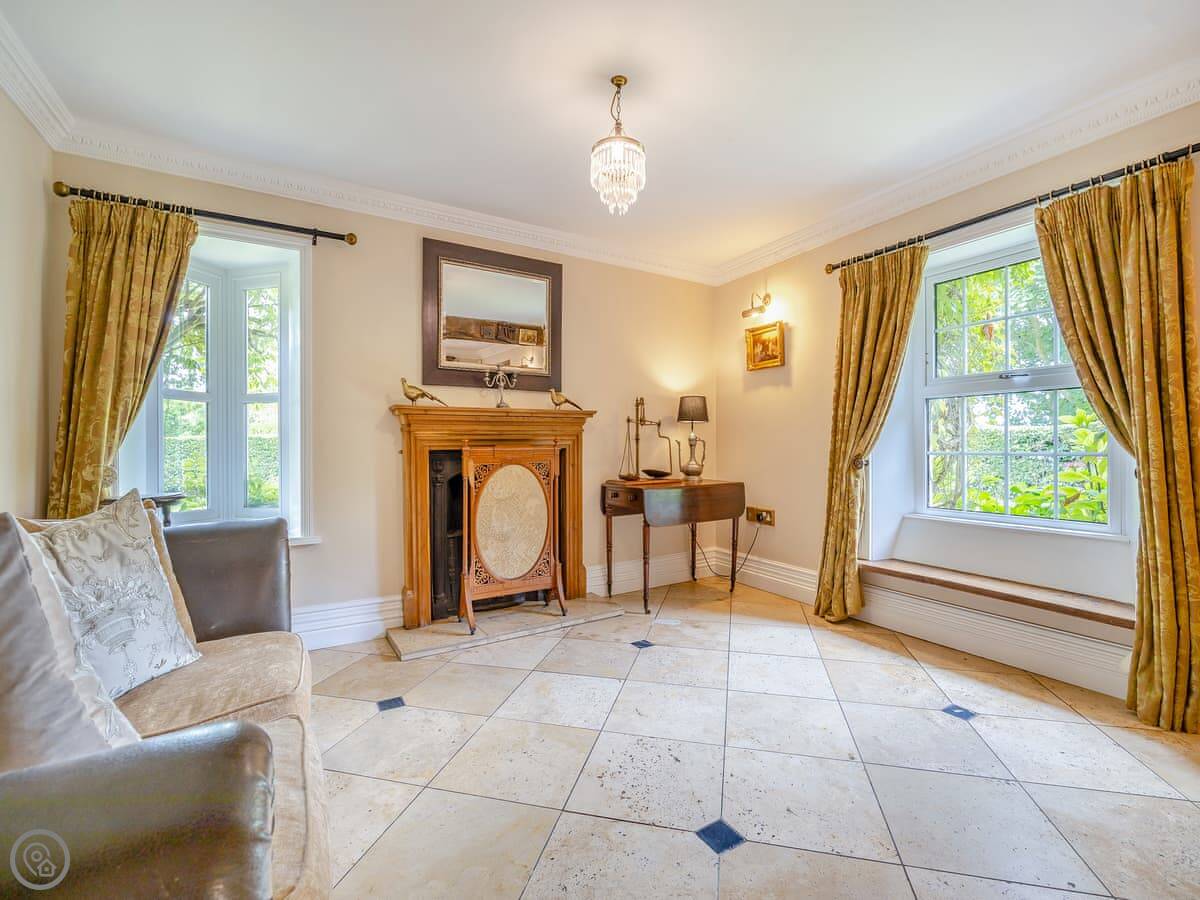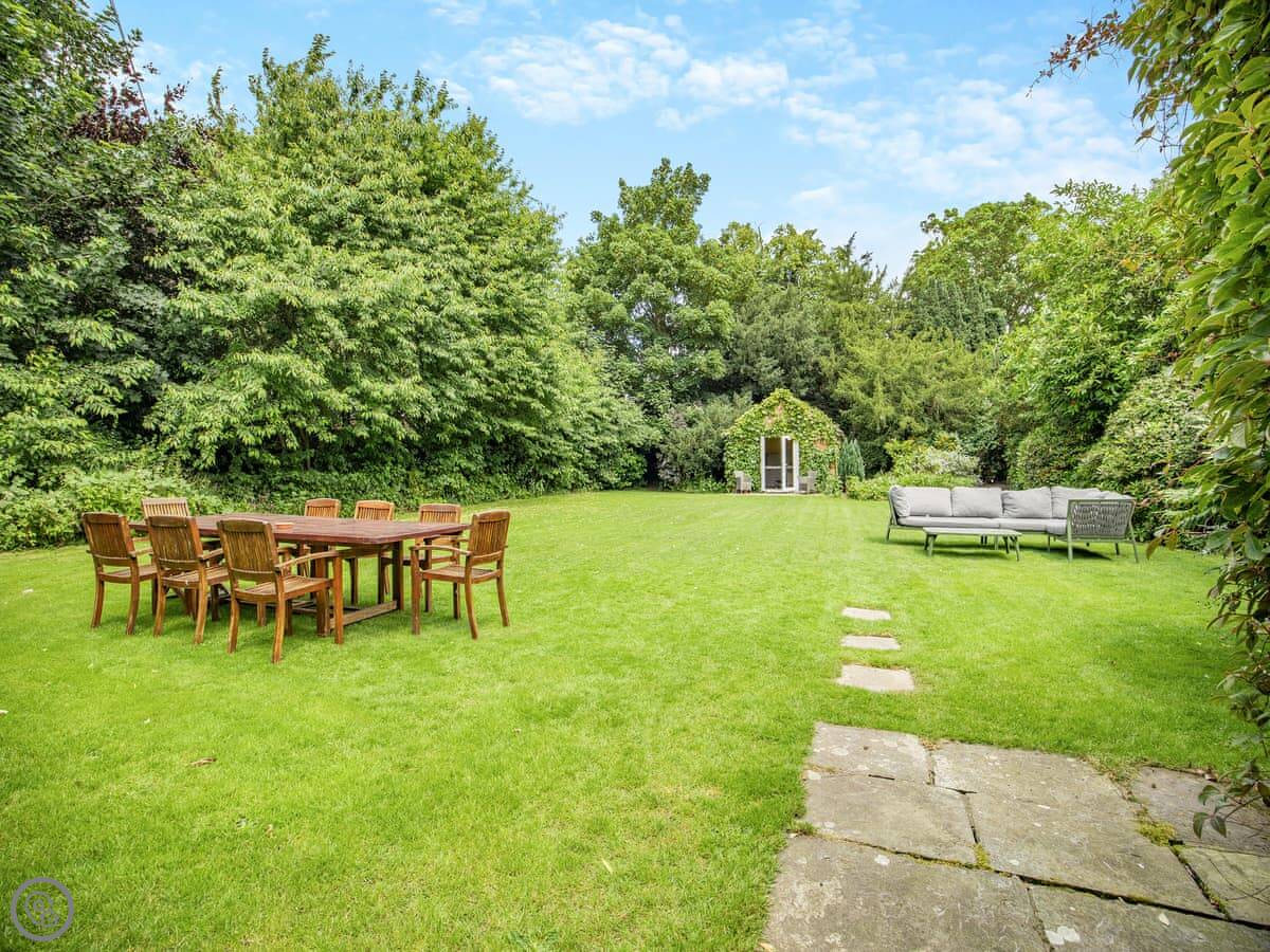 The kitchen has a double range cooker. The dining room has a high vaulted ceiling. There's a large main living room with a wood burner and TV, plus a smaller snug room if people want to split up. Outside, there's an enclosed garden and a hot tub.