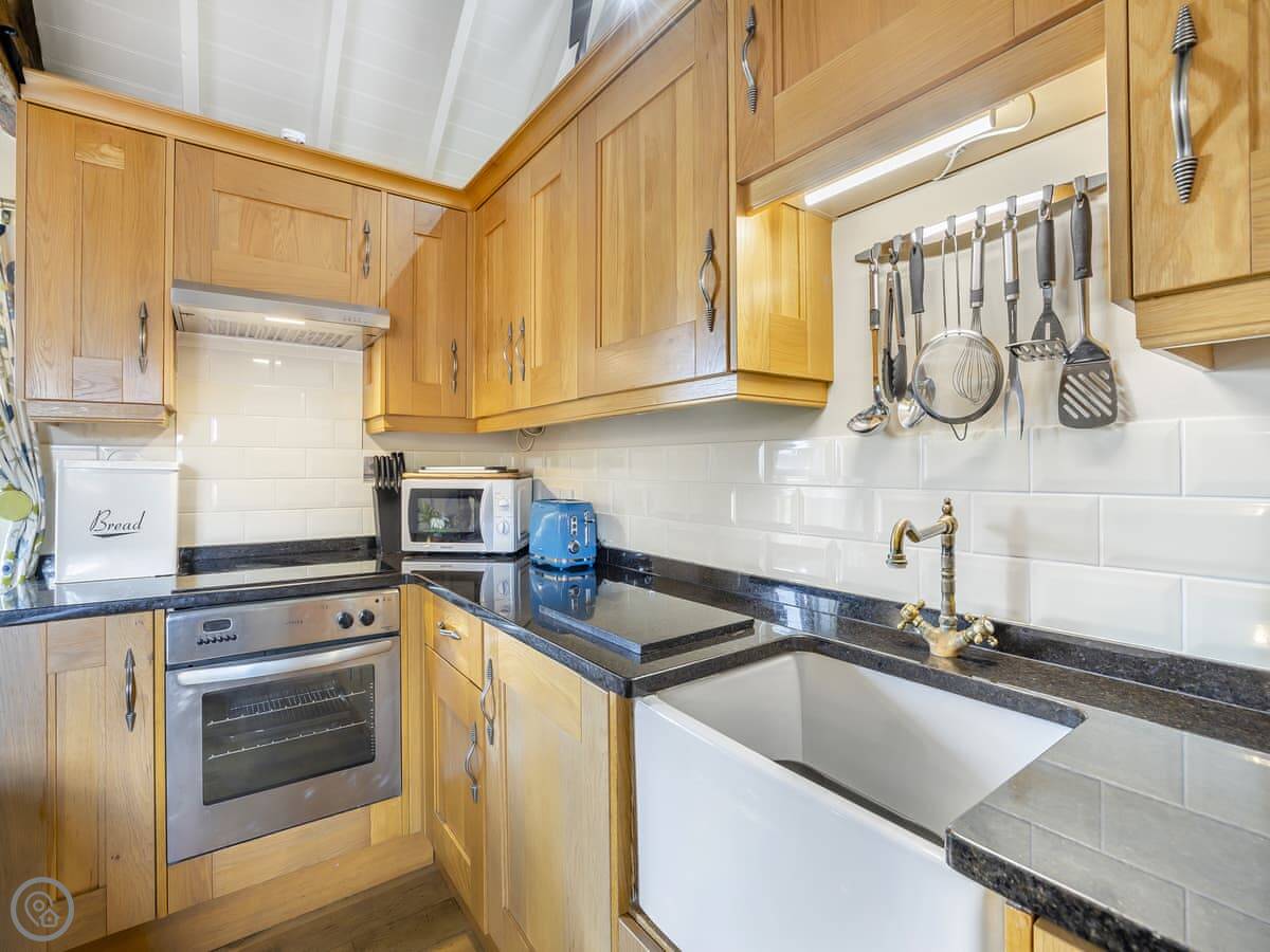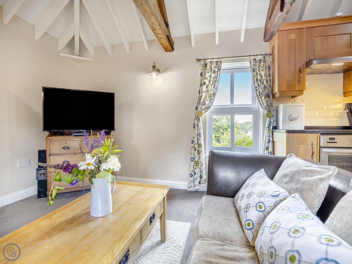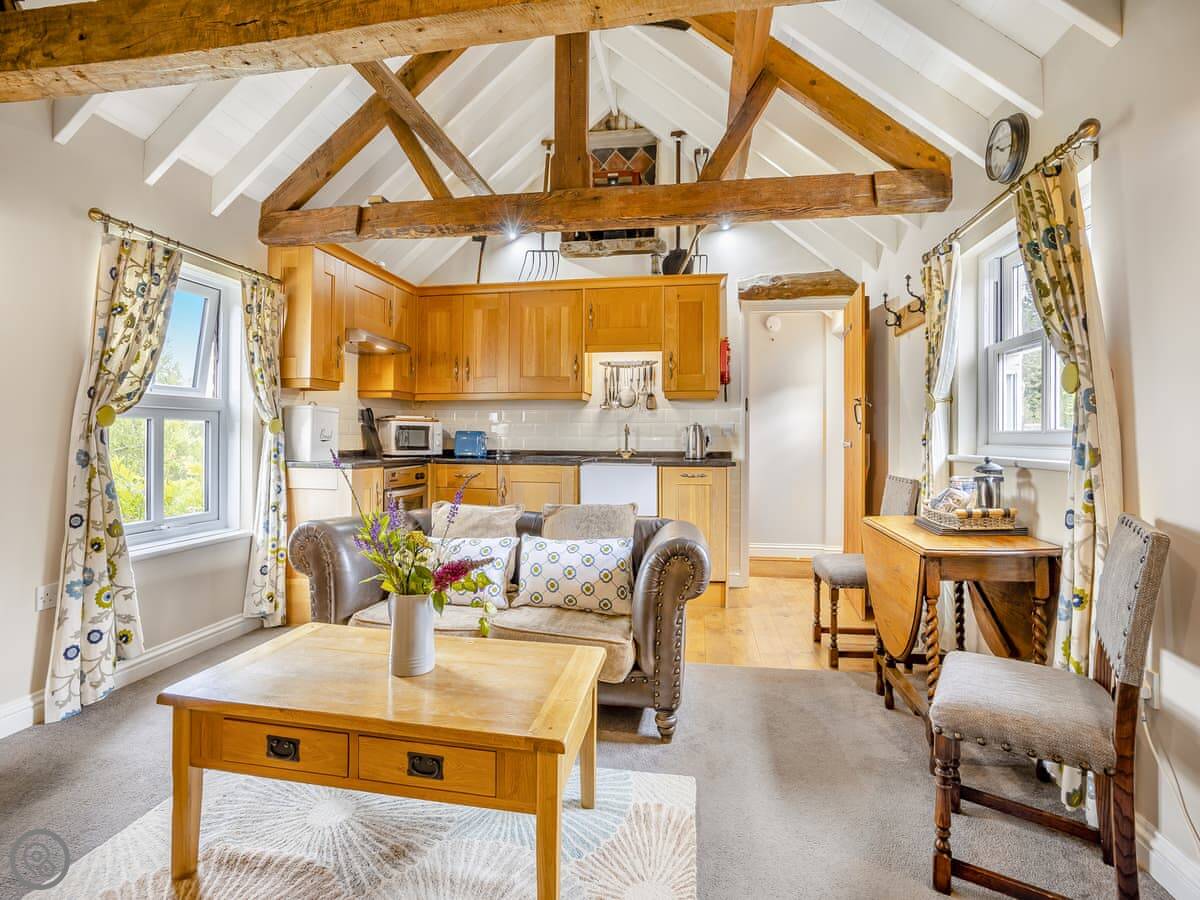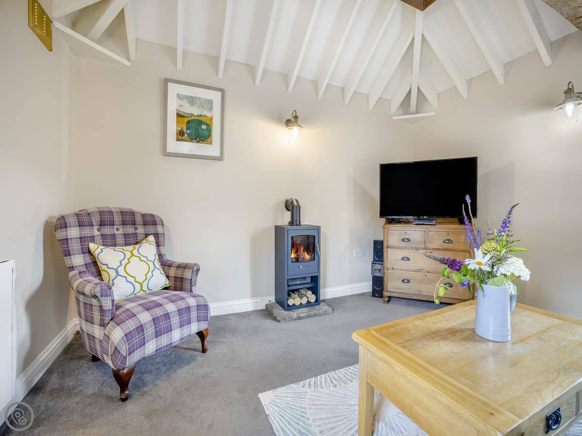 Inside, it's one room really, with the living area and kitchenette together, and a separate bedroom and bathroom off it. The main thing is the view. It's over the fields, nothing in the way. You can sit and watch the weather come in.