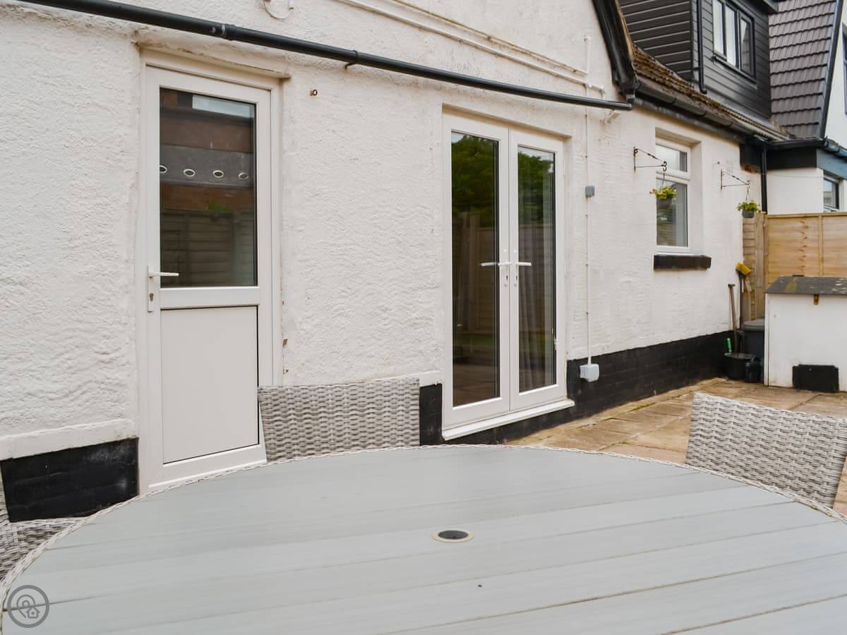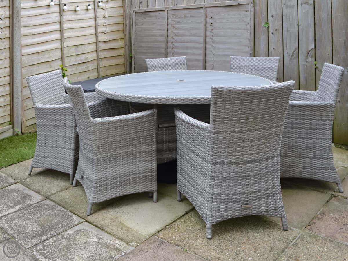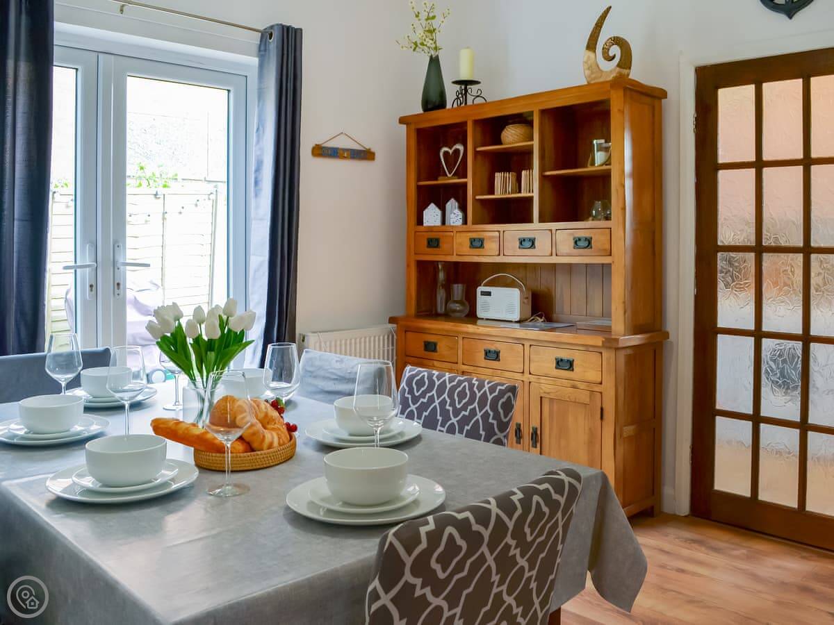 The living room has an open fire. We leave some logs for you to get started. The dining room has French doors out to a small enclosed patio garden. It’s paved, with a table and chairs. There’s a washing machine and a dishwasher in the kitchen.