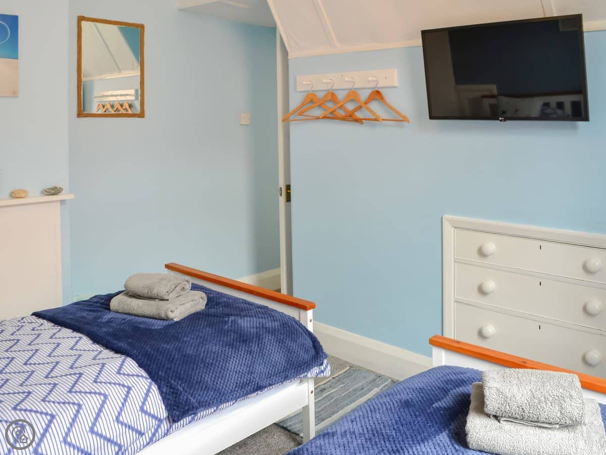 You’ve got three bedrooms. One of them is downstairs, which is a double with its own TV. The other two are upstairs, one double and one twin, and they’ve got TVs too. There are two bathrooms. One is a shower room downstairs, and there’s a family bathroom upstairs with a bath and a shower over it.