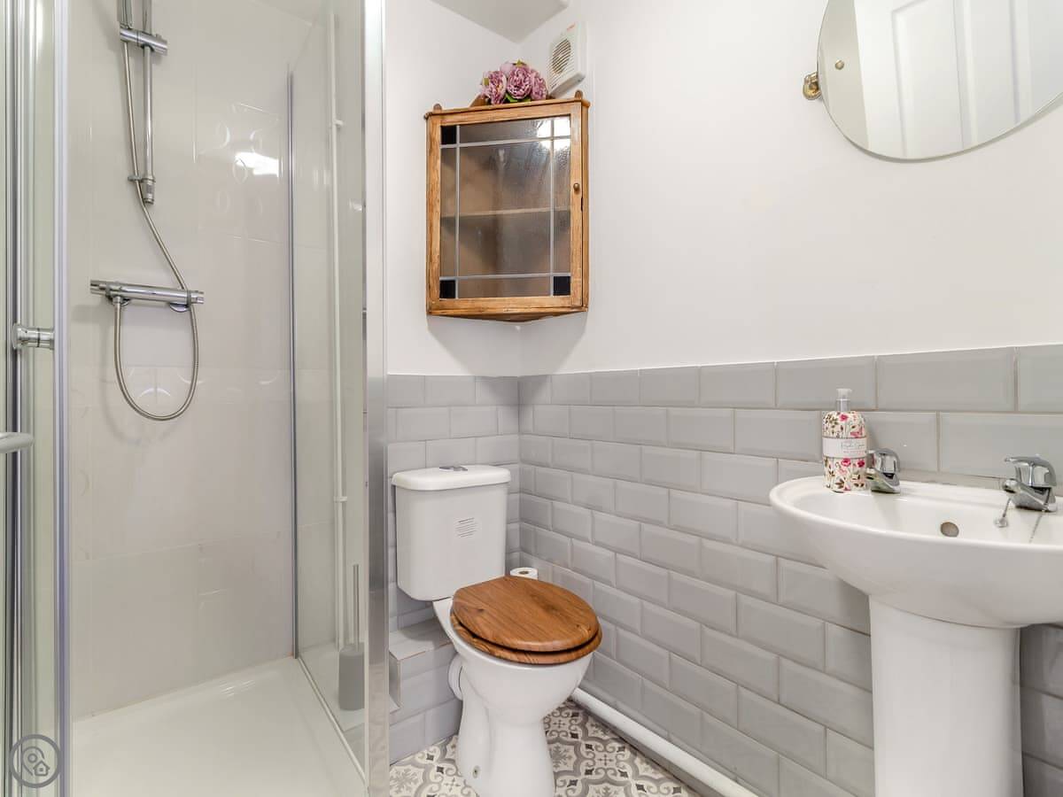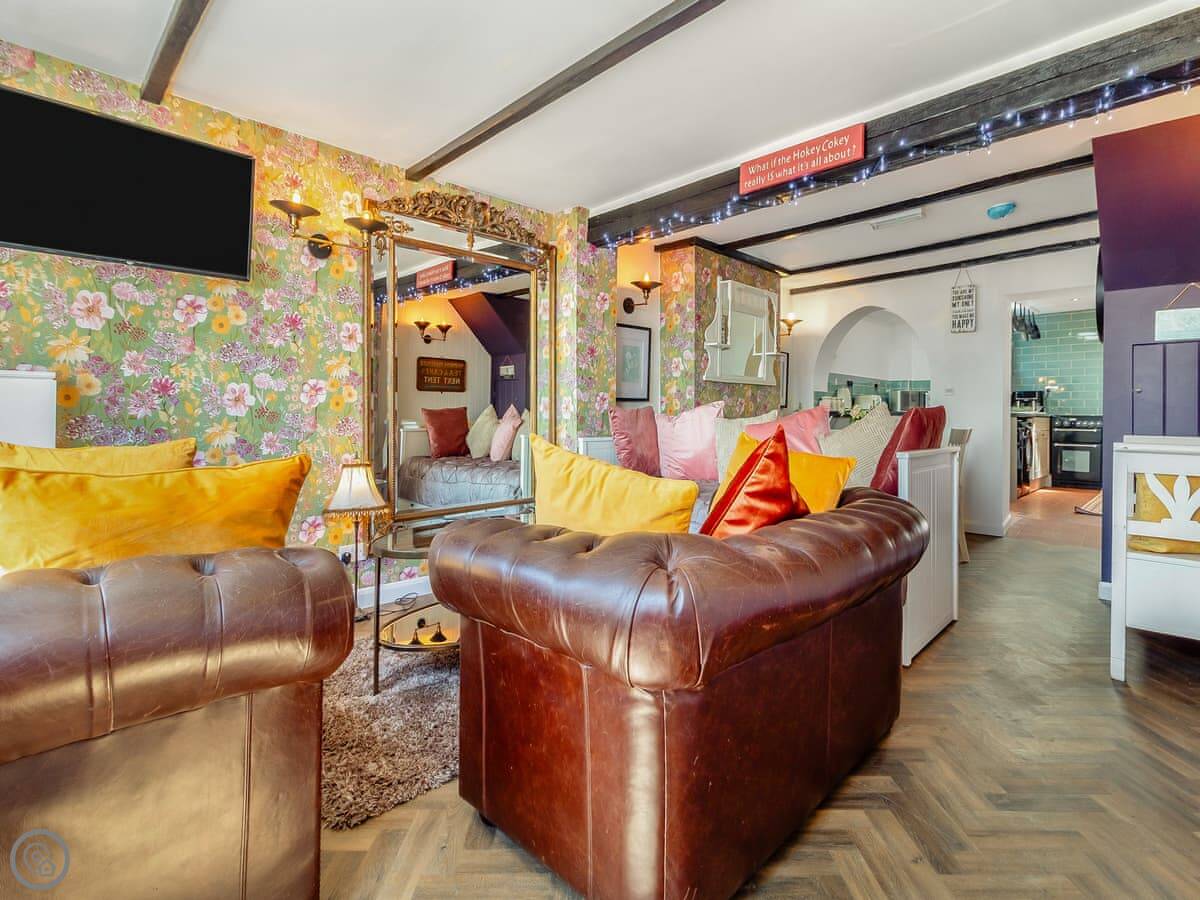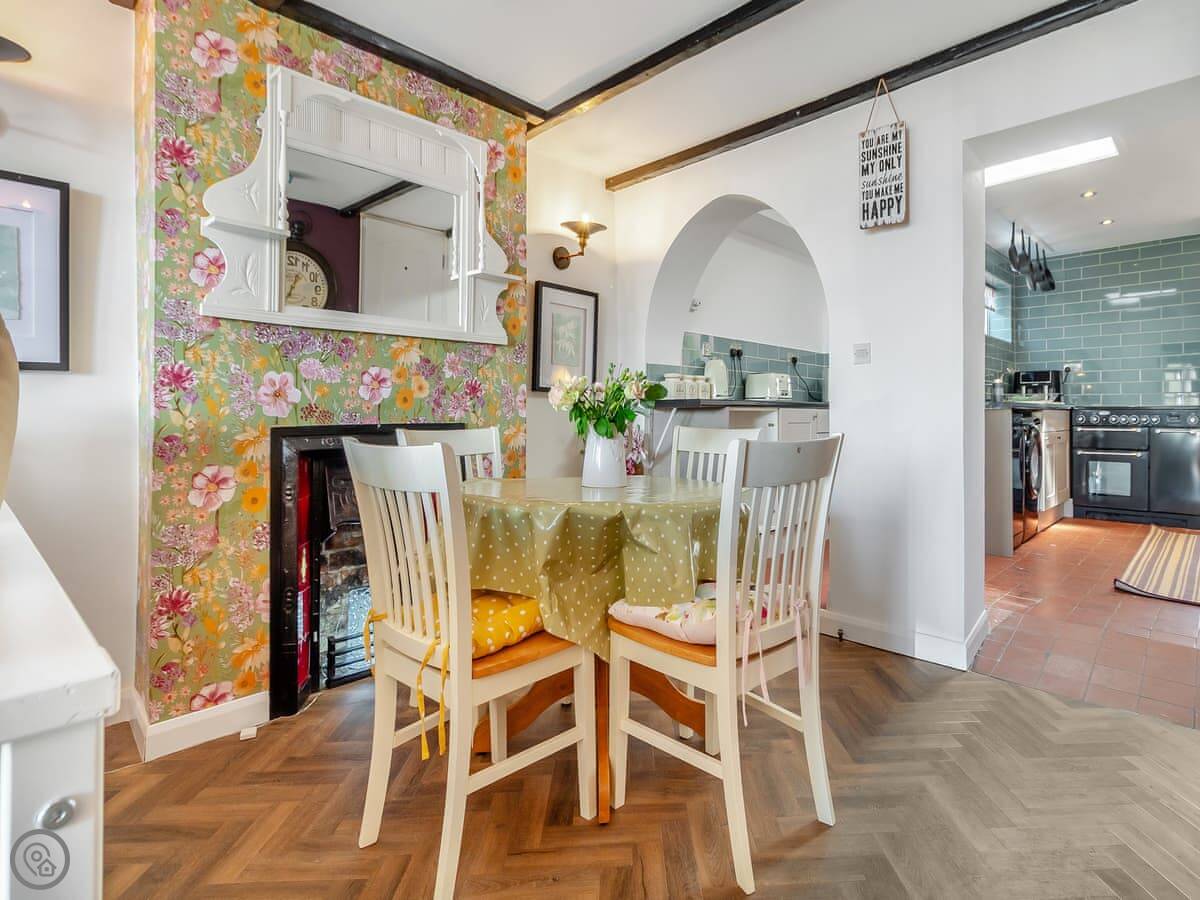 It sleeps four people. There are two bedrooms and two bathrooms, which is useful. You can bring one dog. It's got a 4 Star rating, so it's well equipped and comfortable. The living space is open plan. There's a wood burner in the sitting area for cooler evenings.