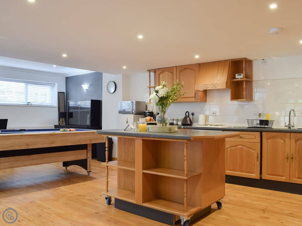The main room is open plan. Kitchen, dining table, sitting area. The french doors open onto a deck. We've put in some things to do, like a pool table, table tennis, a dartboard and an old Nintendo Wii. It's not a proper games room, it's just stuff in the corner of the living area.