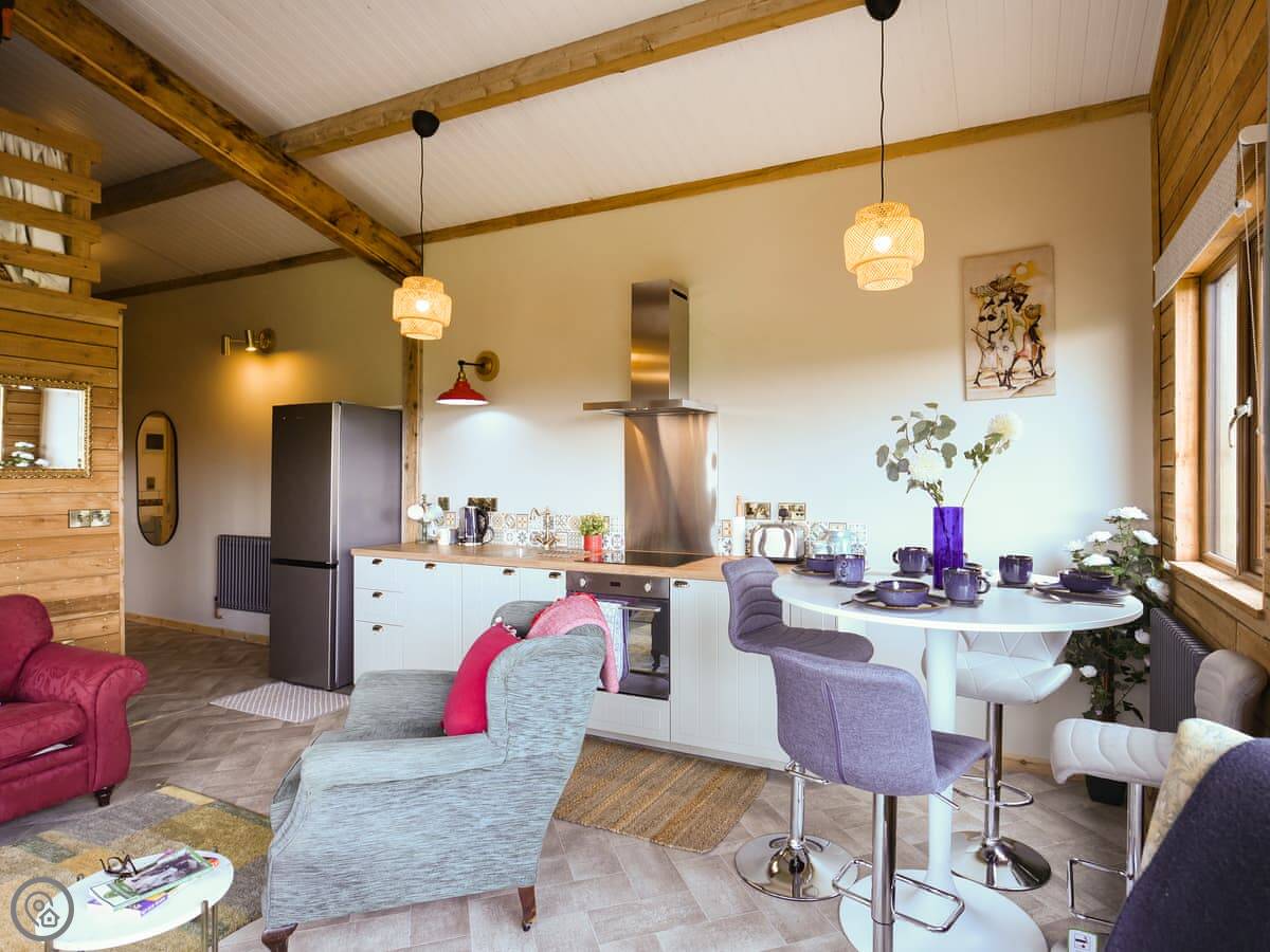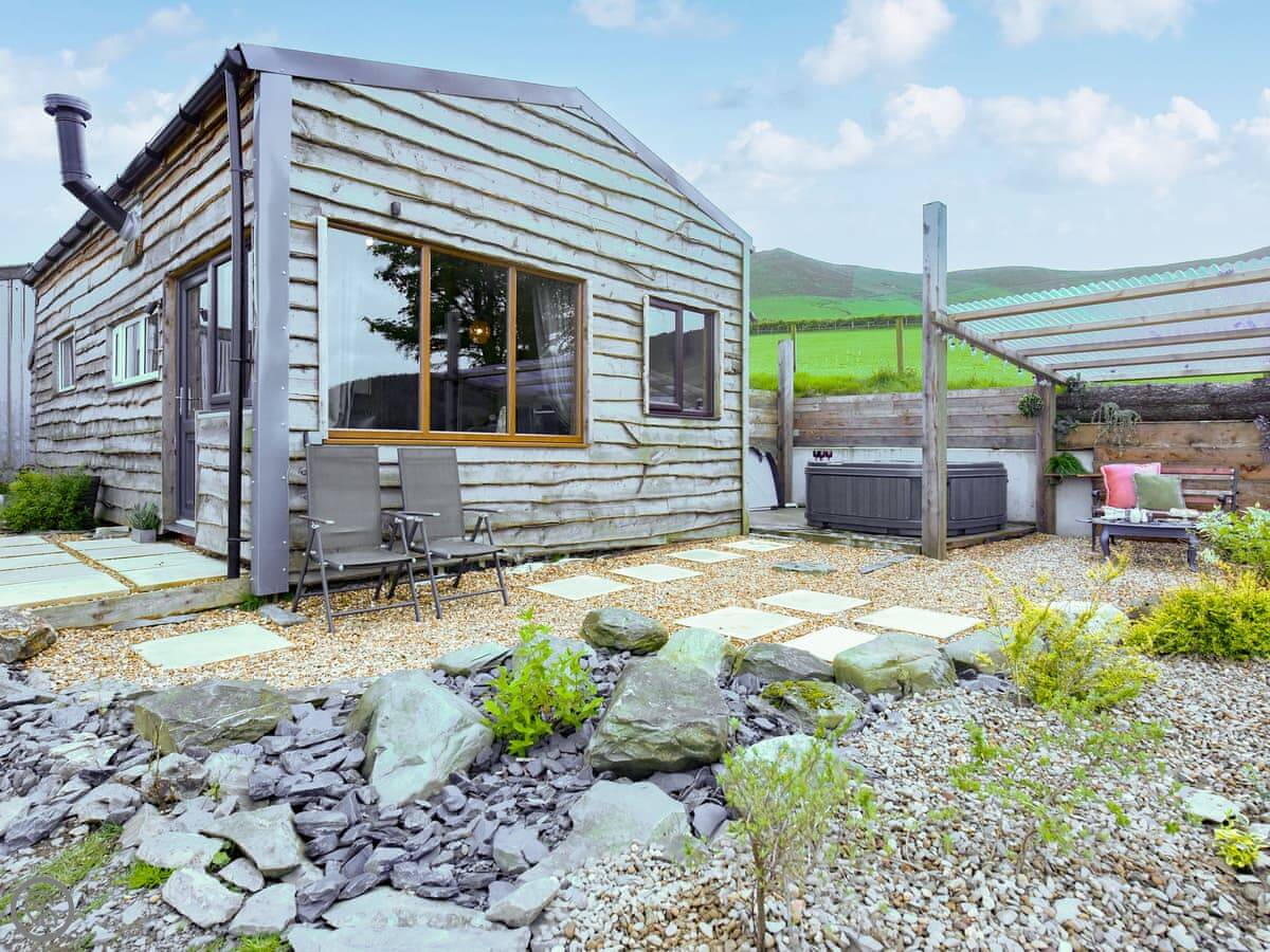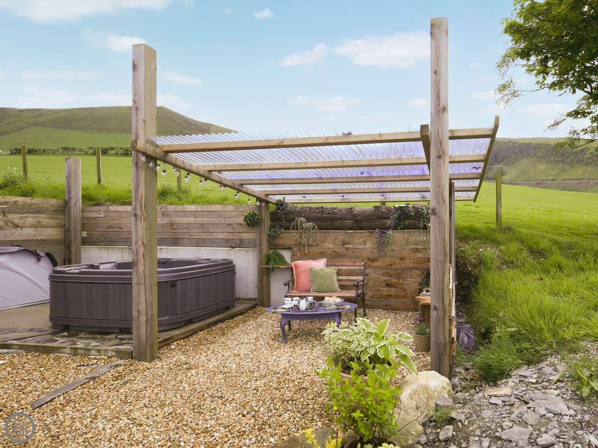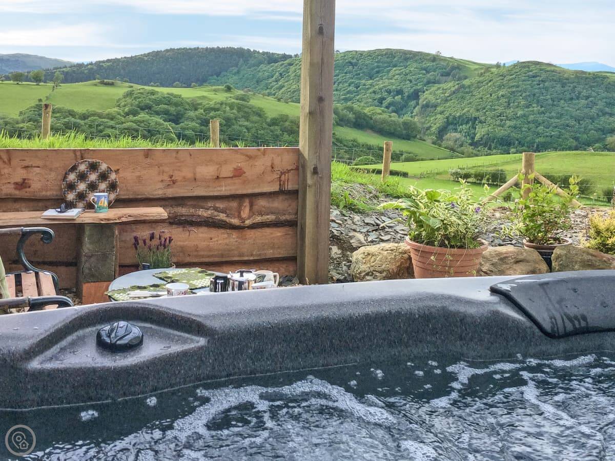It's on a working farm, so you'll see sheep and sometimes farm vehicles. You have your own veranda and garden area. The hot tub is there, ready for you when you arrive. It's a good spot for it, looking out. There's a wood burner for colder nights, and the heating works fine. Everything's included, bedding and towels too. You can bring one dog.