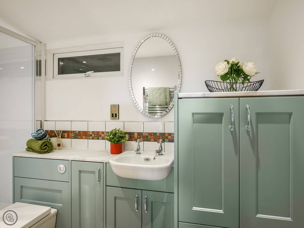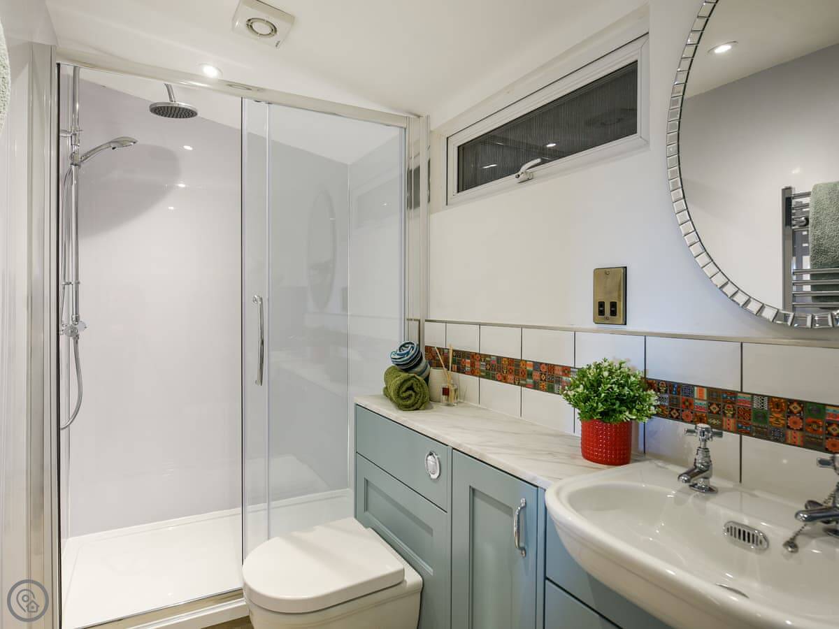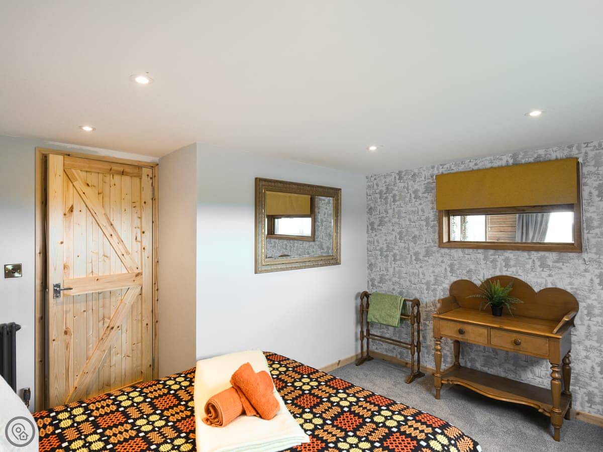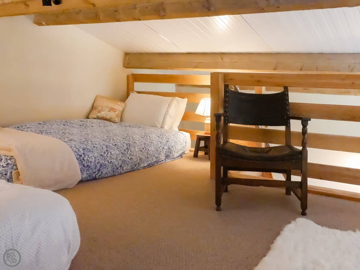 It sleeps two people. There are two bedrooms, one double downstairs and a twin up in the loft. The loft space is a proper room, but you get to it via a staircase that's a bit steeper and narrower than a normal one. Just so you know. There's one bathroom with a double shower. It's got a 4 Star rating.