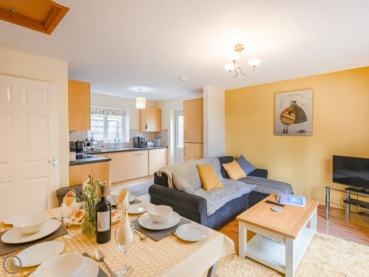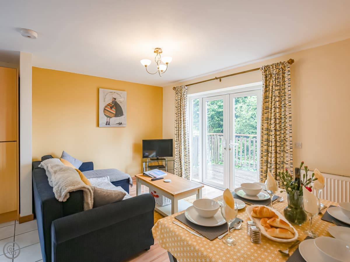 The main living space is open plan. Kitchen, dining area, and lounge all together. The kitchen has a dishwasher and a washing machine. There's a foldaway table for meals. Patio doors lead out to a terrace which is enclosed. You get the morning sun out there. The view is over the estuary and the woods, it's very peaceful.