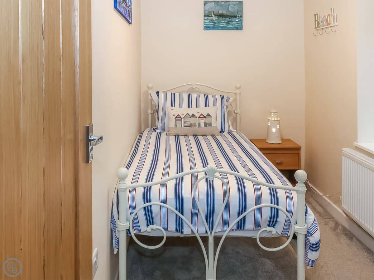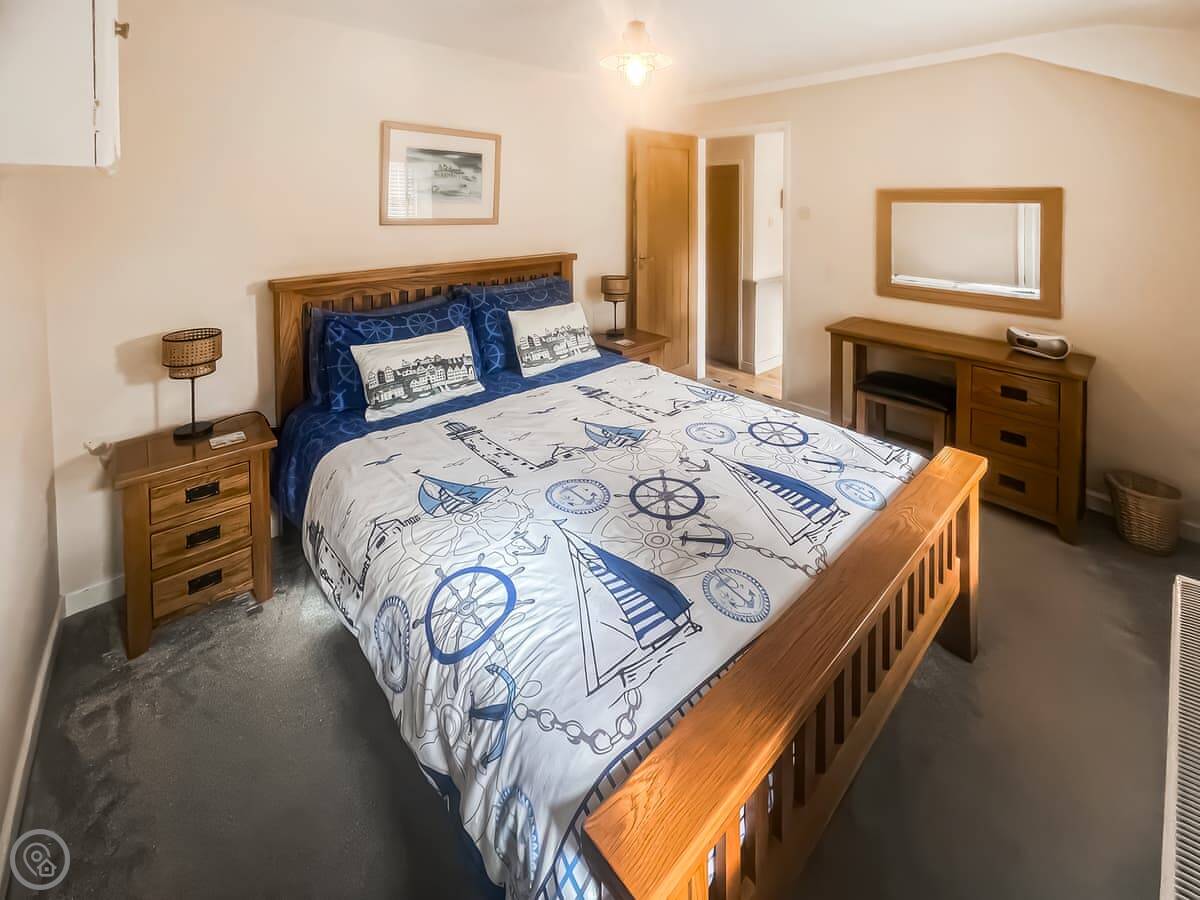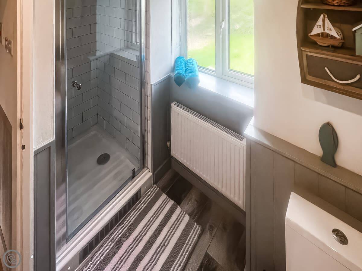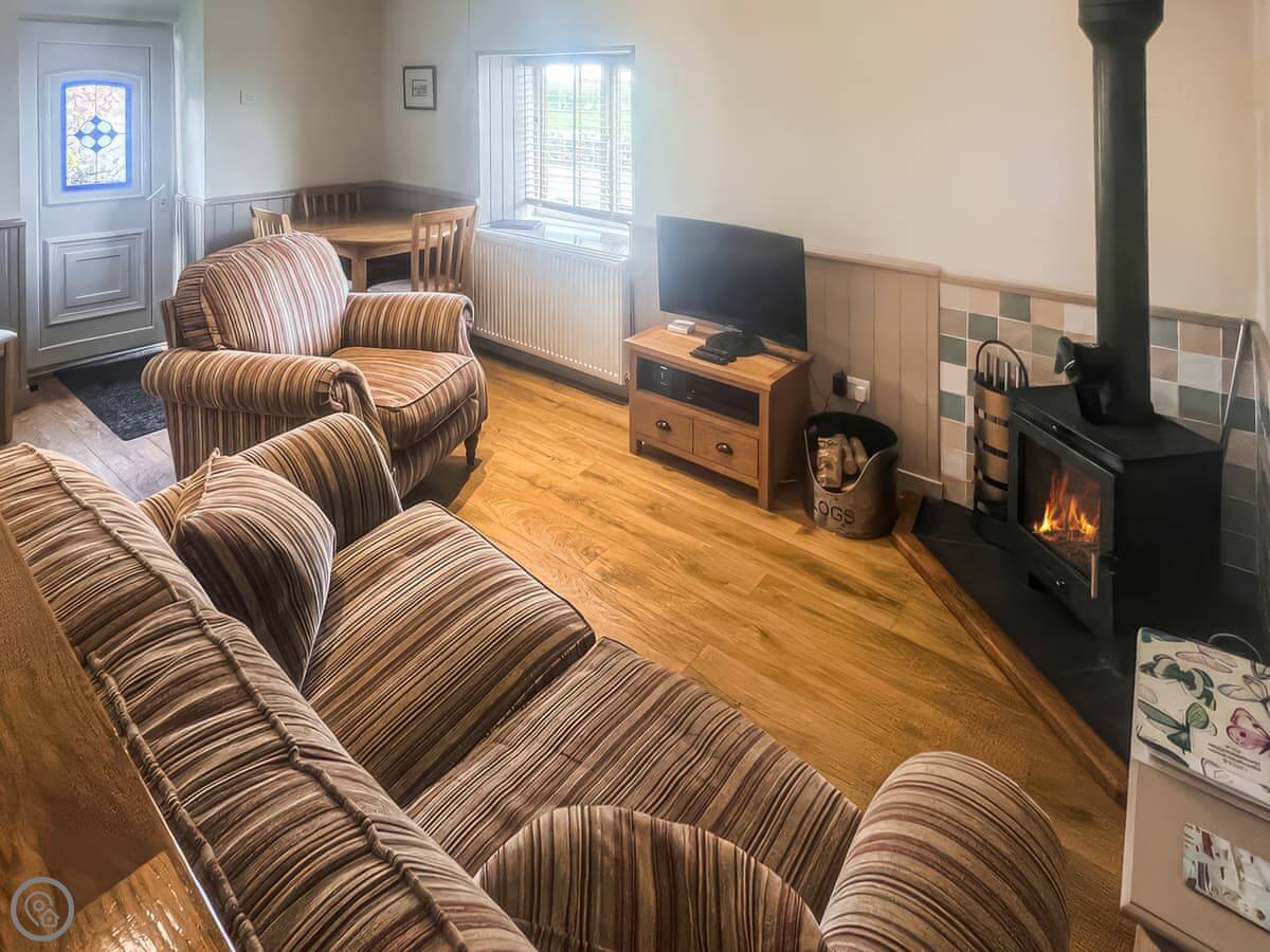 It sleeps three. Two bedrooms, one bathroom with a shower. It's got a 4 Star rating. It's clean and comfortable. The layout is open-plan downstairs, with a log burner in the living area. There's a dishwasher, washing machine, TV, and wifi. Bedding and towels are included. You can park on site.