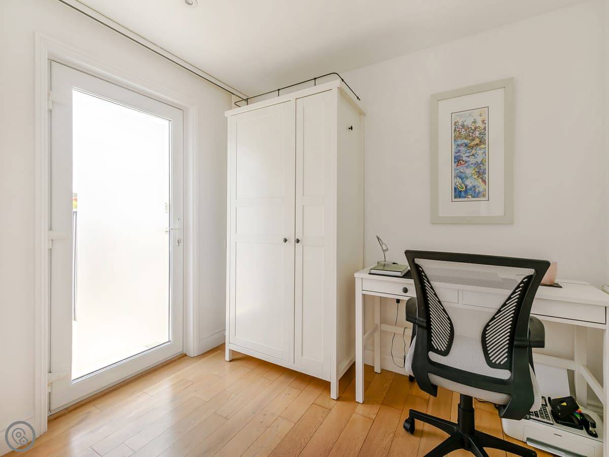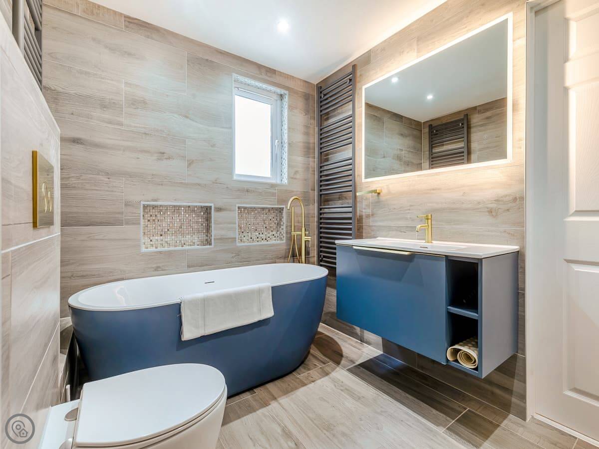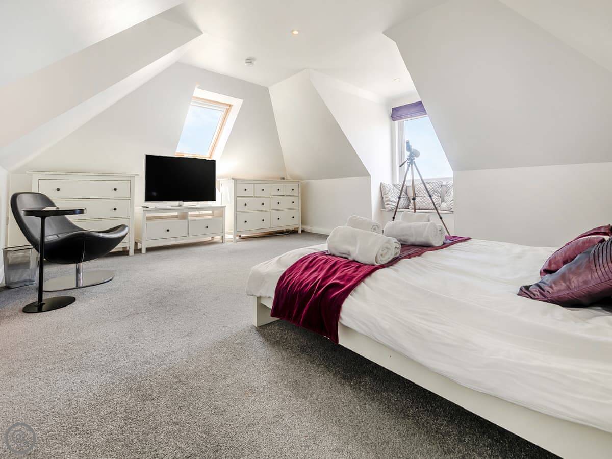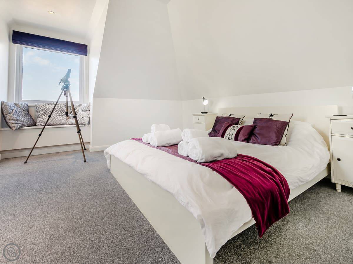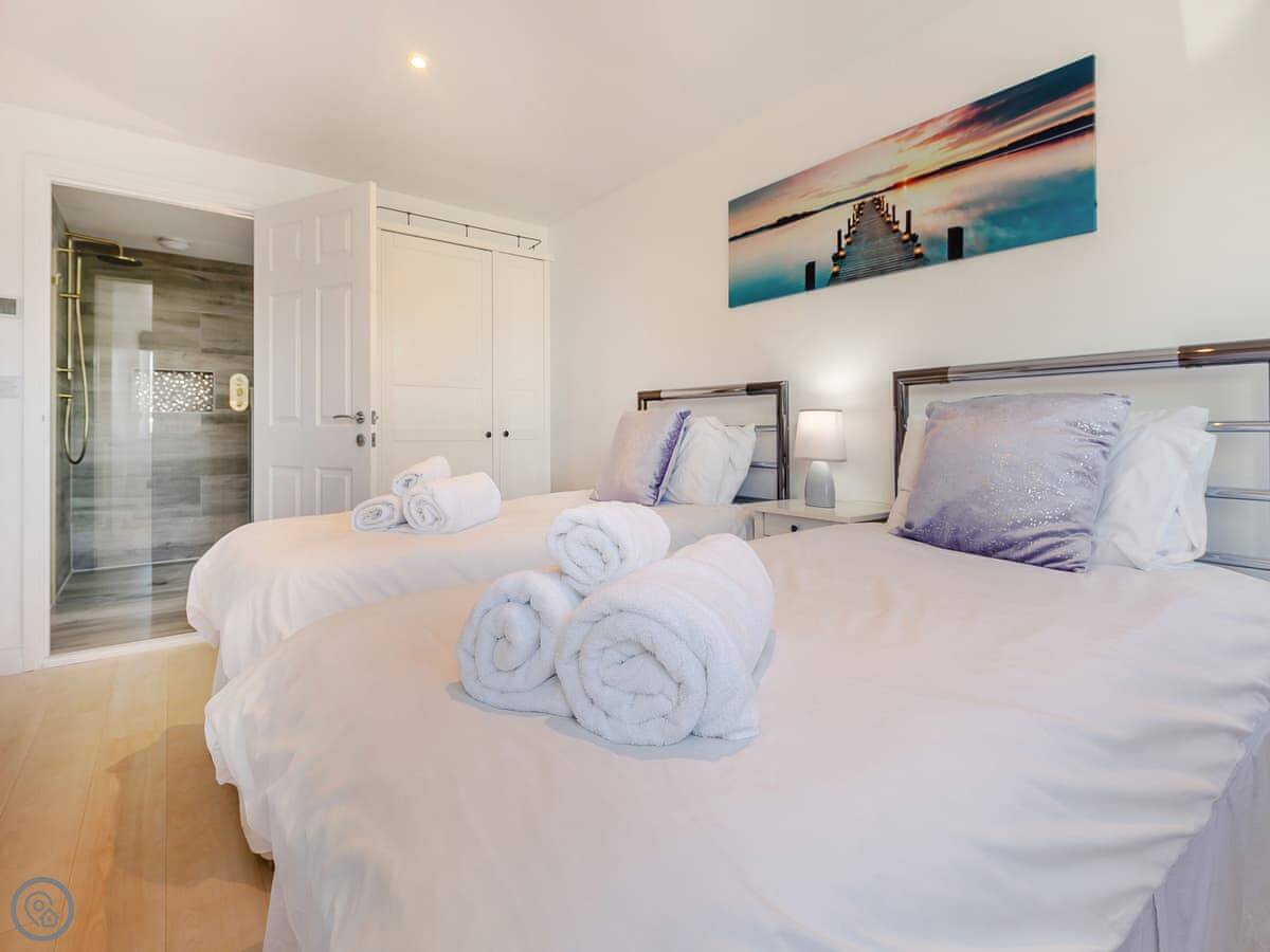 It sleeps eight people in four bedrooms, and each bedroom has its own bathroom. That's the main thing about it. It's got a 5 Star rating, which means it's well-equipped and finished to a high standard. The stairs are open-tread and a bit steep in places, so you need to be careful.