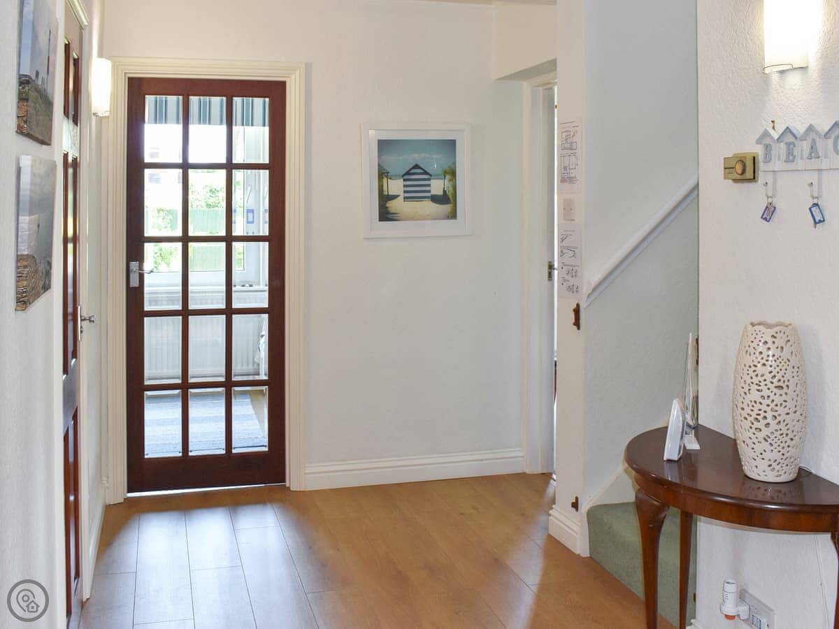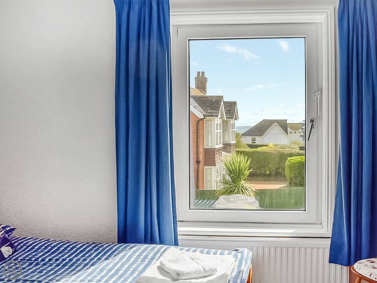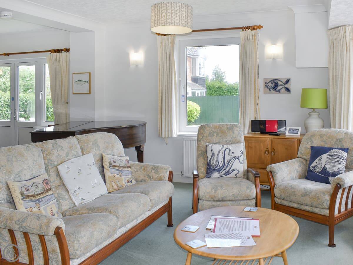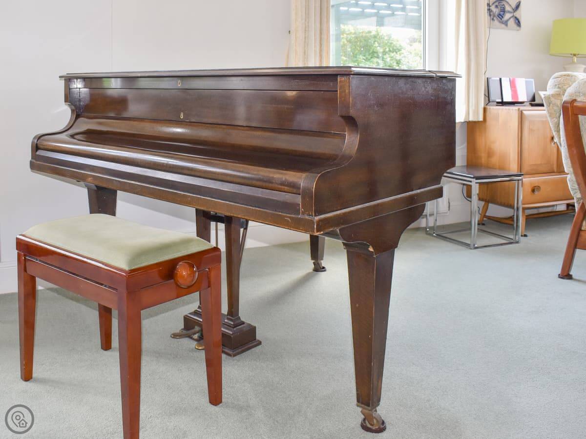 Inside, the front room has a baby grand piano. It's tuned and you're welcome to play it. The furniture is a mix of styles. The bedrooms upstairs have views, some over the downs and you can see a bit of the sea from the front ones.