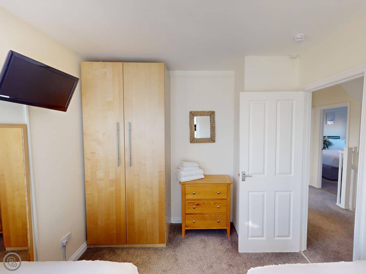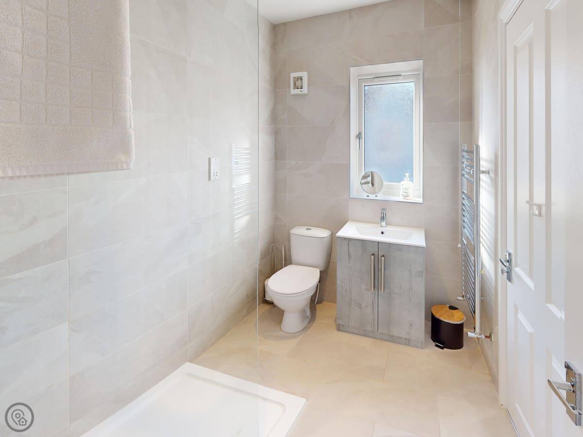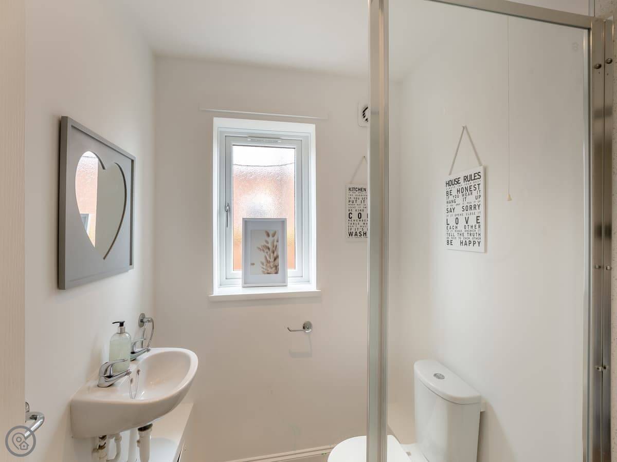 Inside, it's all open plan downstairs. There's a washing machine, a dishwasher, and Wi-Fi. Bedding and towels are included. A cot and highchair are there if you need them.