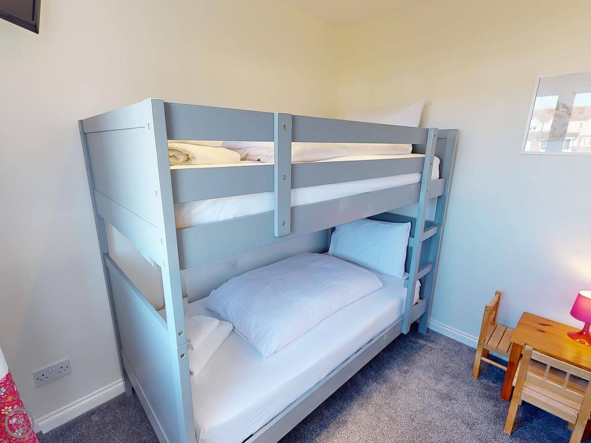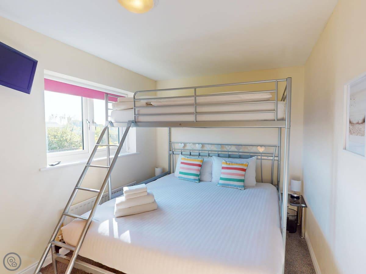 It sleeps ten people. There are four bedrooms and three bathrooms. It's a 4 Star place, which means it's comfortable and well-equipped. Two of the beds are unusual: one is bunk beds, and another is a bunk bed with a kingsize bed at the bottom and a double on top. The stairs are fine, normal house stairs.