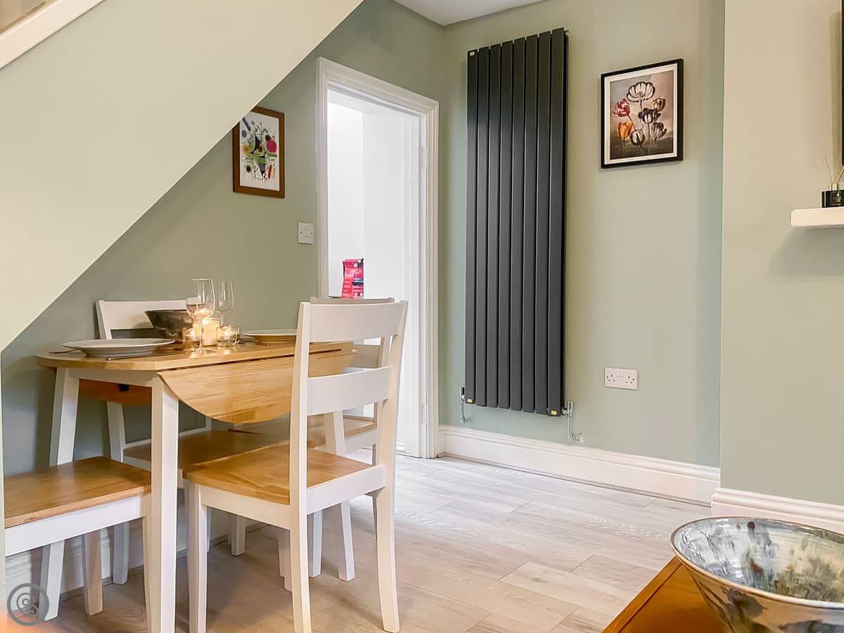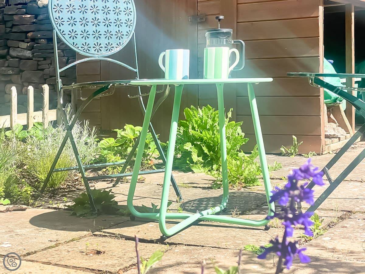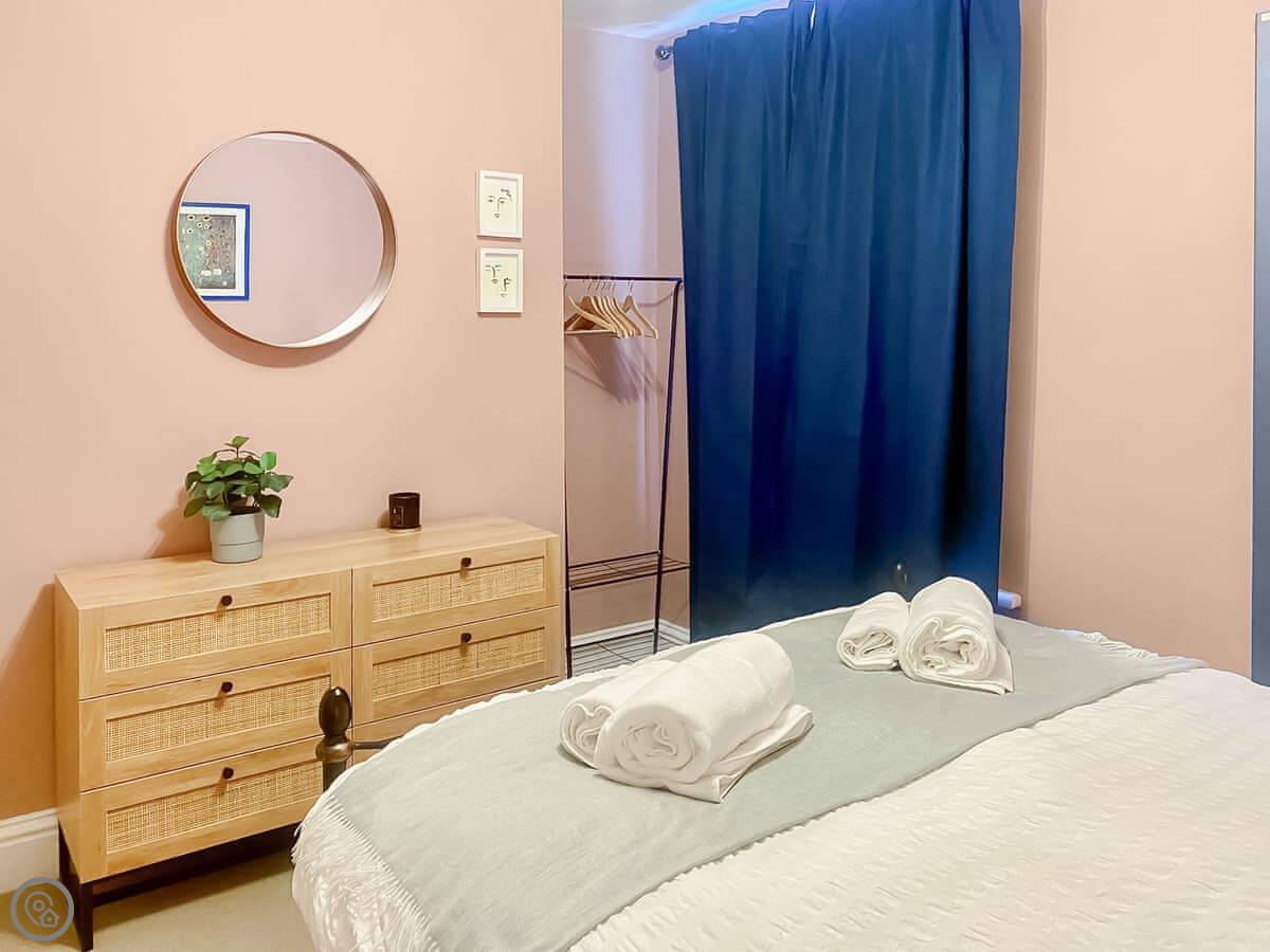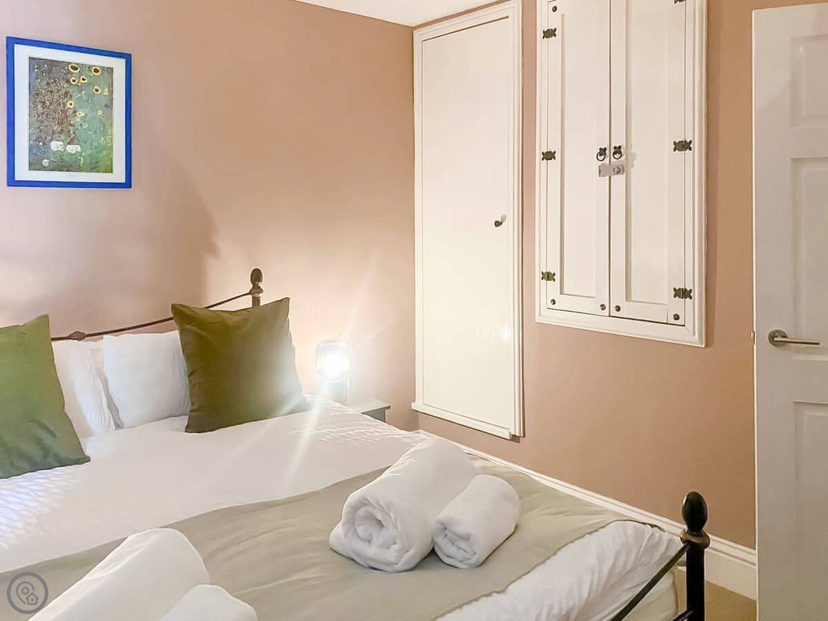 The bedroom is upstairs. It has a king-size bed. The bathroom and everything else is on the ground floor. There's a small patio area out the back with a table and chairs. It's walled, so it's private. You can bring one dog.