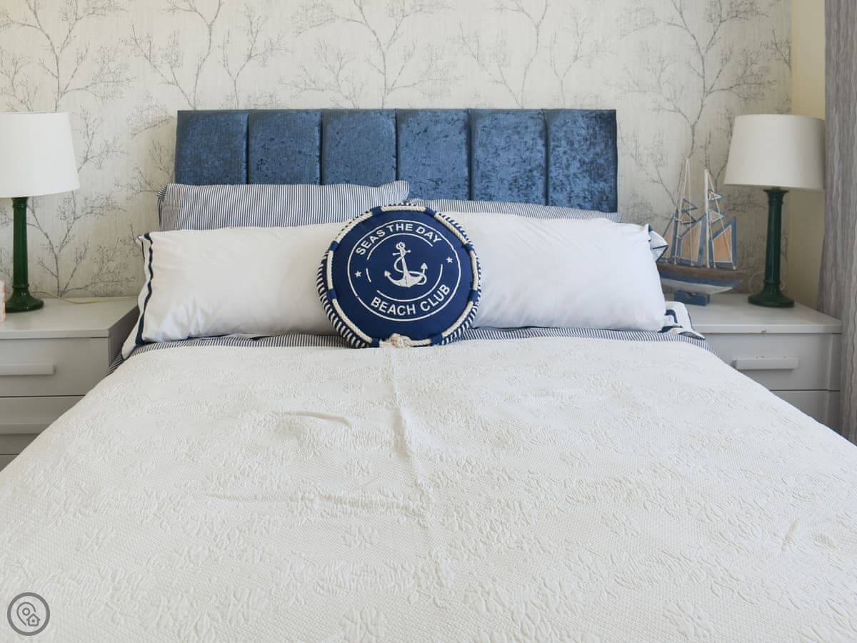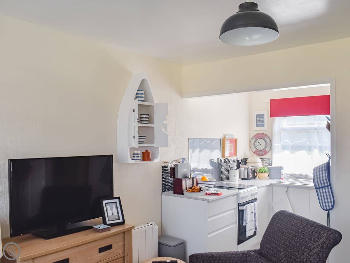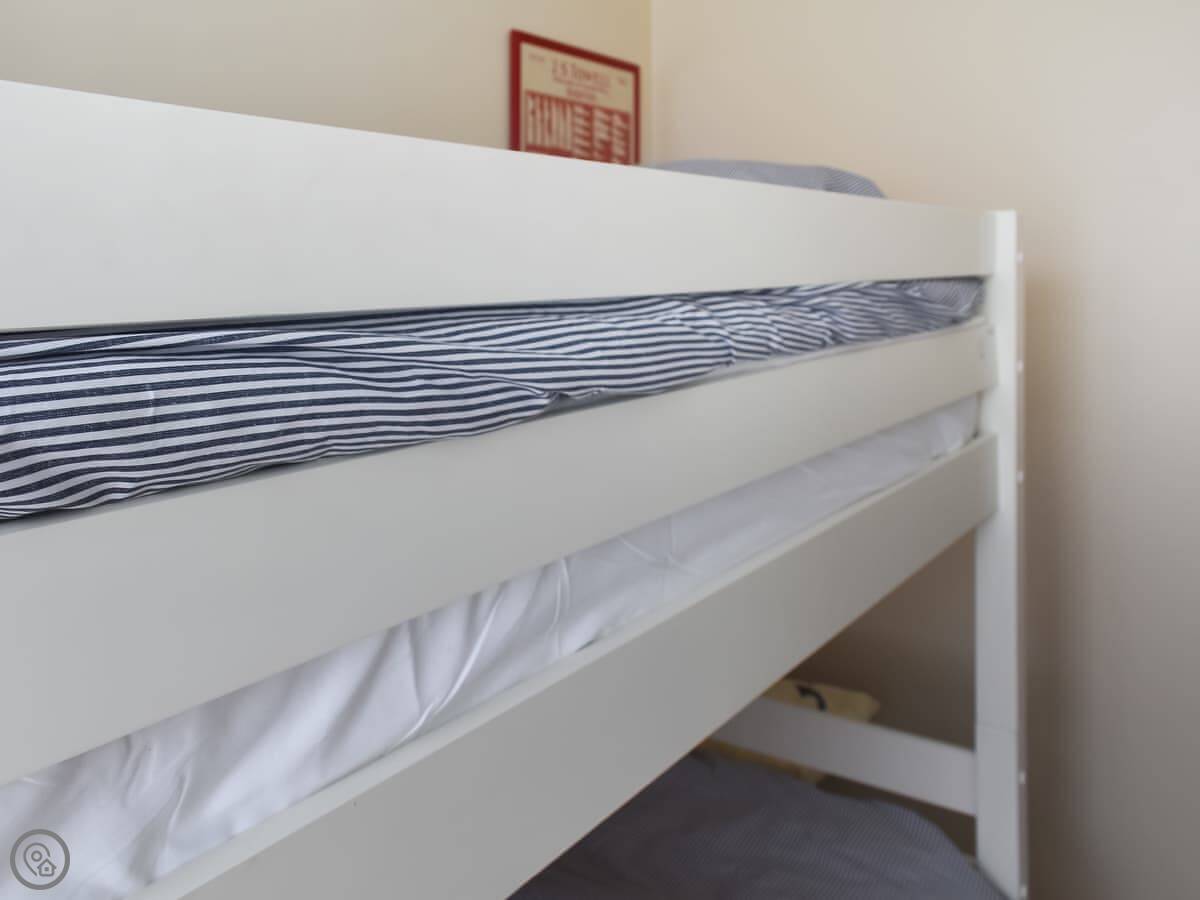 Inside, it's one level. Open plan living, kitchen, and dining area. The kitchen has a dishwasher. There's one bathroom with a shower. One bedroom has a double bed, the other has full-sized bunk beds. It’s got a 4 Star rating, which means it’s comfortable and well-equipped. It’s not huge, but it's fine for a week by the coast.