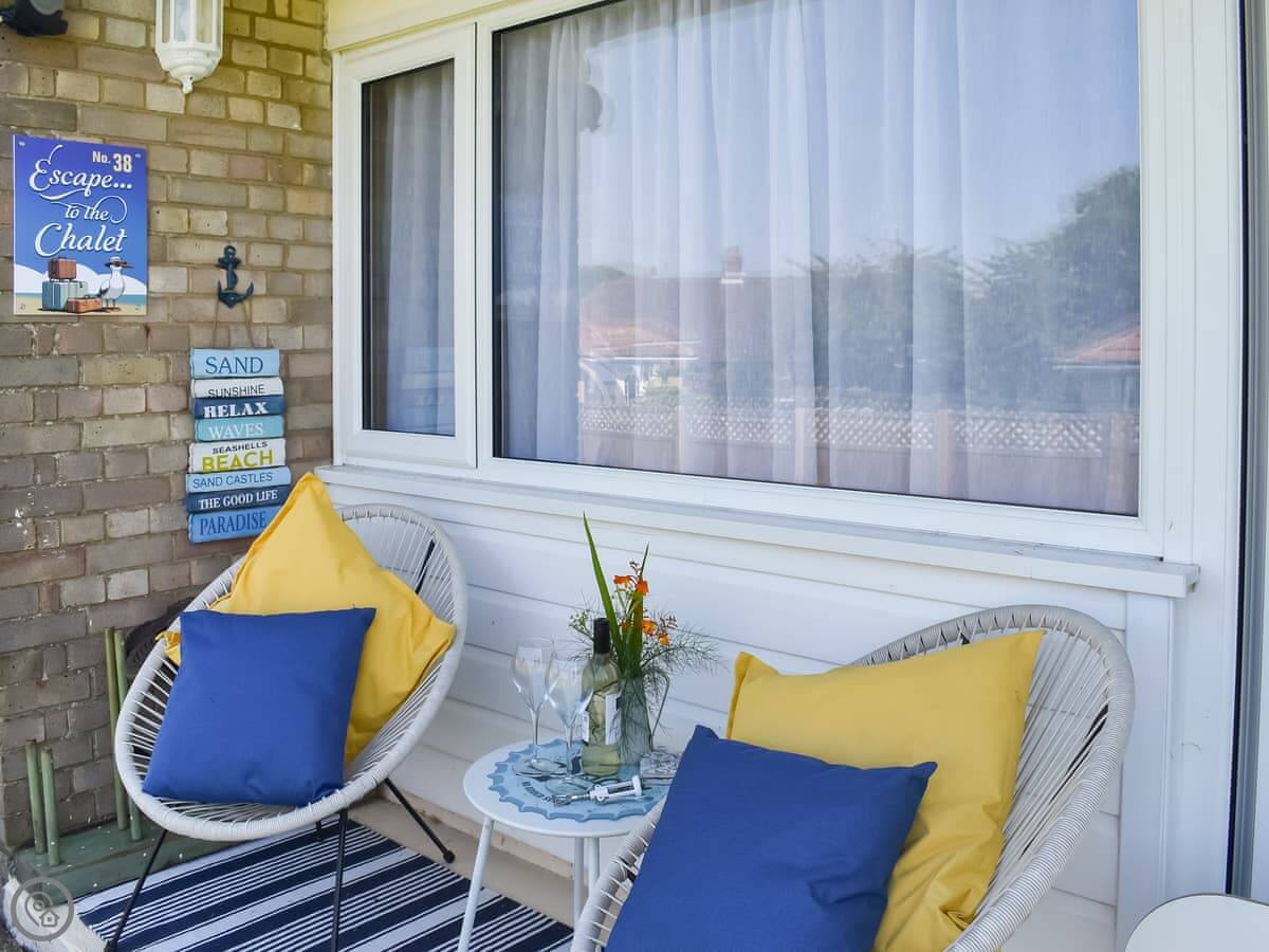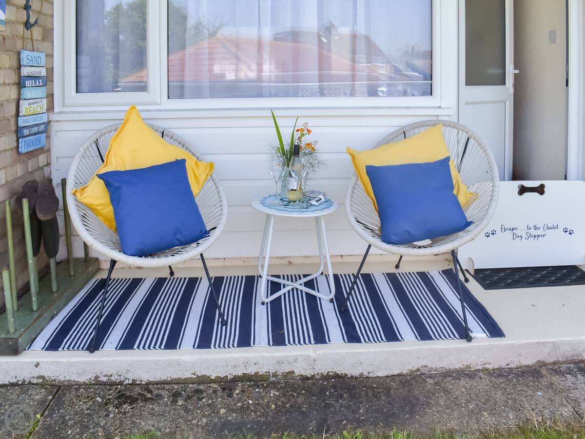 Escape To The Chalet is in Kessingland, a couple of miles south of Lowestoft. It's a two-bedroom chalet on a park. It sleeps four. You get your own patio area, and there's a shared bit of grass.