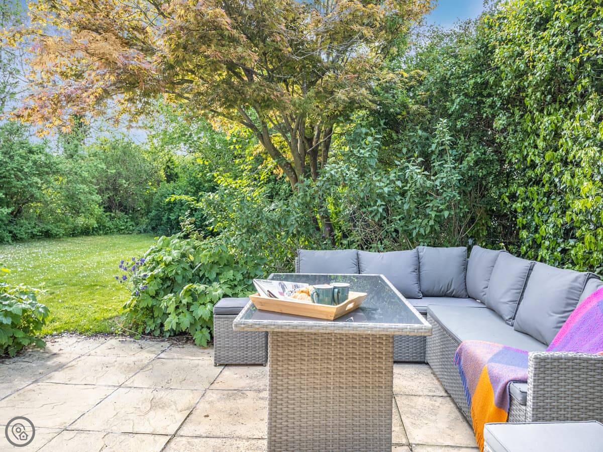 Inside, it's got a decent kitchen with a rangemaster cooker, and a separate utility room with a fridge freezer and a washer dryer. There's a dining area and a living room with an open fire. The garden has a patio with furniture and a gas barbecue.