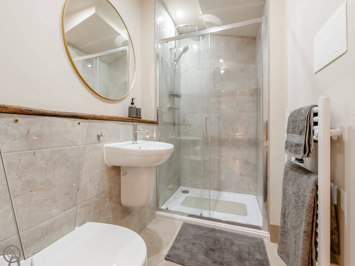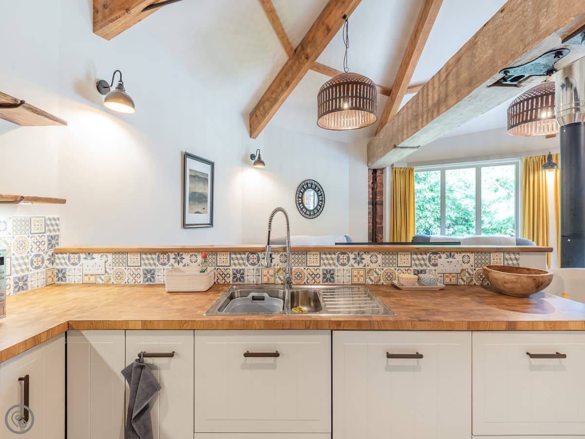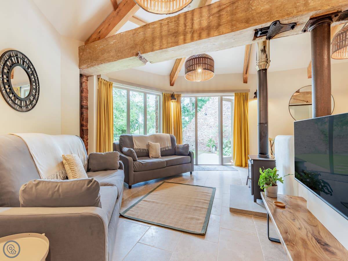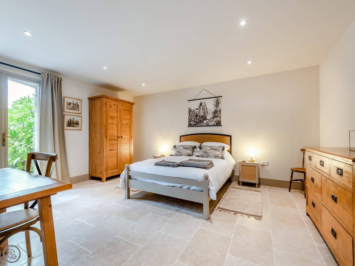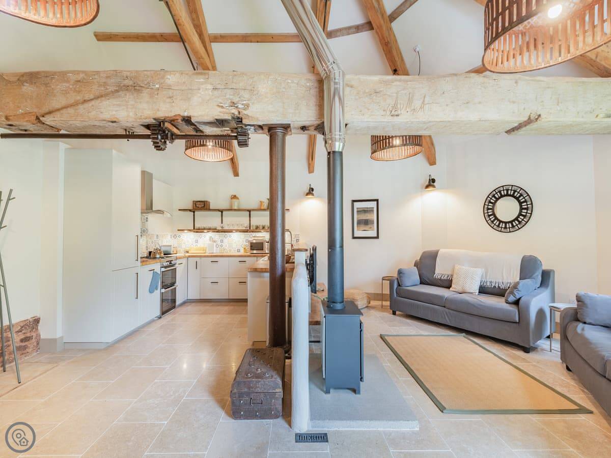 The whole place is on one level. It’s open plan inside, with a high ceiling and a wood burner. There are steps down to it from the car park, and you walk along a path through some trees to get to the front door. It feels private.