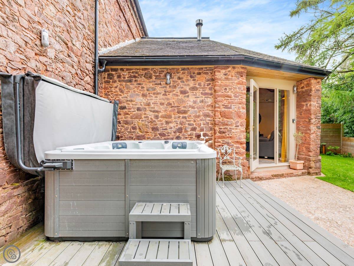 You get a hot tub outside. There's also a warm shower out there to rinse off before and after. There’s a patio with a table and chairs, and the view is just over fields. It’s quiet.
