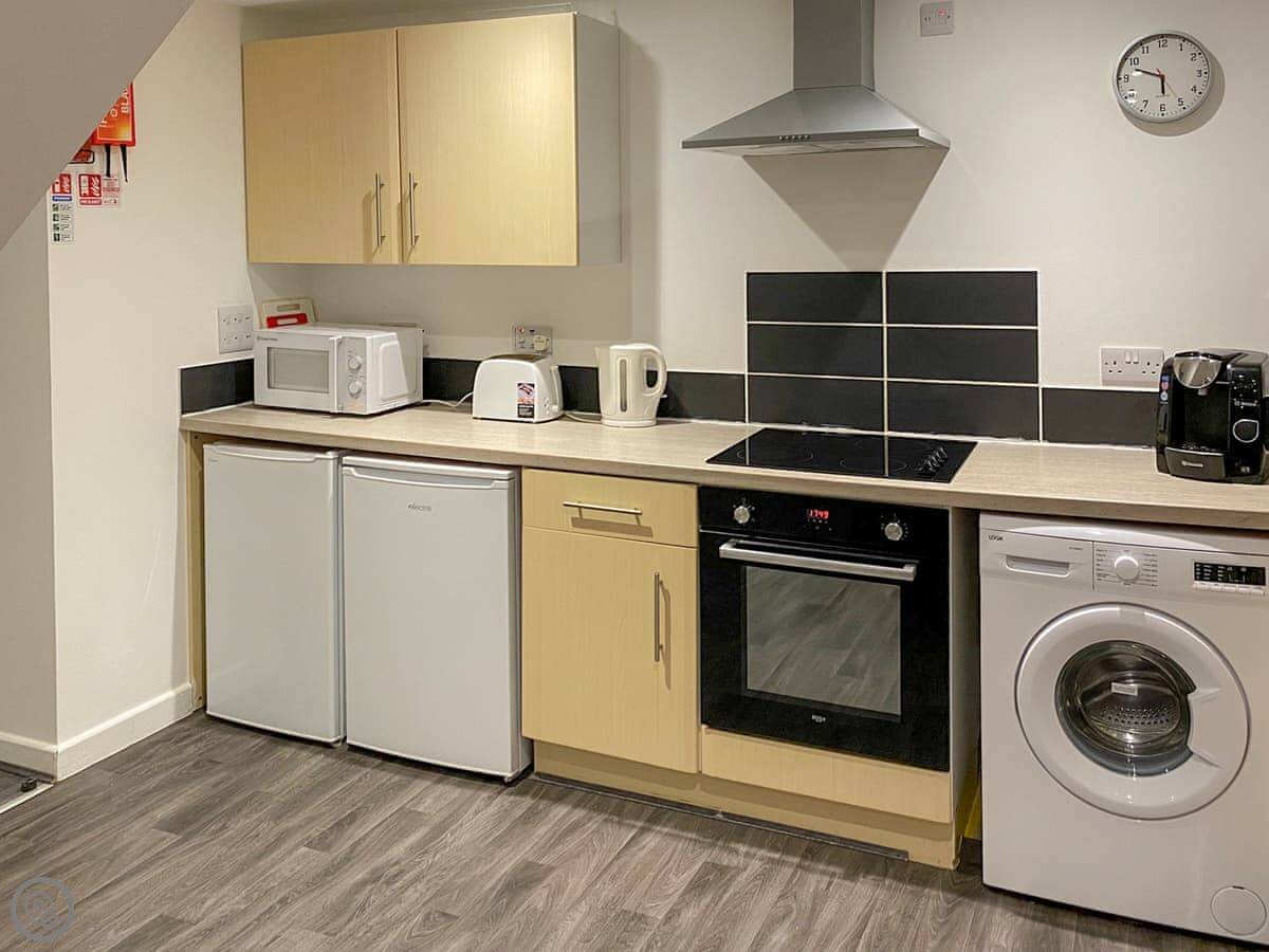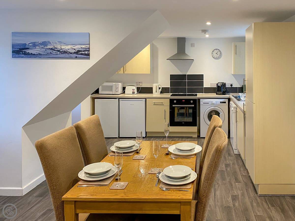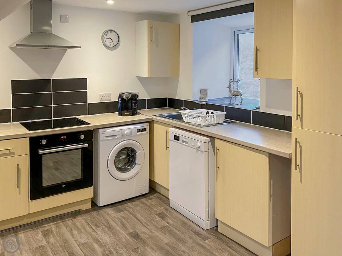 Inside, it's open plan downstairs. There's a washing machine, dishwasher, WiFi, and a TV. Bedding and towels are included.