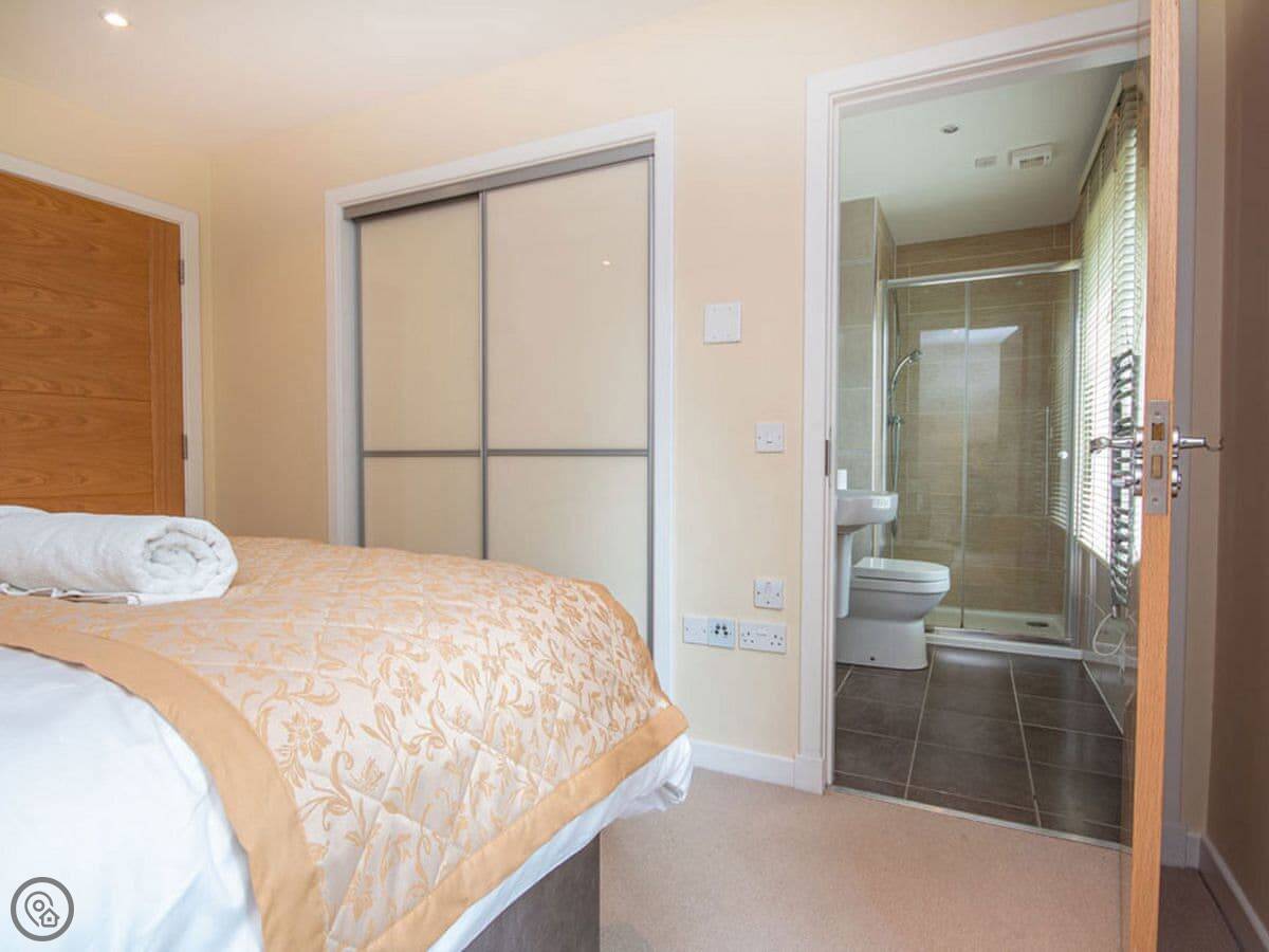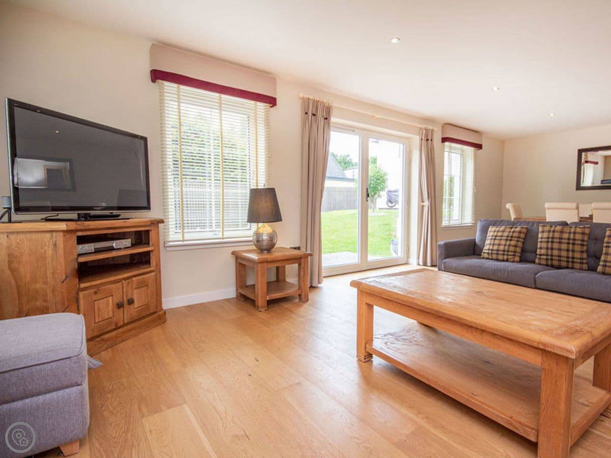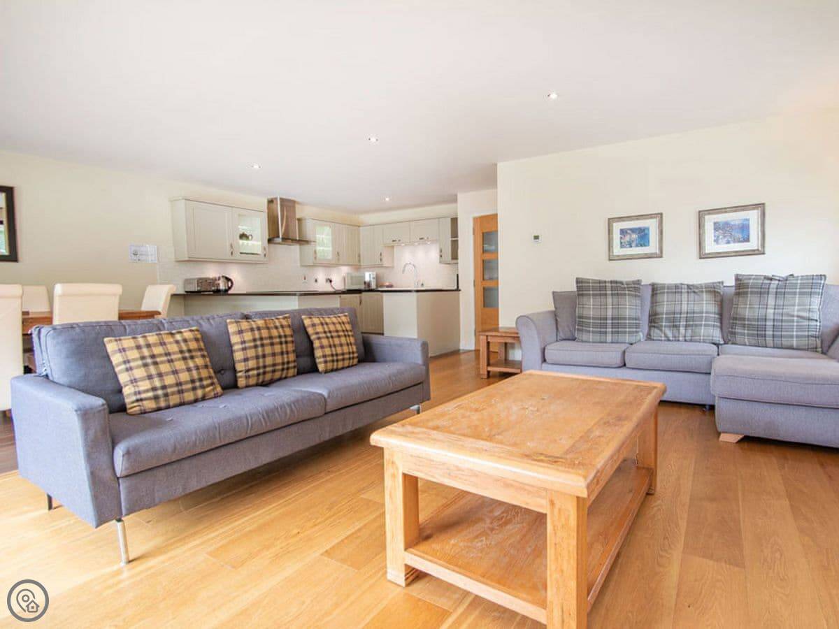 It sleeps six. Three bedrooms, two bathrooms, which is handy. Everything's on one level, so it's good if stairs are a problem. The front door is wheelchair accessible. You walk straight into a big open plan living, kitchen, and dining room. There's a patio door that opens onto a small garden area with a table and chairs. It's not a huge garden, but it's yours.
