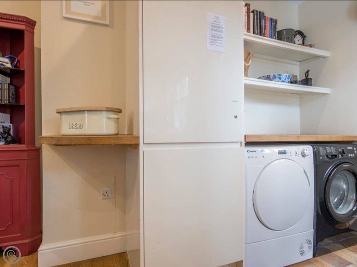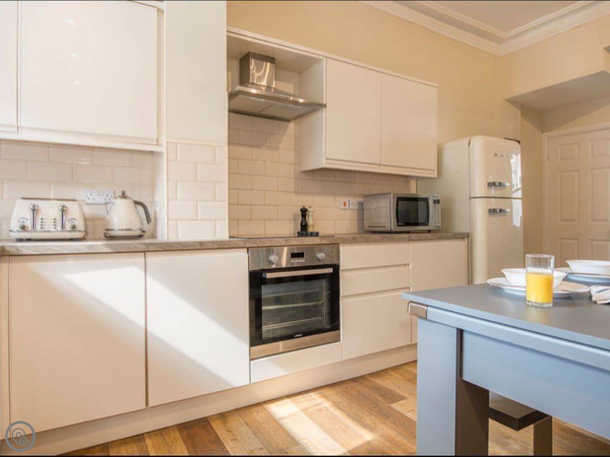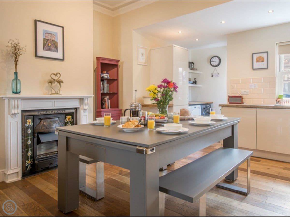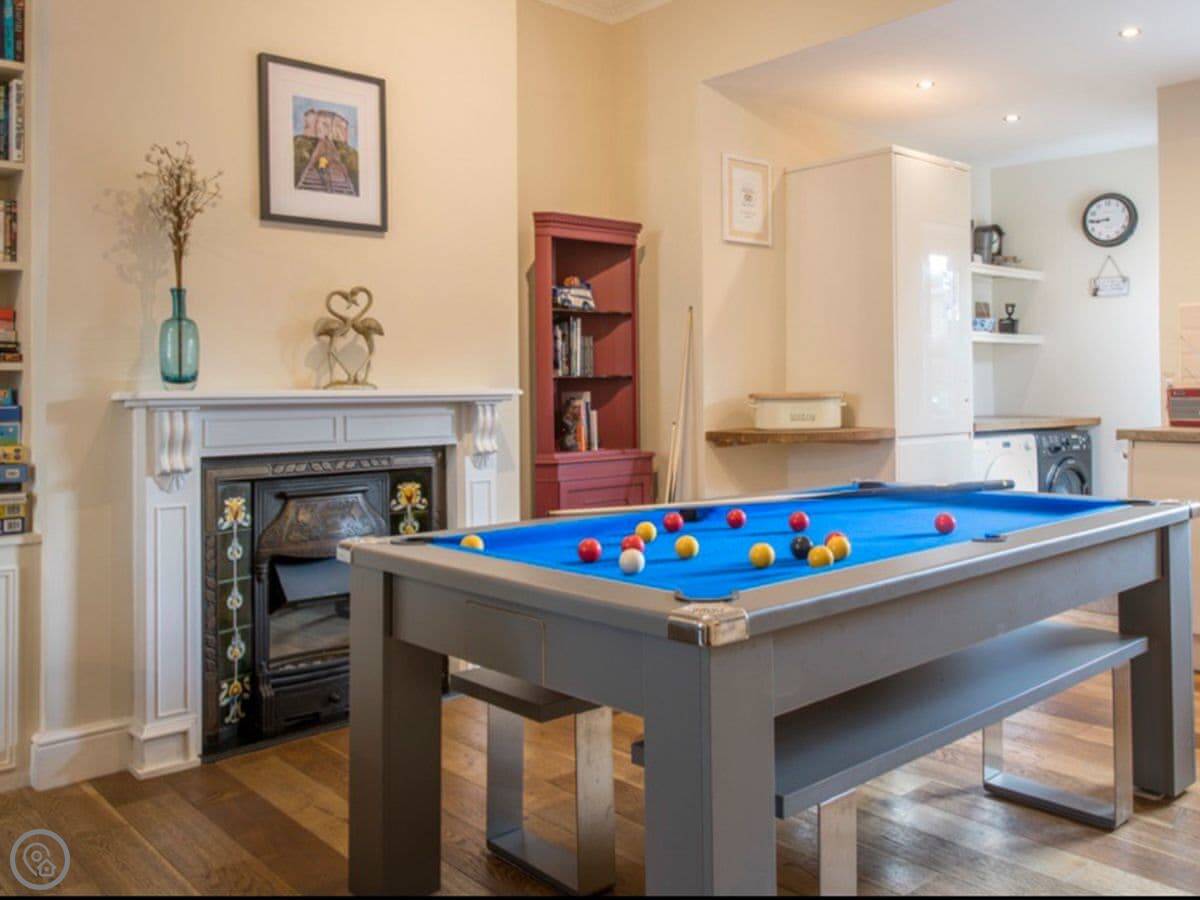 The living room, kitchen, and dining area are all in one room on the ground floor. That's where the wood burner is. The kitchen has what you need. The dining table converts into a full-size pool table if you want it to.
