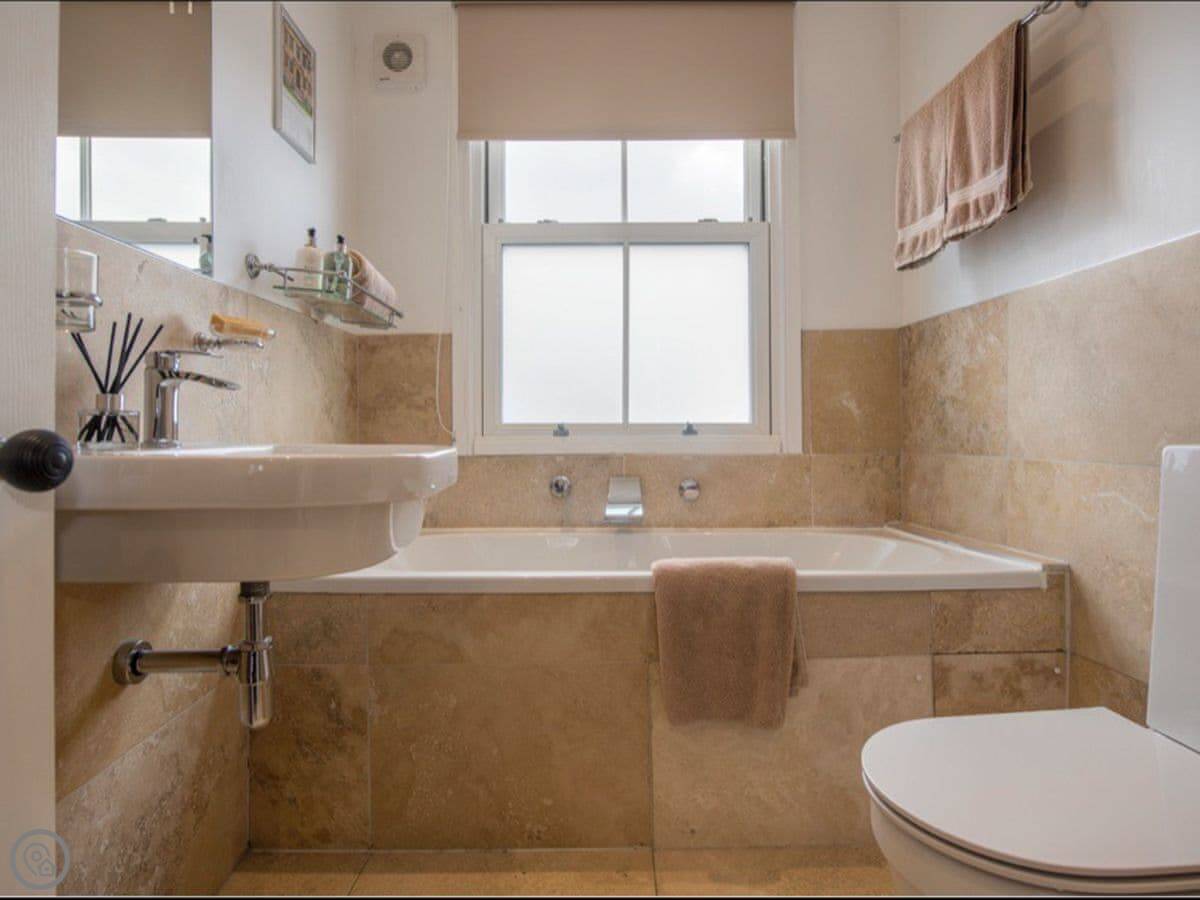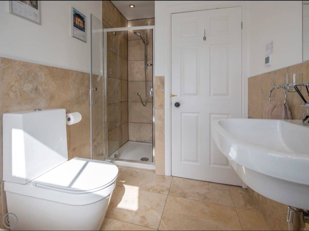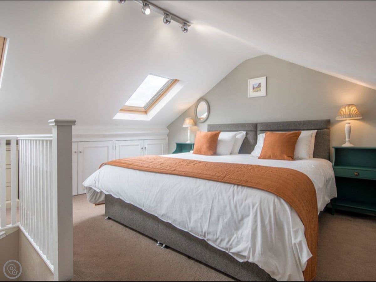 There's a king bedroom and a single bedroom on the first floor. The bathroom is on that floor too. It has a bath, a separate shower cubicle, and underfloor heating.