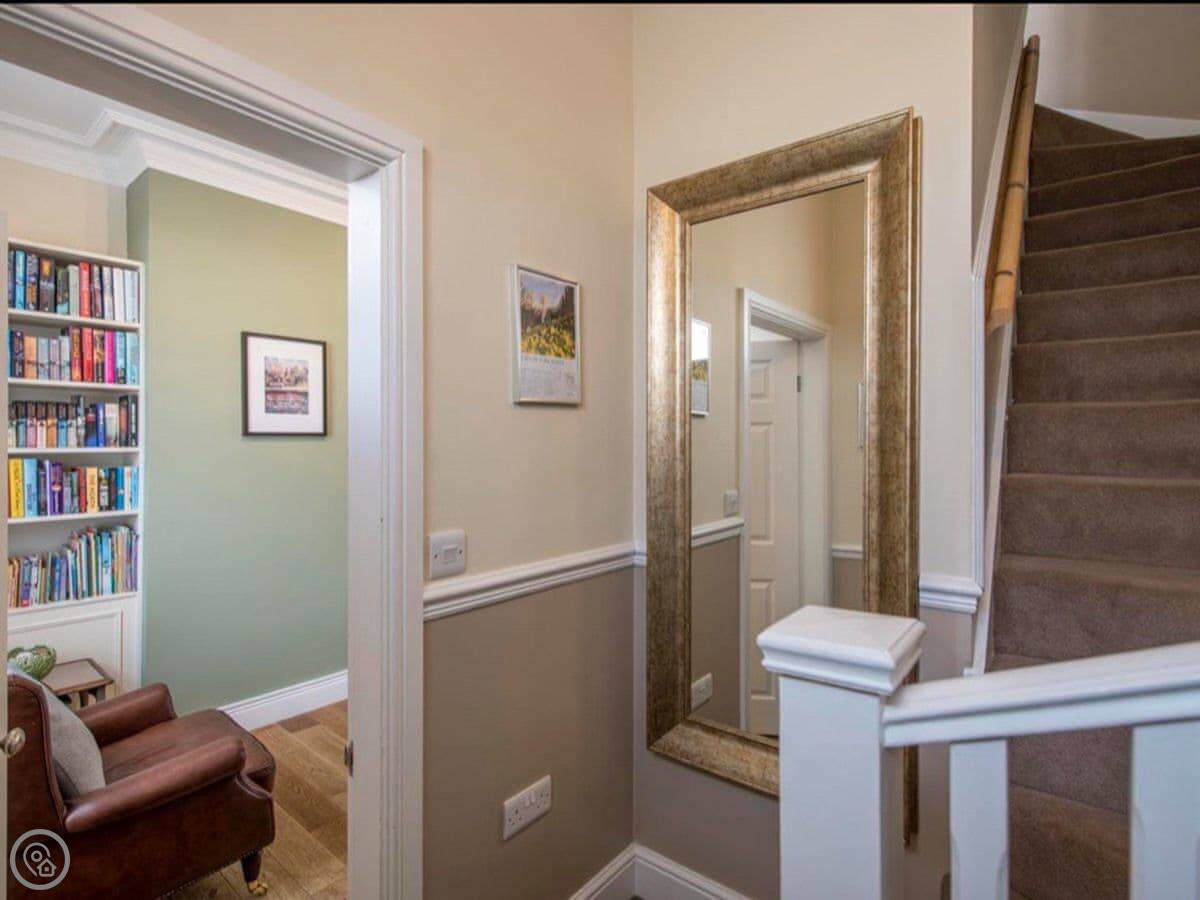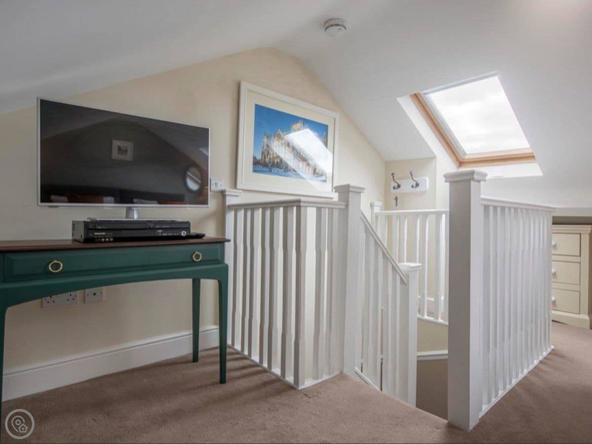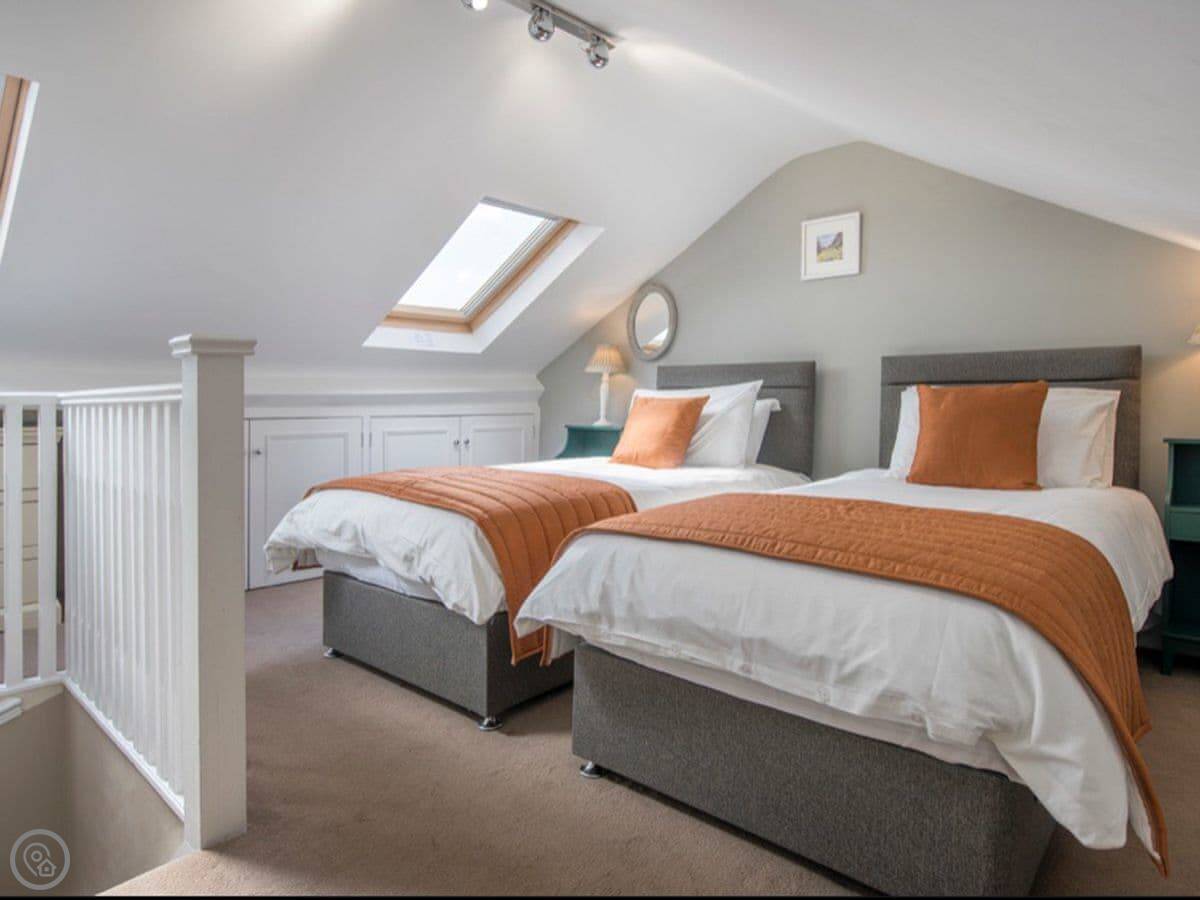There's a king bedroom and a single bedroom on the first floor. The bathroom is on that floor too. It has a bath, a separate shower cubicle, and underfloor heating.
