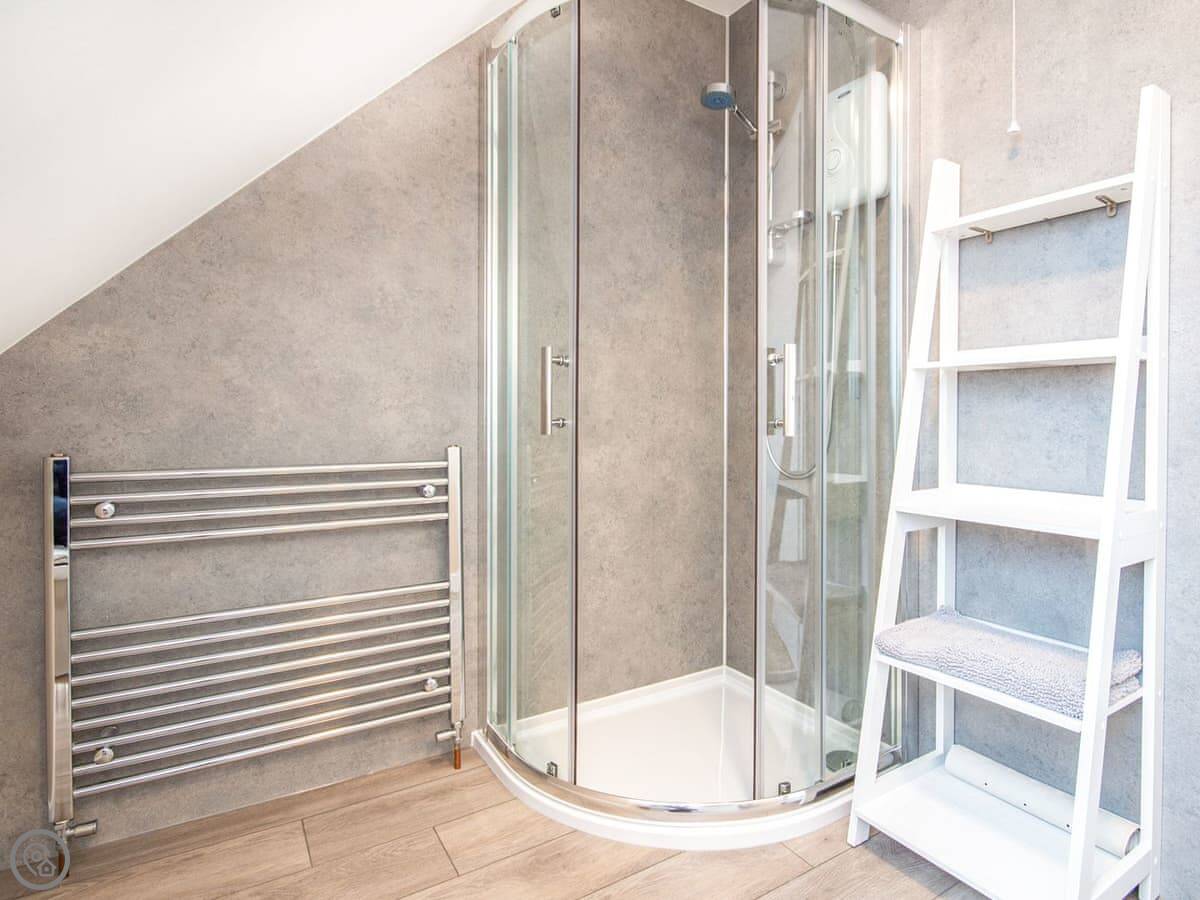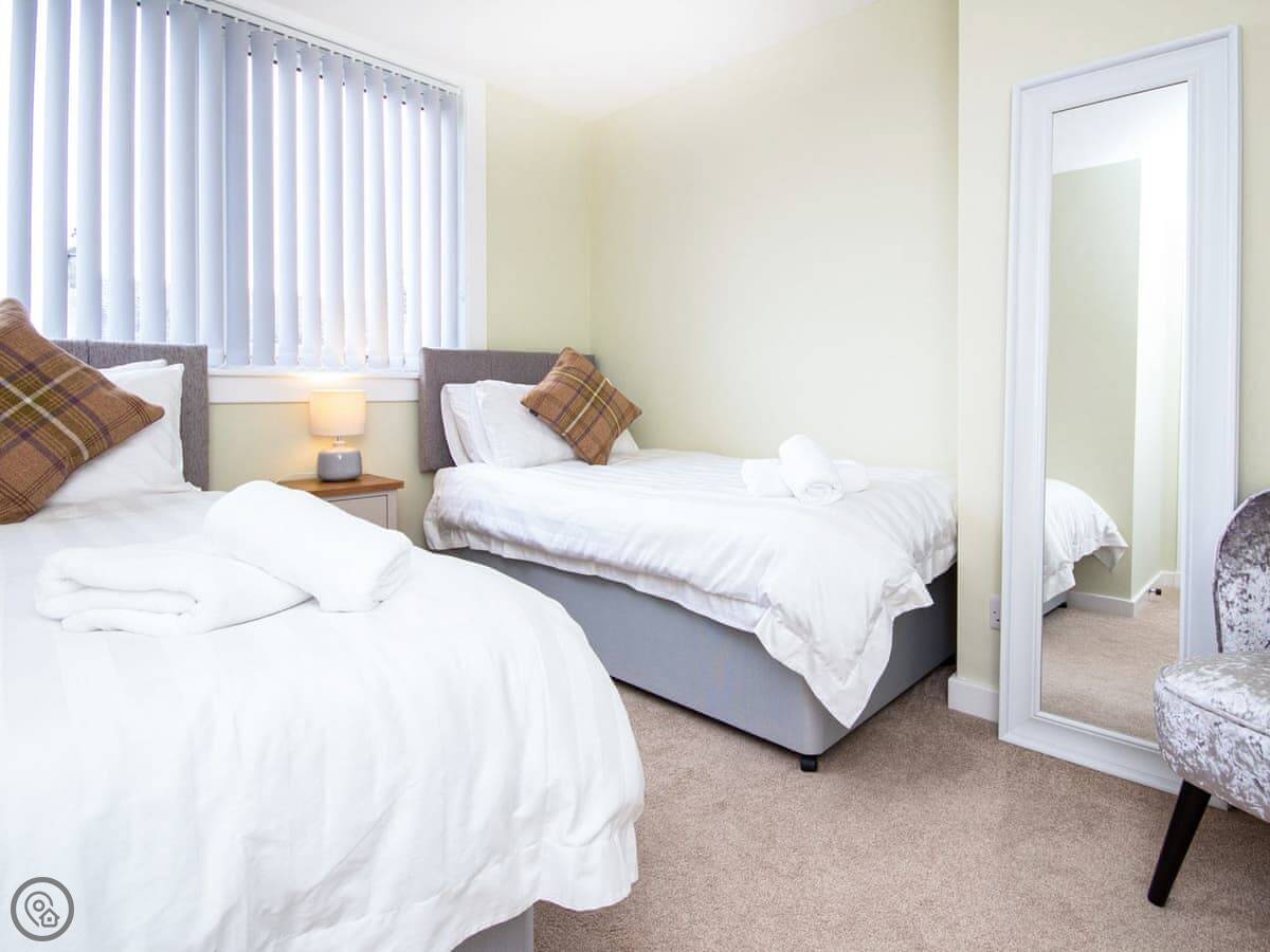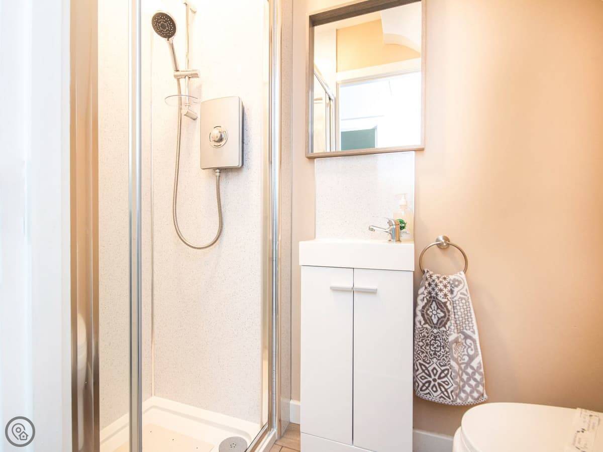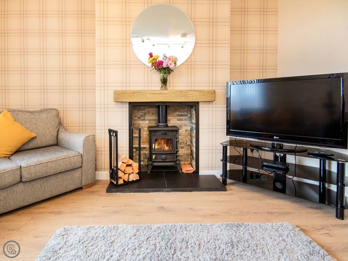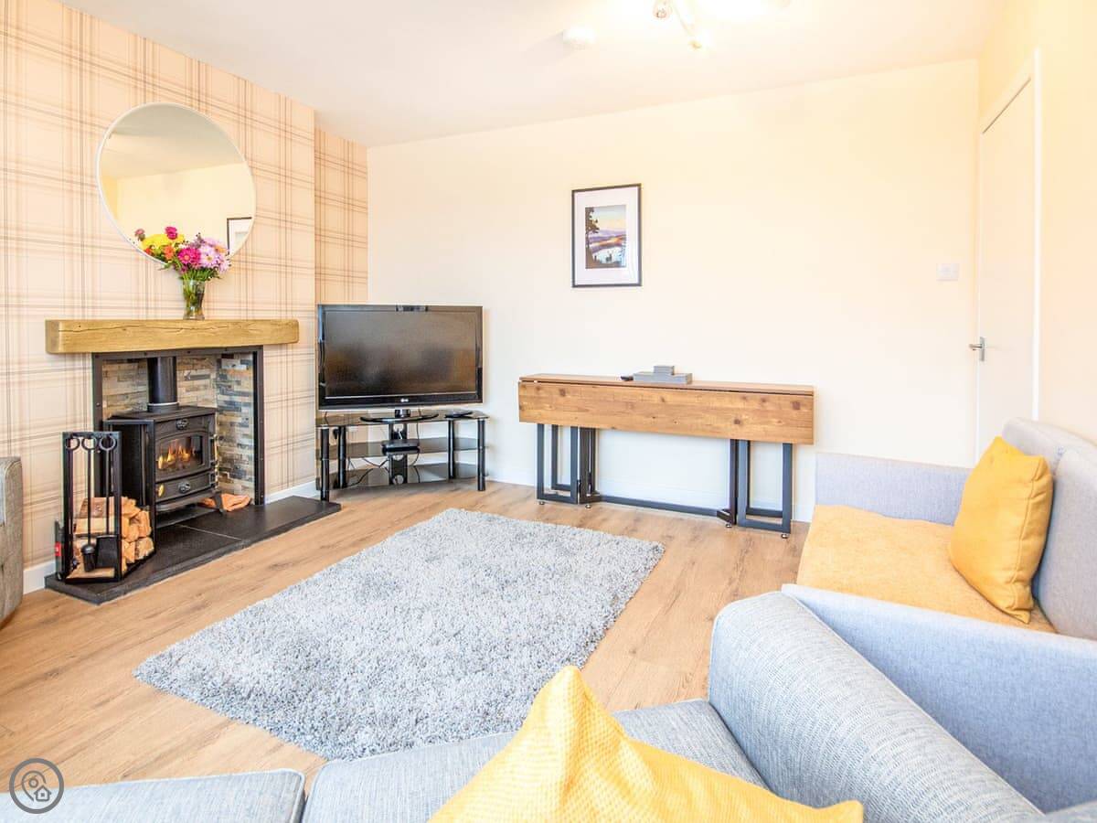The living room looks out over the garden. There's a wood burner, a big telly with Sky Sports, and a table that seats everyone. The kitchen's modern and has what you need. Two bedrooms have super king beds, one's a twin, and there's a single bedroom. Both bathrooms have a shower cubicle and loo.