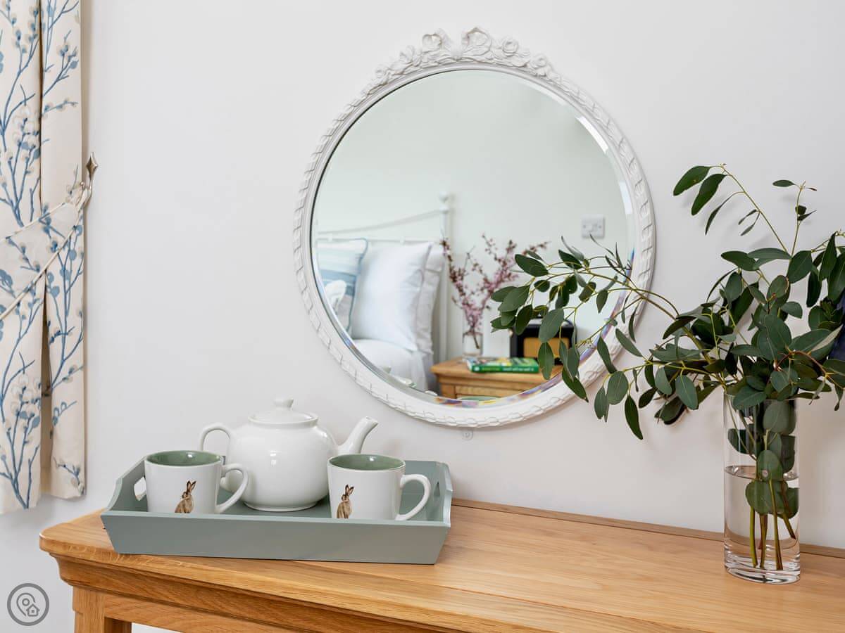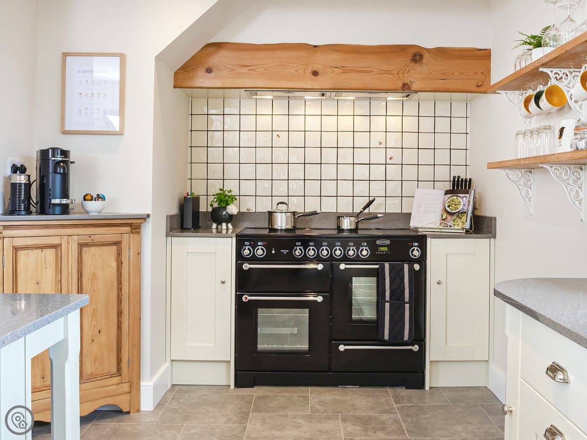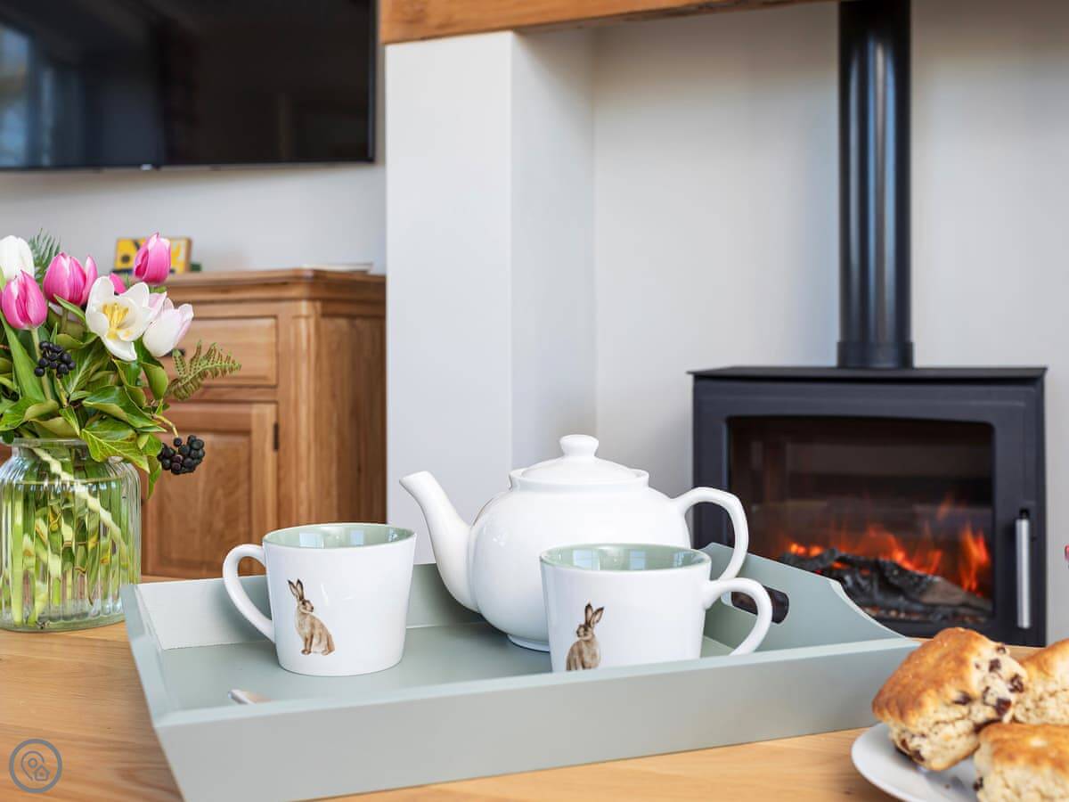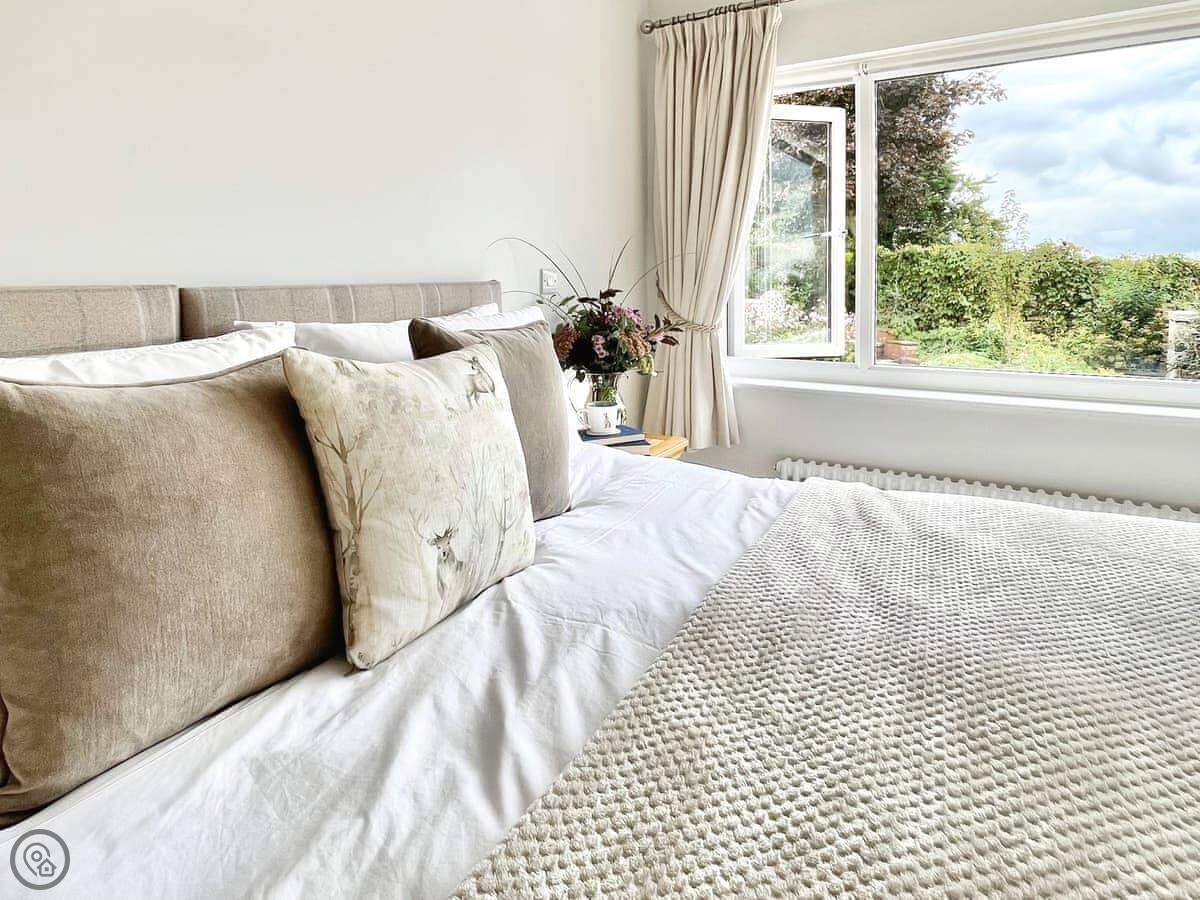 Inside, it's just been done up so everything works and is clean. There's a big living room, an open plan kitchen and dining area, and an old farmhouse table. You can open the doors from the kitchen to the front patio. There's a wood burner in the lounge, TVs, wifi, and the usual things like a washing machine and dishwasher. Parking is on the drive. Bedding and towels are included.
