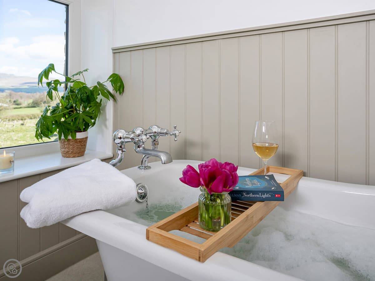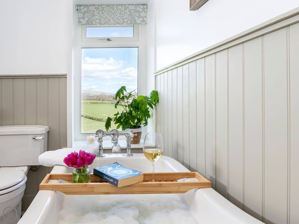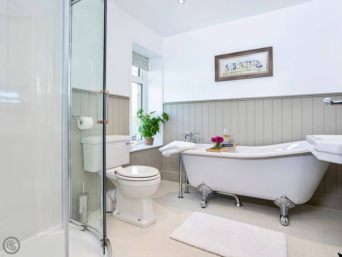 The ground floor bedroom and shower room are handy if you don't want to use stairs. The stairs themselves are normal, not steep. The upstairs bathroom has a roll-top bath you can see the hills from.