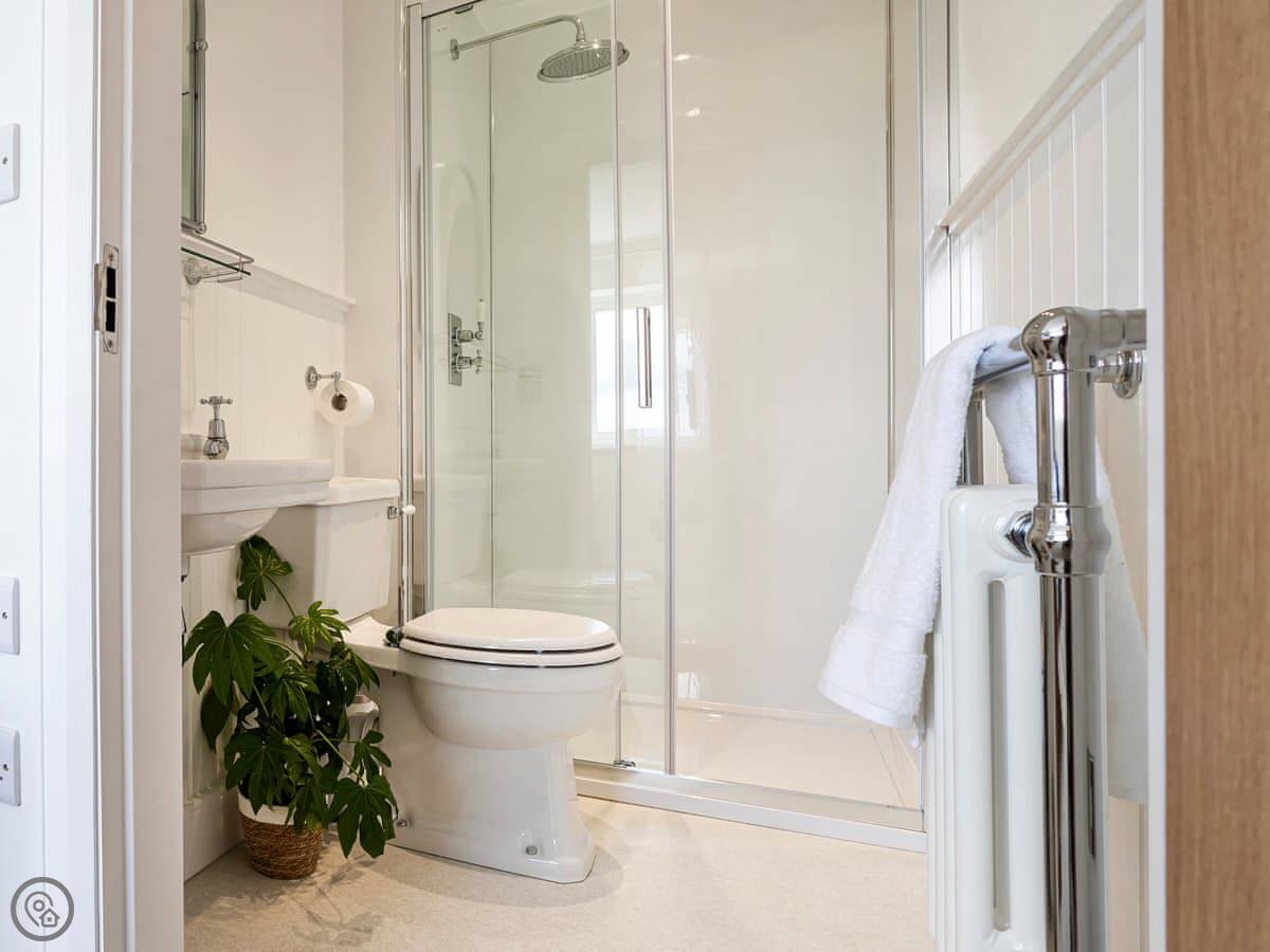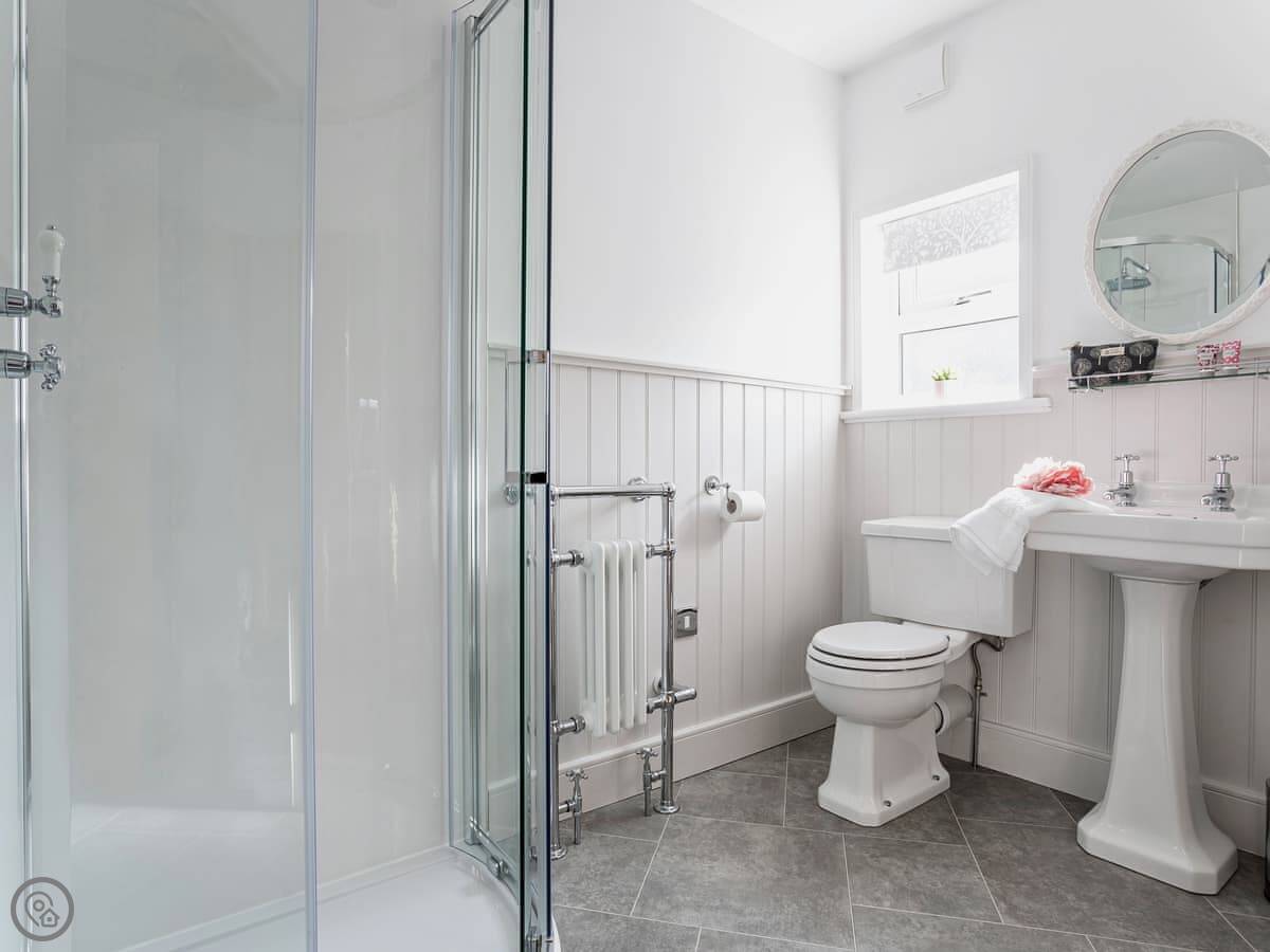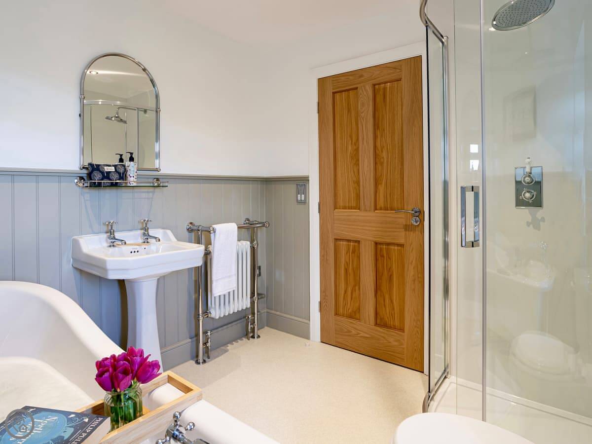 The ground floor bedroom and shower room are handy if you don't want to use stairs. The stairs themselves are normal, not steep. The upstairs bathroom has a roll-top bath you can see the hills from.