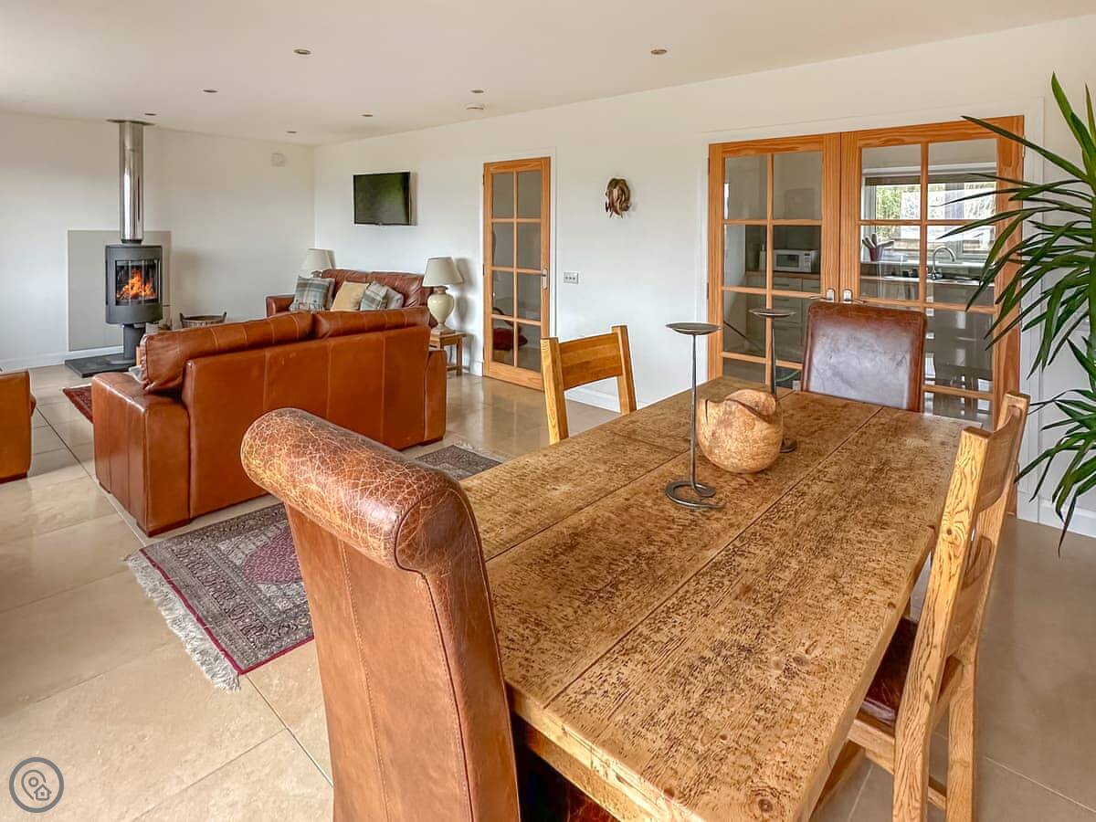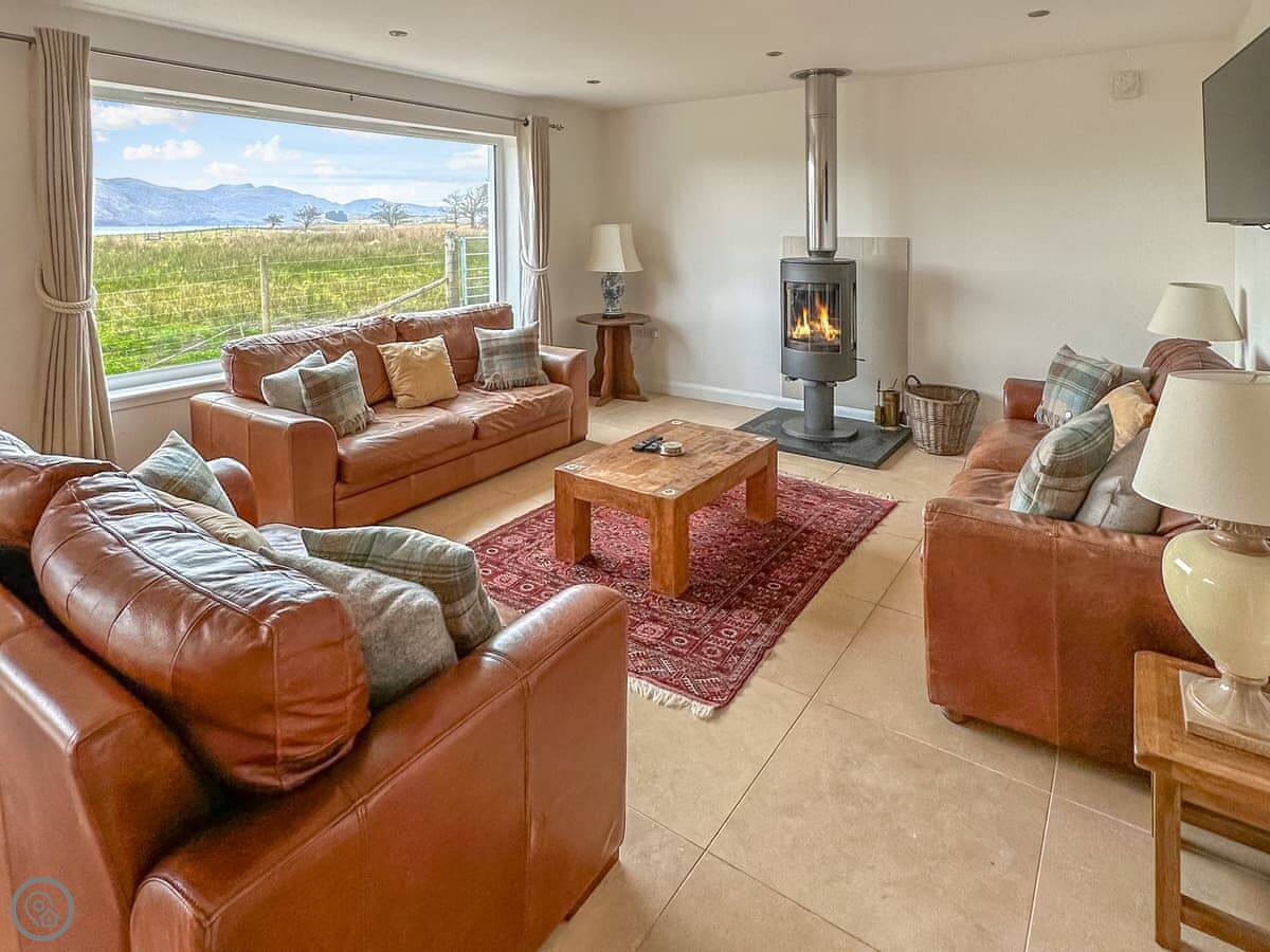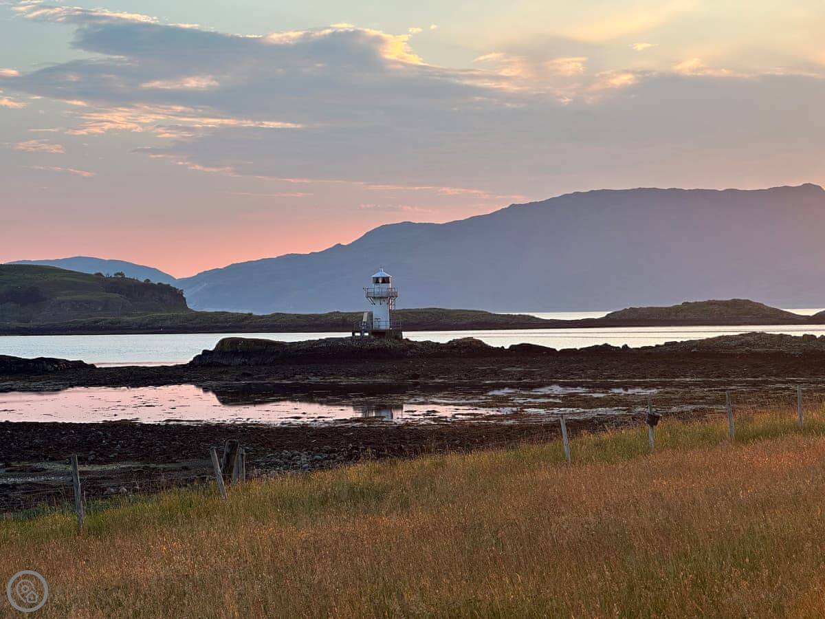 It's a four-star property, so it's comfortable and well-fitted. Sleeps four, two bedrooms, two bathrooms. Both bedrooms are upstairs. Downstairs is open-plan with a wood burner and a kitchen with a dishwasher and washing machine. The view is the main thing. You look straight out at the water, the lighthouse, the Isle of Lismore, and the Morvern hills.