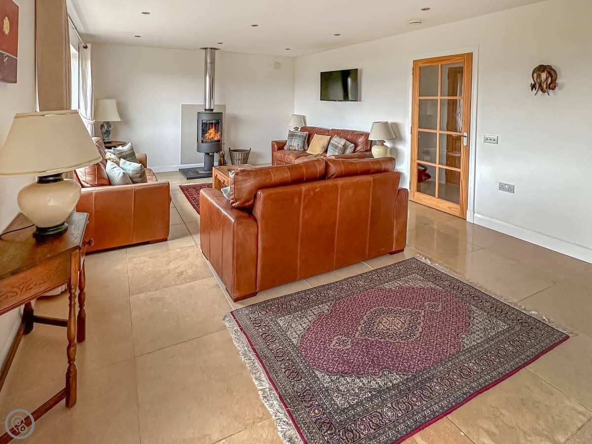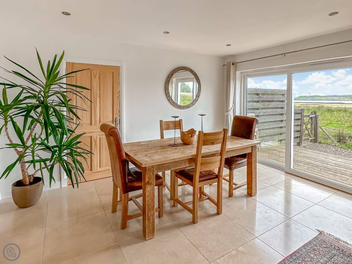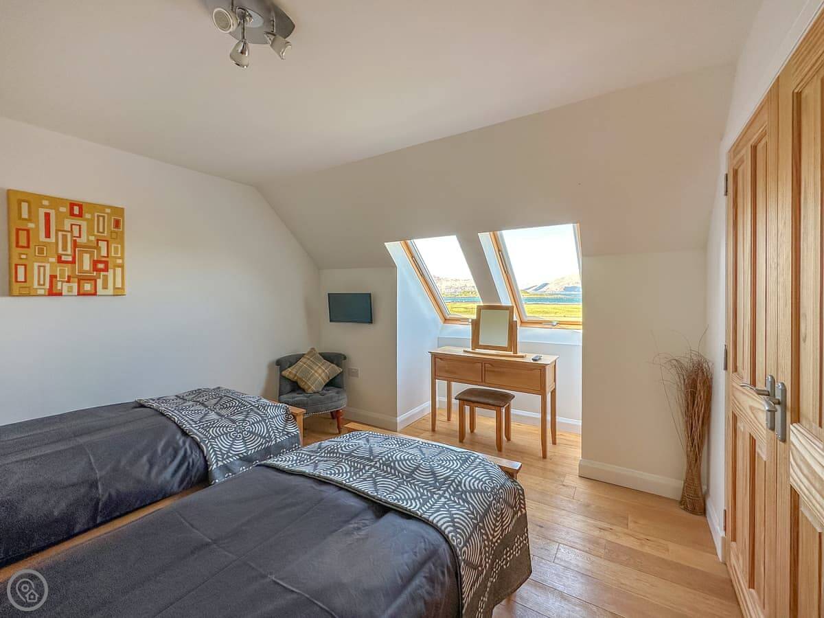 It's a four-star property, so it's comfortable and well-fitted. Sleeps four, two bedrooms, two bathrooms. Both bedrooms are upstairs. Downstairs is open-plan with a wood burner and a kitchen with a dishwasher and washing machine. The view is the main thing. You look straight out at the water, the lighthouse, the Isle of Lismore, and the Morvern hills.
