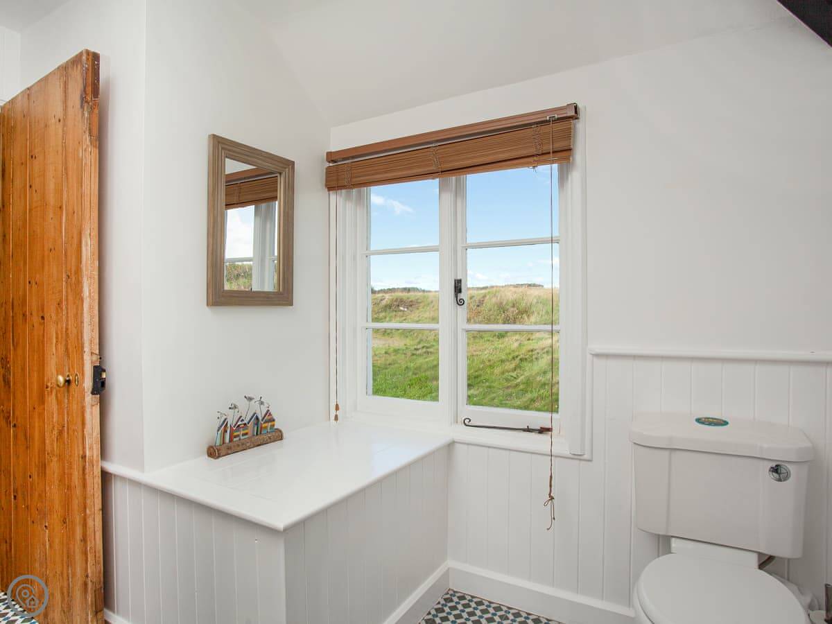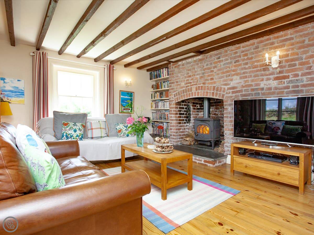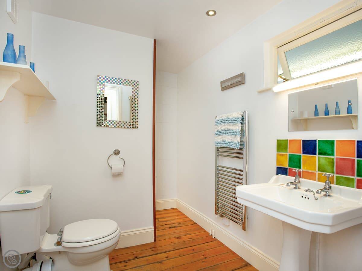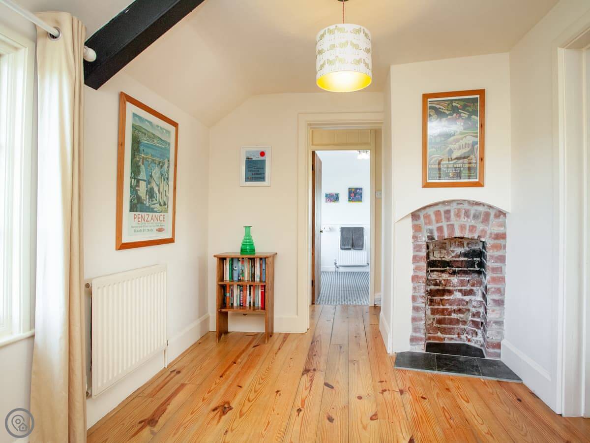 Inside, it's been done up. It's comfortable, not just old. There are two living rooms, both have wood burners and books. Upstairs, the main bathroom has a bath and the ground floor one has a walk-in shower.
