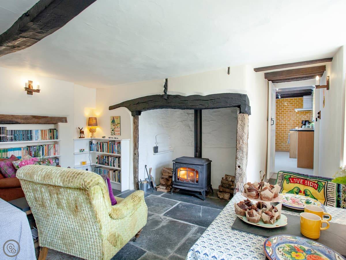A couple of quirks. The main room has flagstone floors and a big old fireplace with an electric stove in it. There's a second little room off it with a sofa and books. The stairs up to the bedroom are wooden and quite steep, typical for an old place.