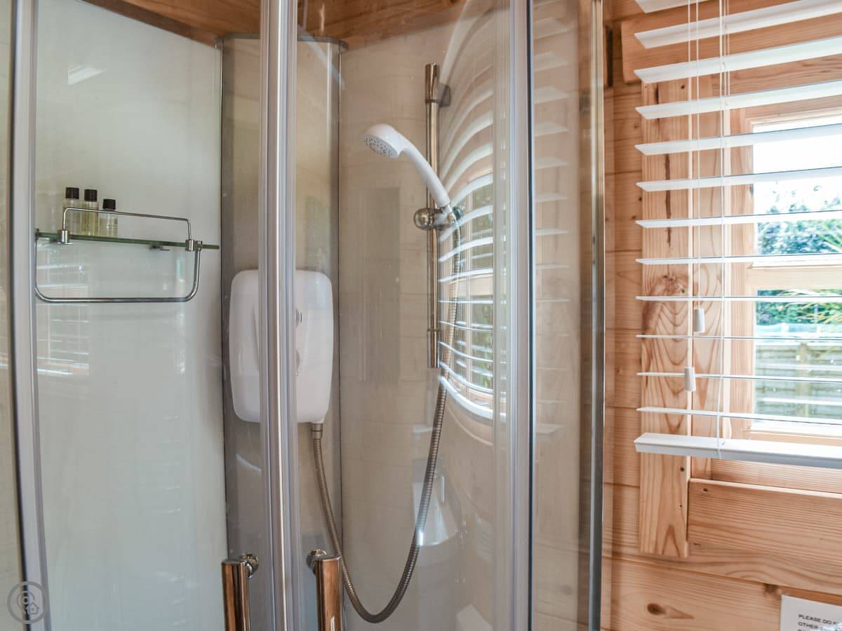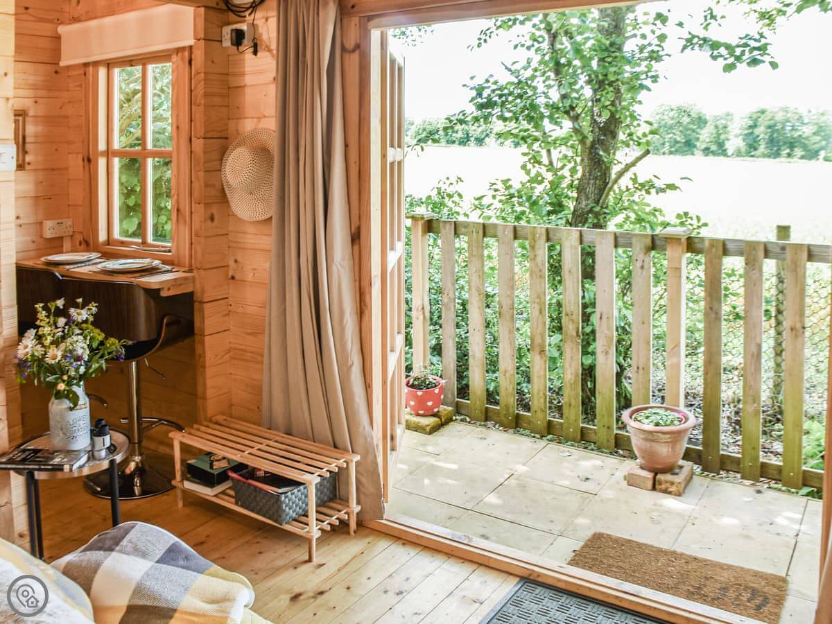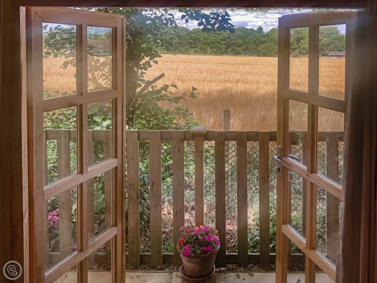 It sleeps two. One bedroom with a double bed, one bathroom with a shower. It's a 4 Star place, so it's got everything you need and it's in good order. You look out over open fields. There's no light pollution, so the stars are very clear on a good night.