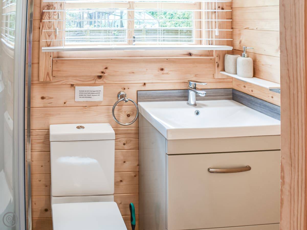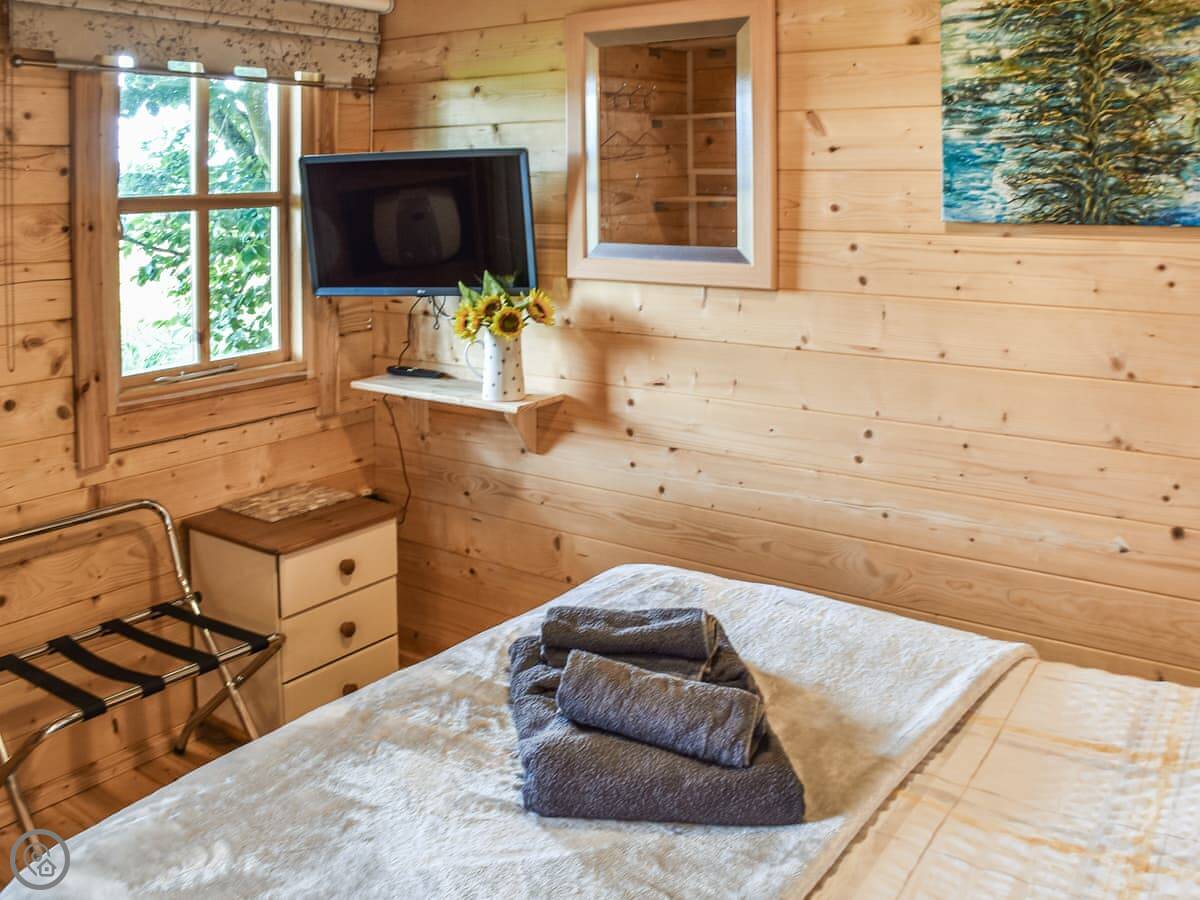 There's a fenced-off private area around the lodge with a gate, so it's secluded. You've got a bit of lawn and a bistro table and chairs outside. Inside, it's open plan with a small kitchen and a breakfast bar. There's a smart TV you can watch from the sofa or the bed. WiFi is included.