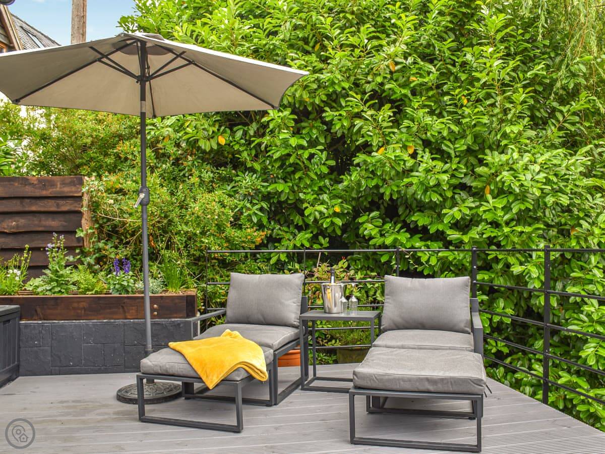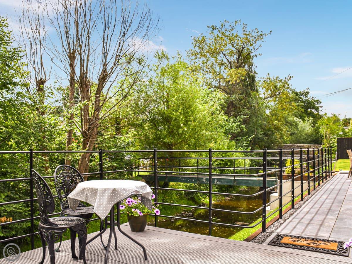 The patio is private. It looks right over the brook. You're in our garden, but it feels separate. It's quiet here. The village has a shop and a pub, both a short walk away.