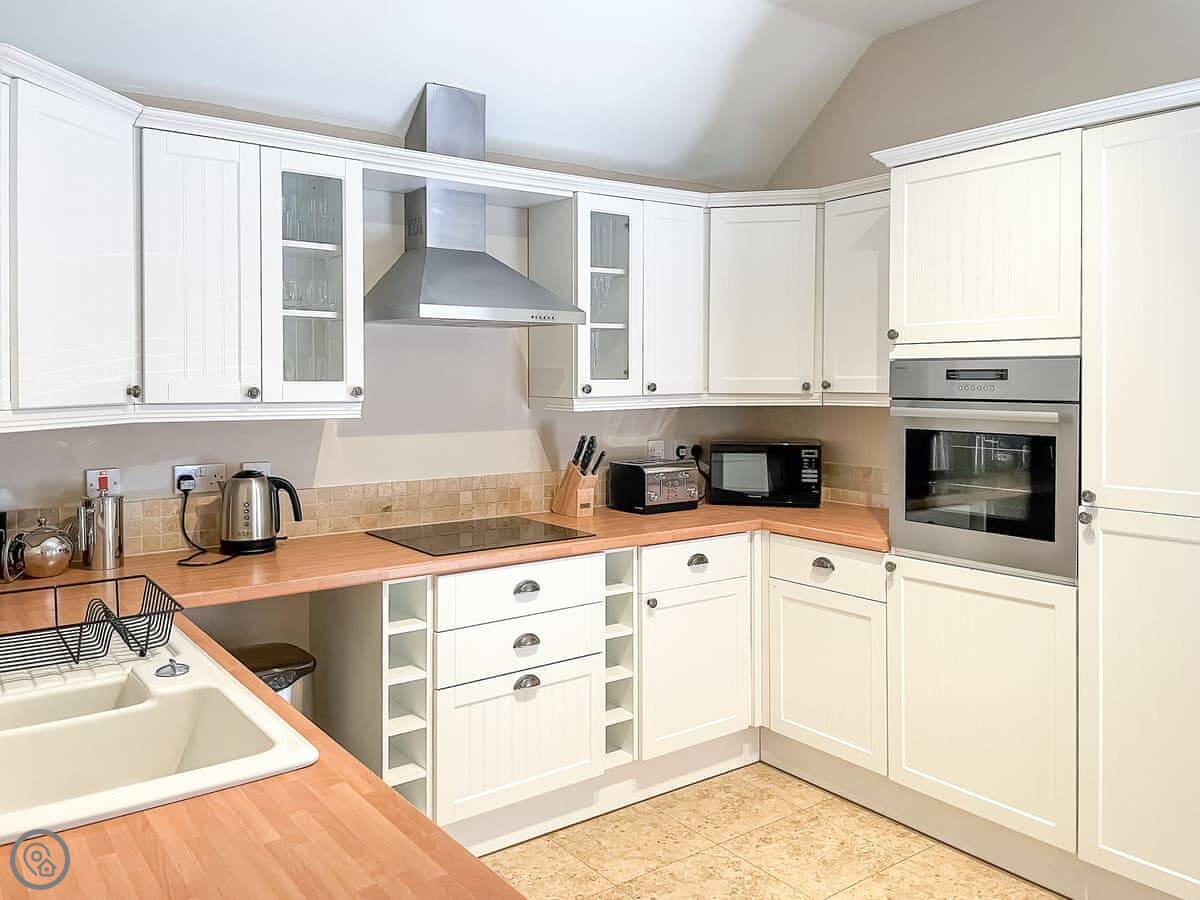 The facilities are all here. There's a woodburning stove, a dishwasher, a washing machine, and a TV. WiFi is included. Towels and bedding are provided. There's a hot tub in the back garden, and parking for two cars on the gravel drive. You can bring up to two dogs.