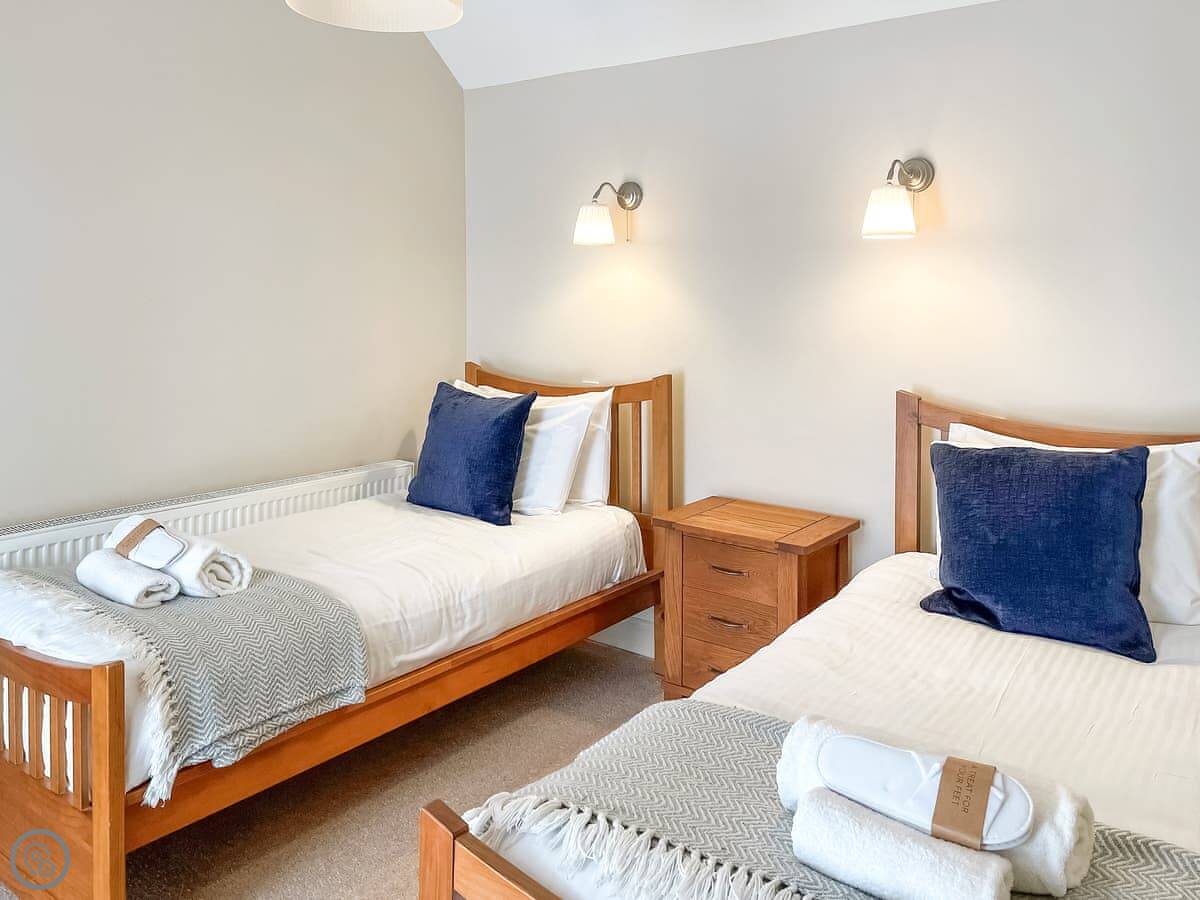 It sleeps four. There are two bedrooms, both doubles, and two bathrooms. One bathroom is en-suite to the main bedroom. It has a 5 Star rating, which means it's very comfortable and well-equipped.