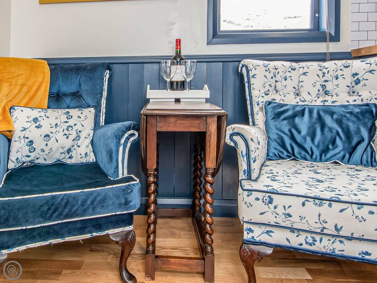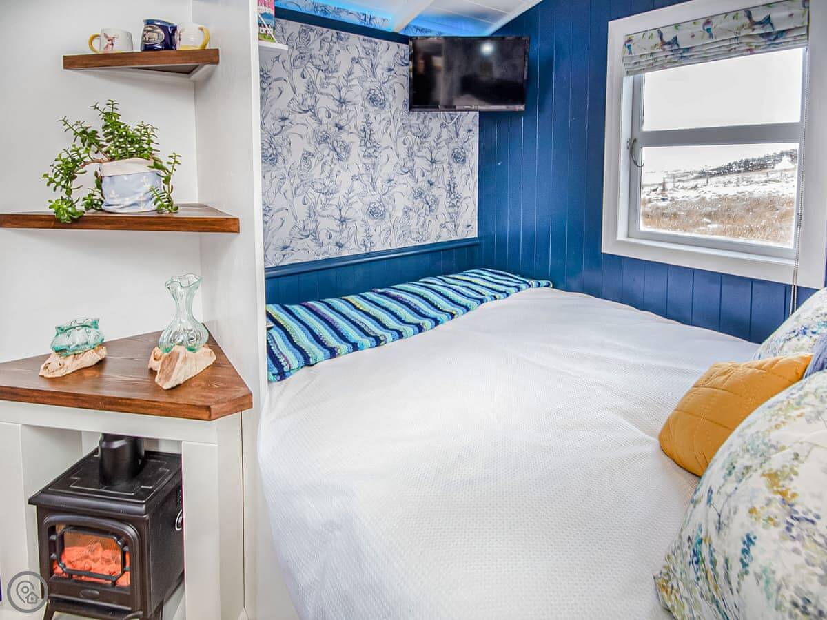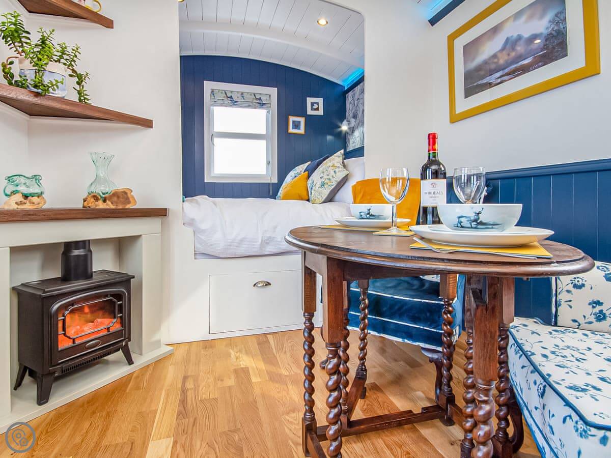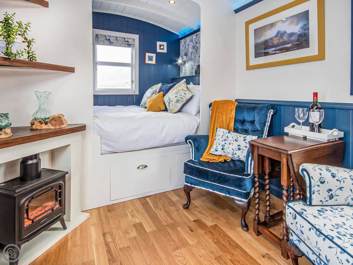 It sleeps two, in one bed that doubles as the sofa. There's a wood burner for heat and a wet room at the end. Everything you need is in here, it's just compact. It's got a 4 Star rating, which for a shepherd's hut means it's well-equipped and comfortable for what it is.