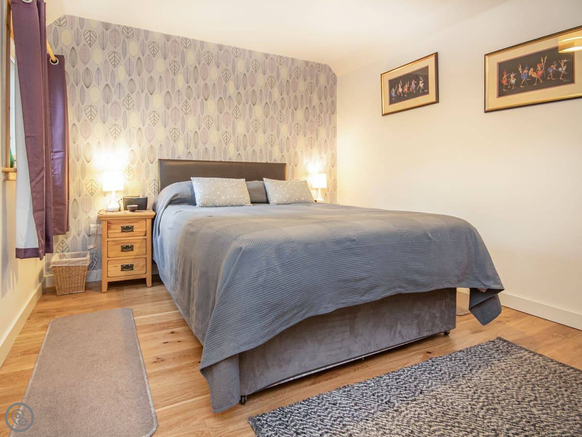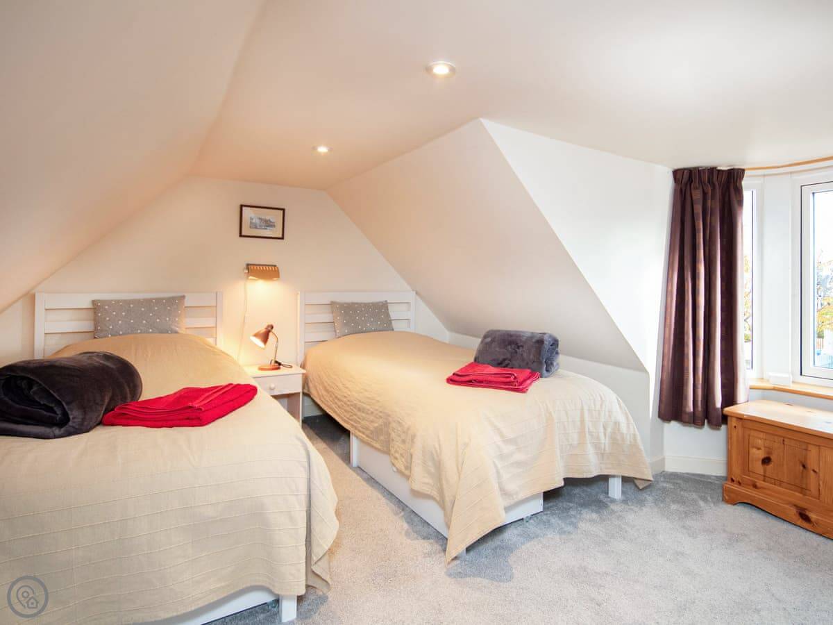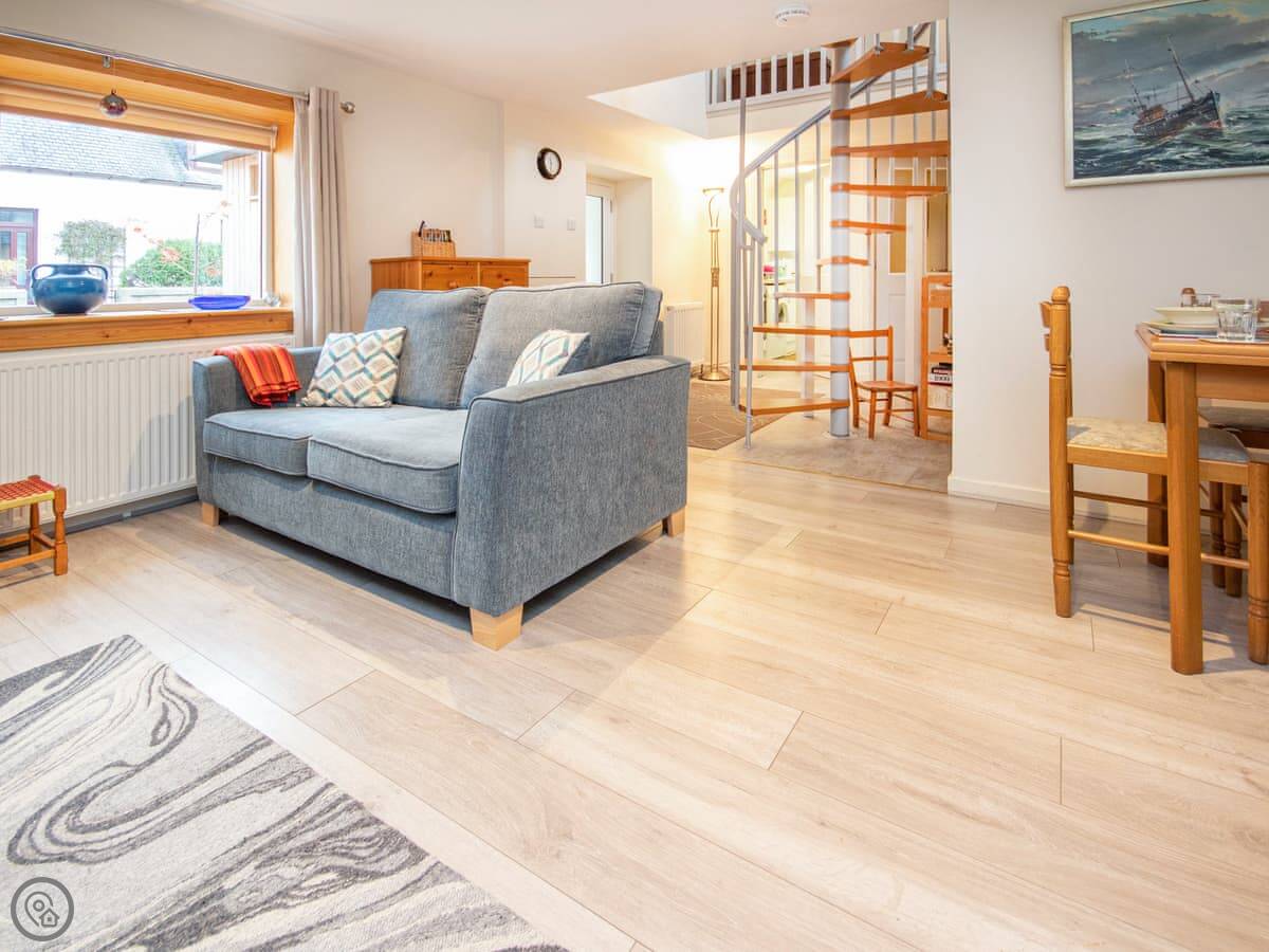 It's a four star place, sleeps four. Two bedrooms, one bathroom. There’s a double downstairs and twin beds upstairs. The stairs to get up there are a spiral staircase, and they are steep. The ceiling upstairs slopes too, so mind your head.