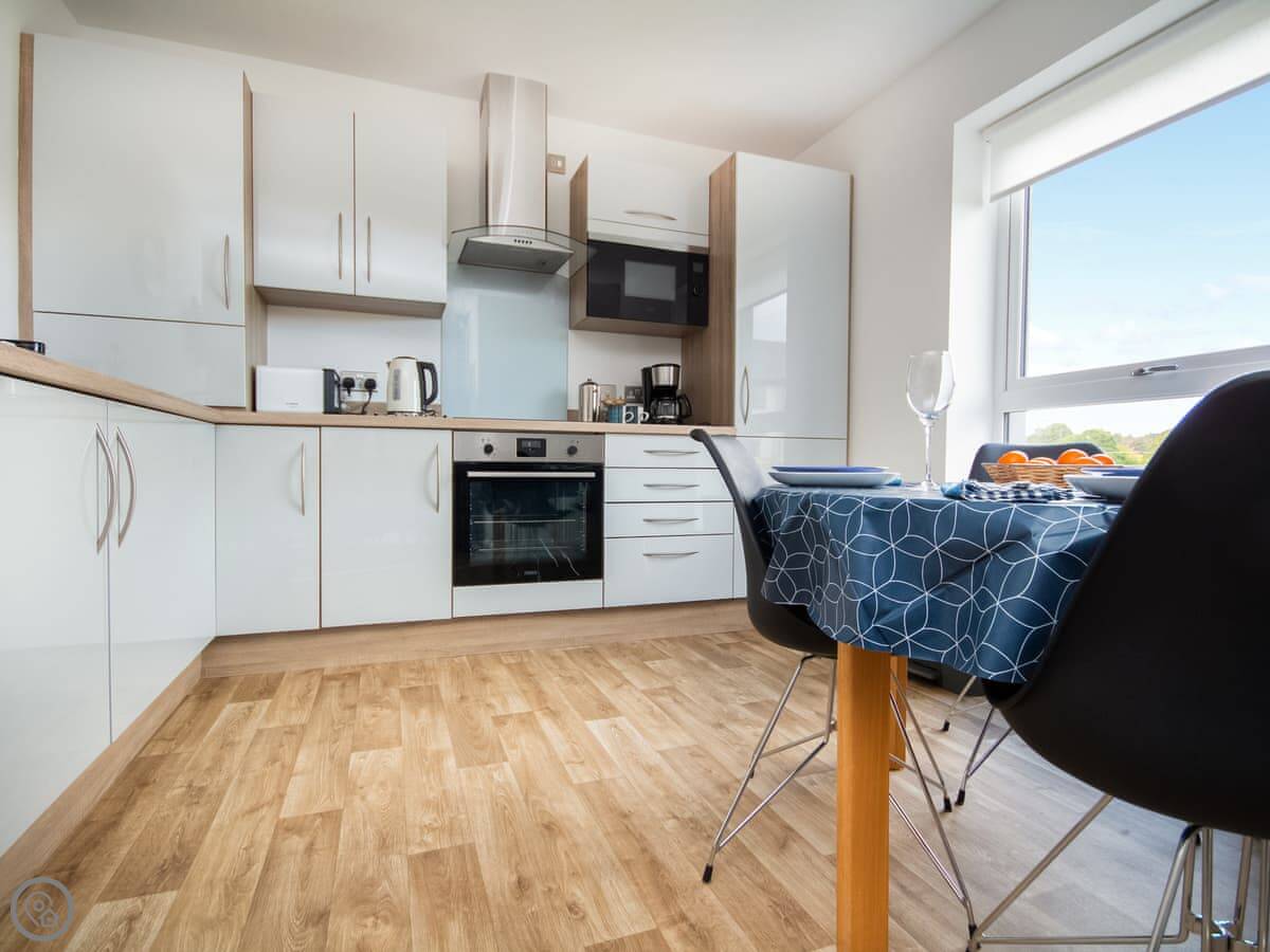 The main room is open plan. Living area, dining table, kitchen all together. It's got a washing machine, a dishwasher, WiFi, and a TV. There's parking right outside and a bit of garden to the side.