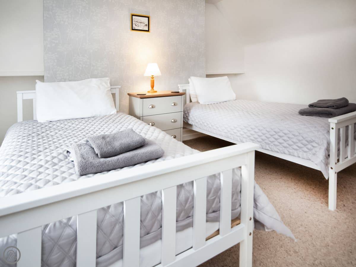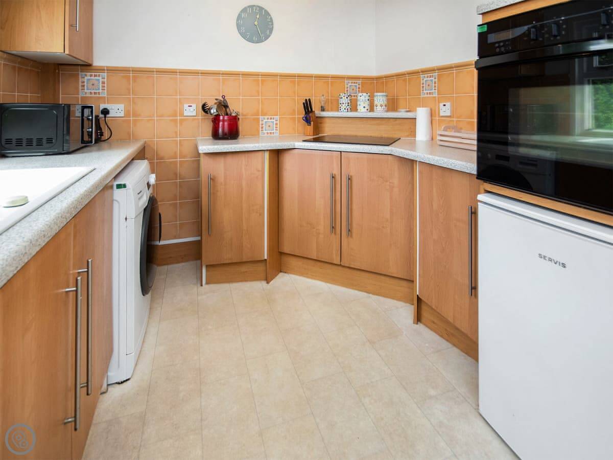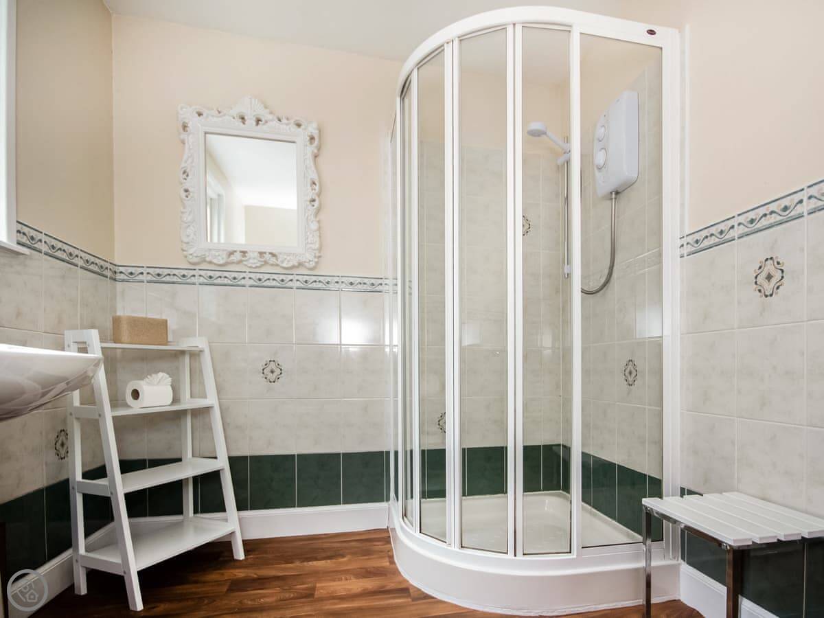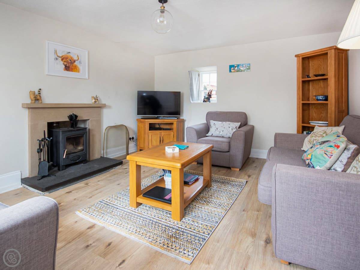 It sleeps four. Two bedrooms, one bathroom. It's got a 4 Star rating. It's warm and comfortable. The living area is all one room with a kitchen, a table, and a sofa by the wood burner. There's a shower, not a bath.
