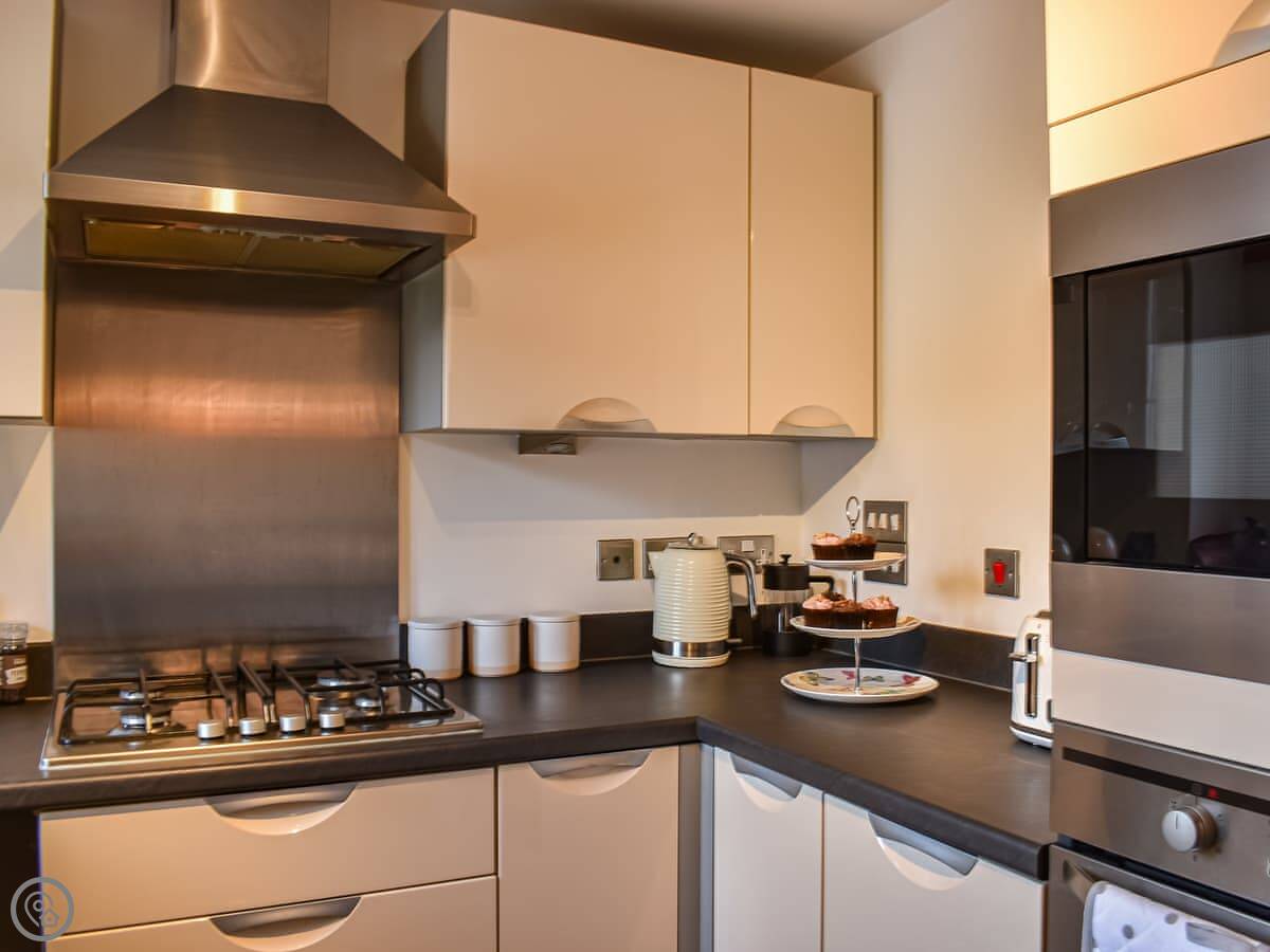 The place itself is open-plan. Kitchen, dining and living area all together. It's modern, clean and has everything you'd need, like a dishwasher and washing machine. There's a shared garden outside the building with some seating.