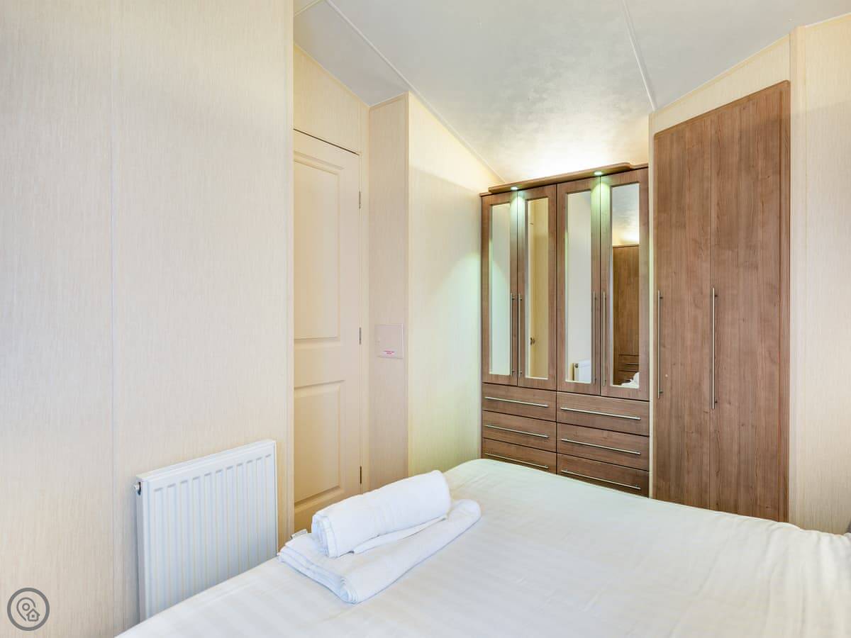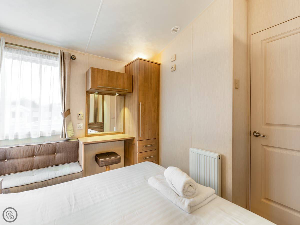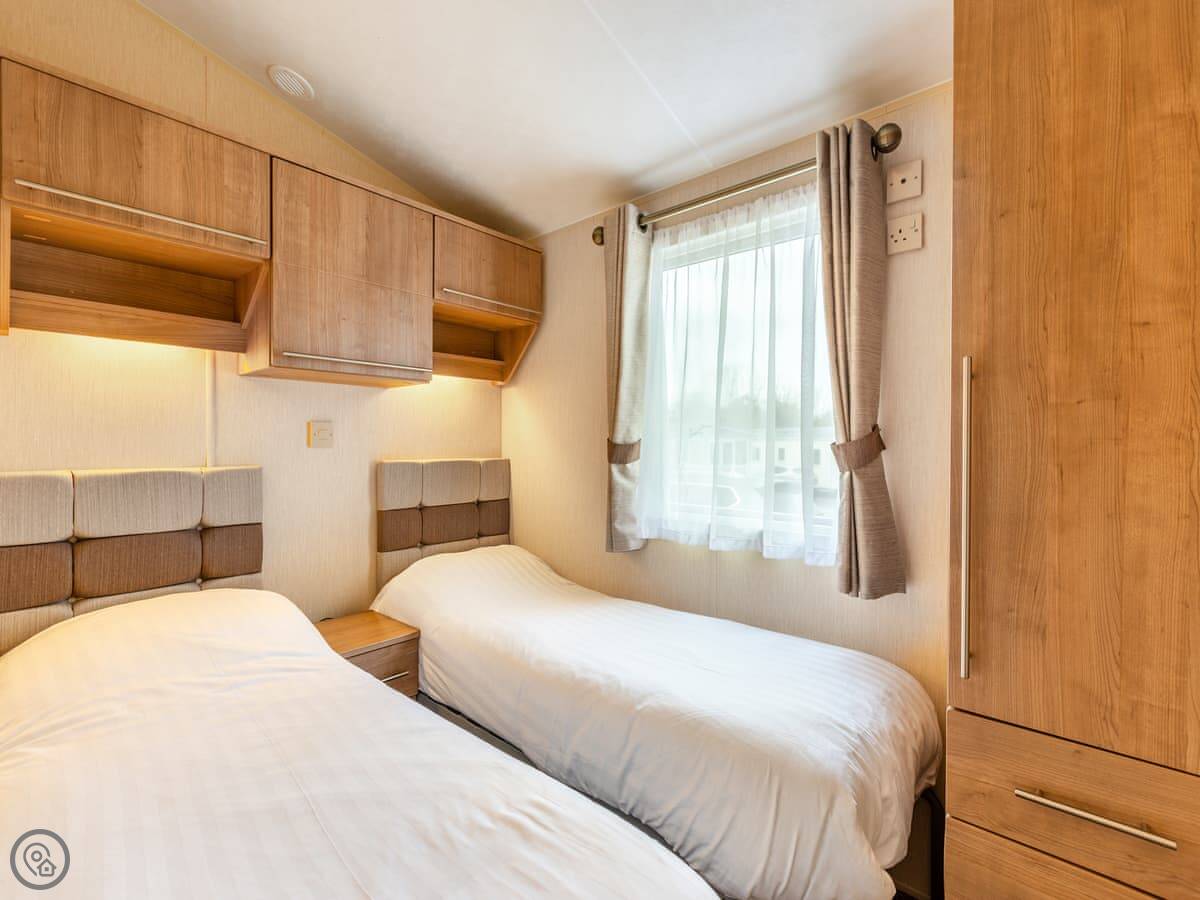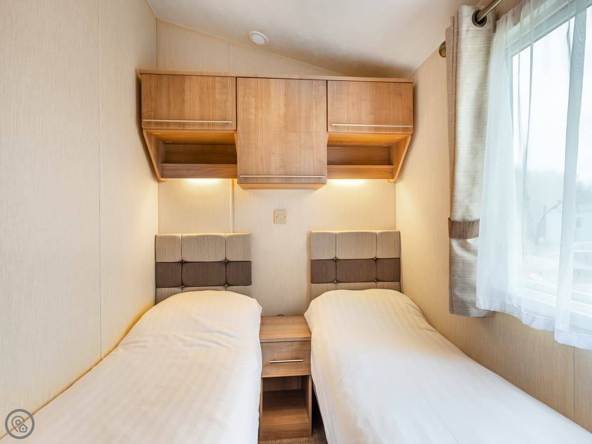 It sleeps four people. There's a double bed with its own small toilet next to it, and a separate twin room. There's a proper shower room too. The lounge has a smart TV and an electric fire. Parking for two cars right outside.