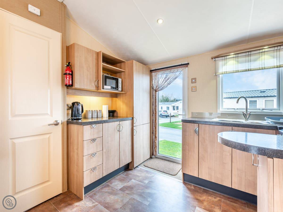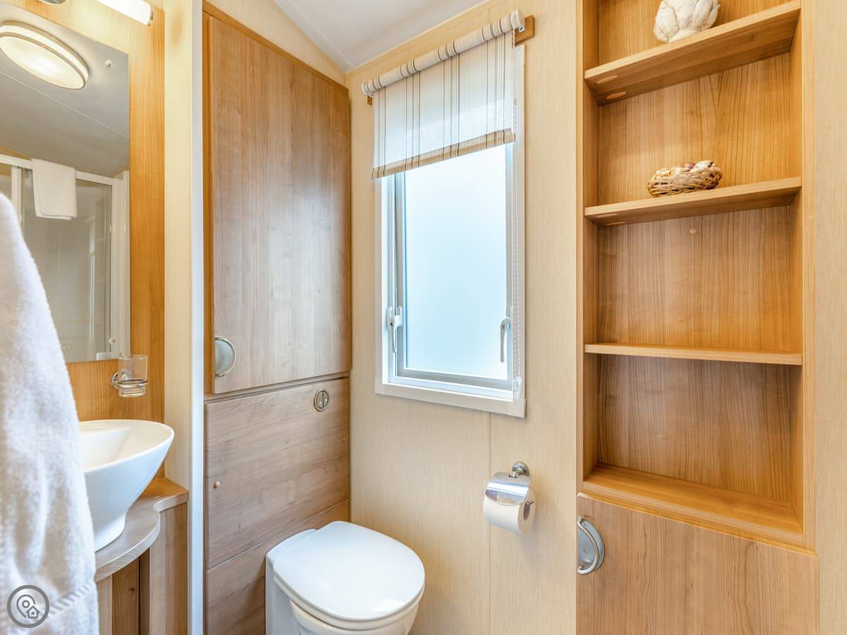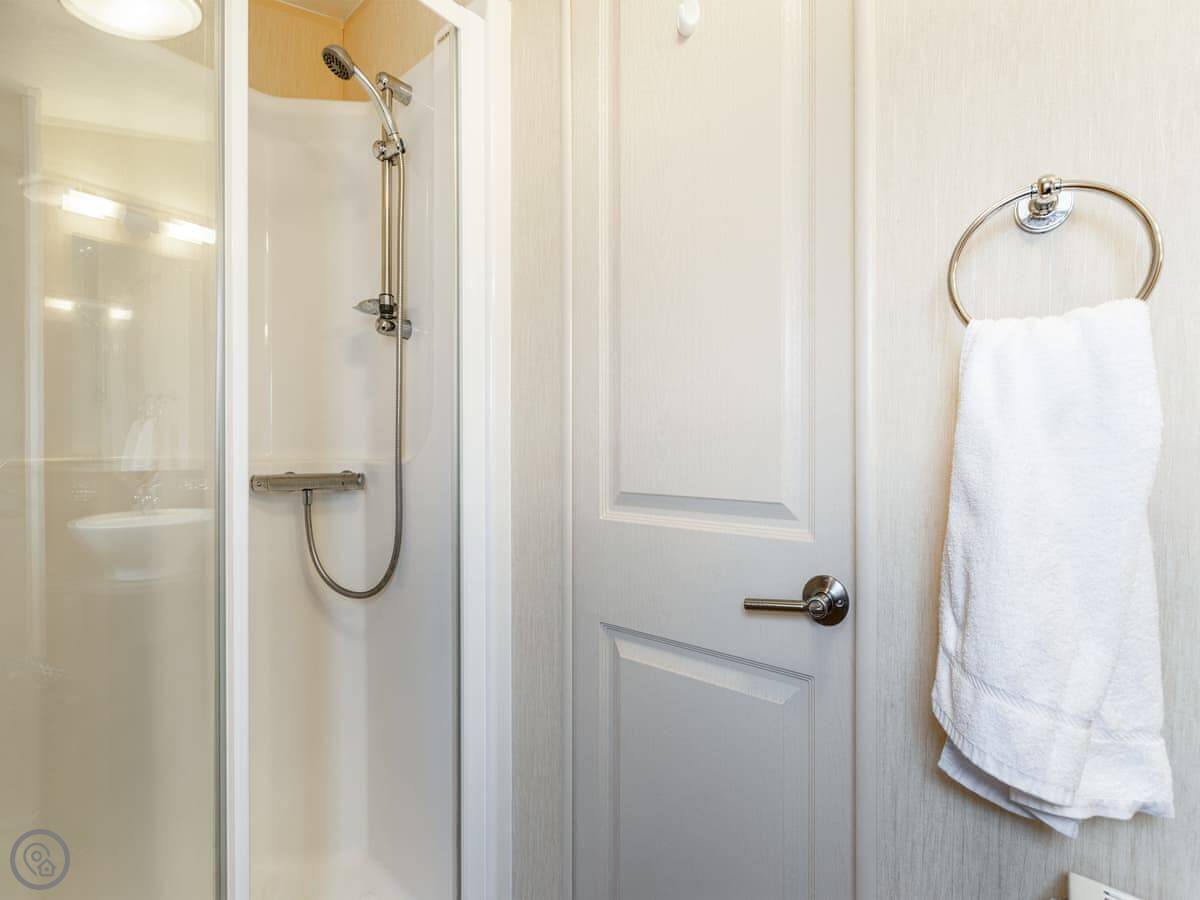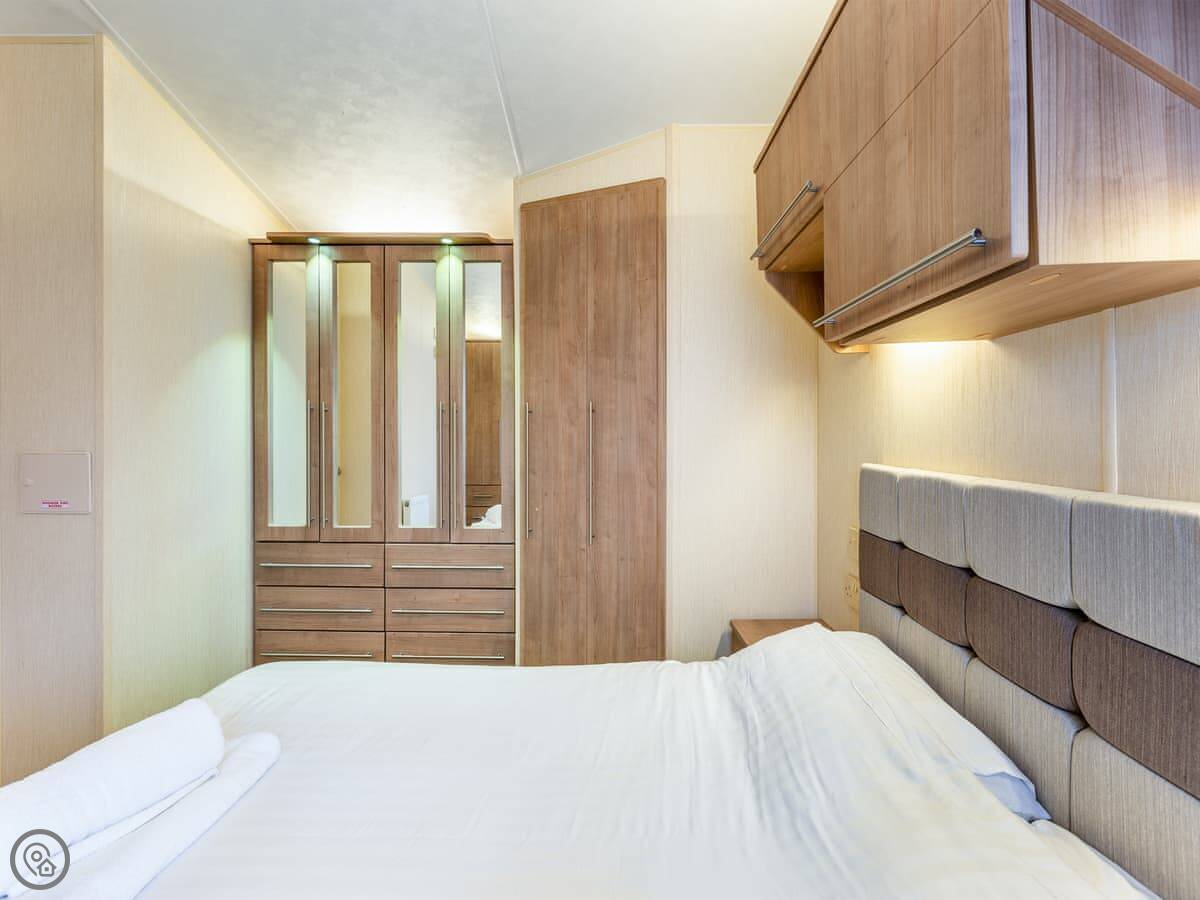 It sleeps four people. There's a double bed with its own small toilet next to it, and a separate twin room. There's a proper shower room too. The lounge has a smart TV and an electric fire. Parking for two cars right outside.
