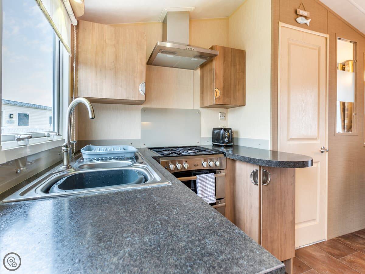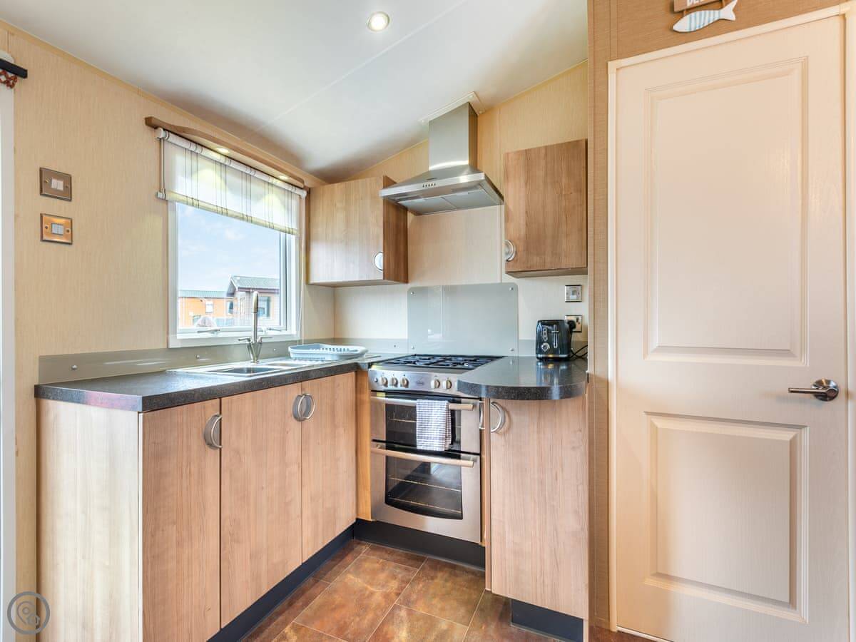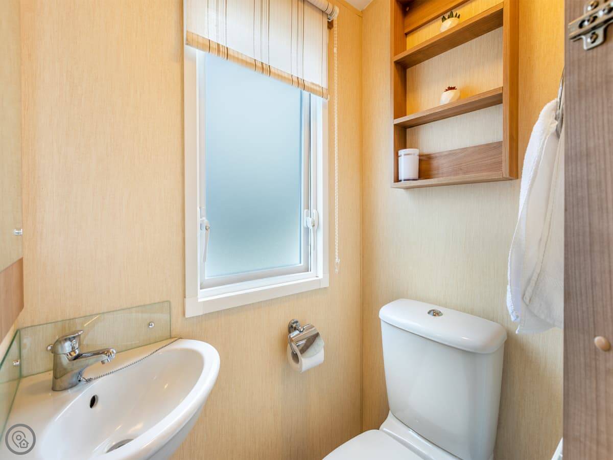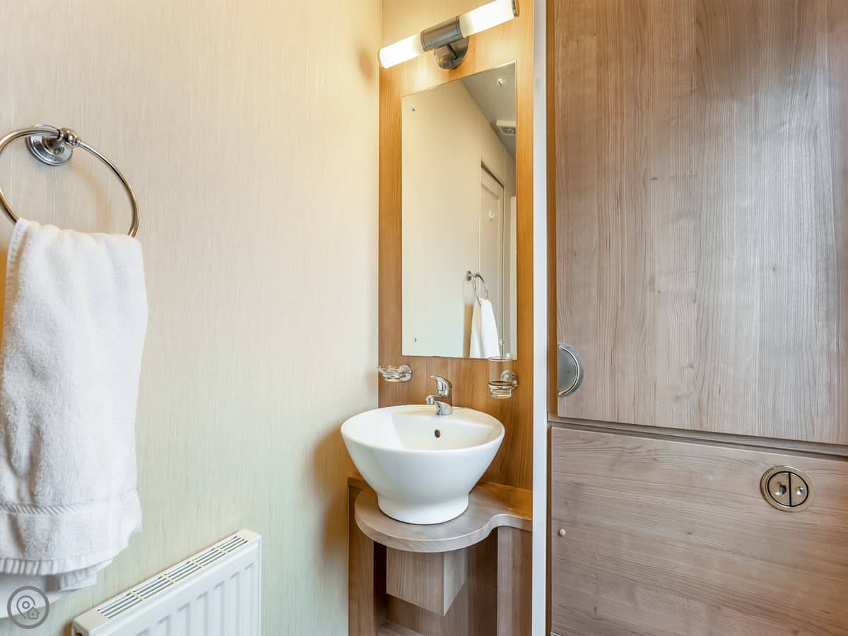 It sleeps four people. There's a double bed with its own small toilet next to it, and a separate twin room. There's a proper shower room too. The lounge has a smart TV and an electric fire. Parking for two cars right outside.