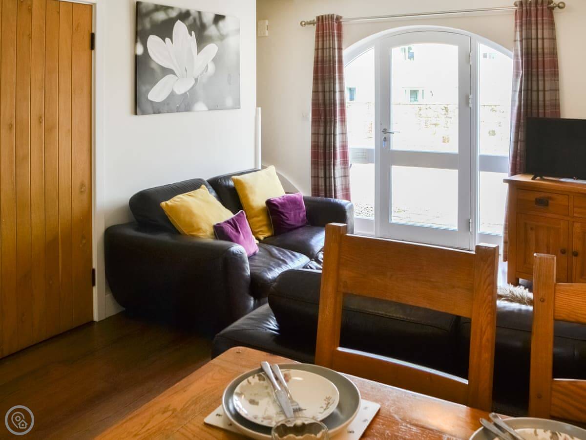It sleeps four. Two bedrooms, one bathroom. It's got a 4 Star rating, so it's comfortable and well-equipped. The main living area is open plan with a big arched window that lets in a lot of light.